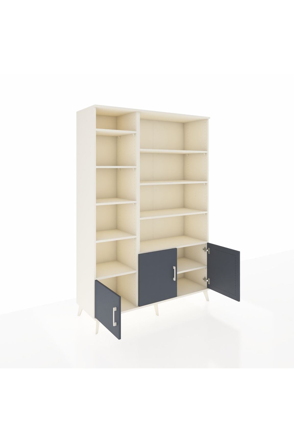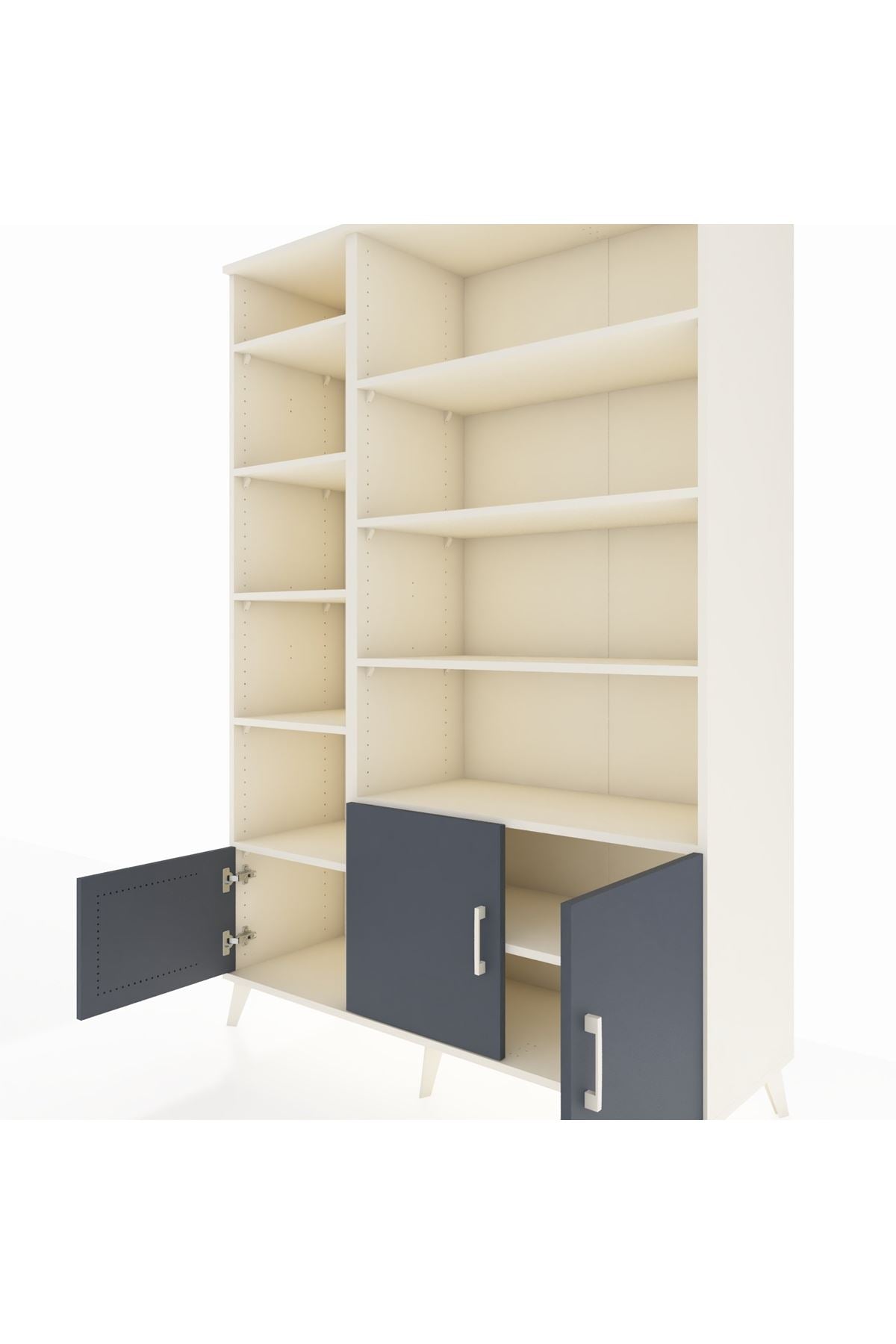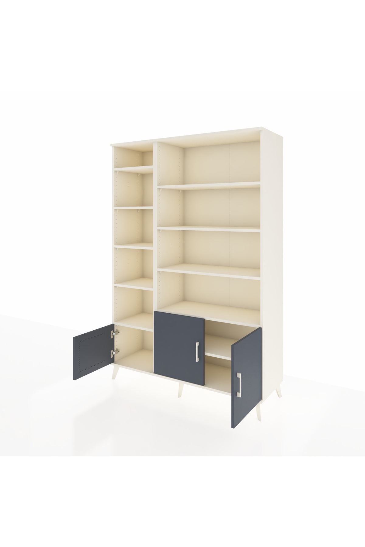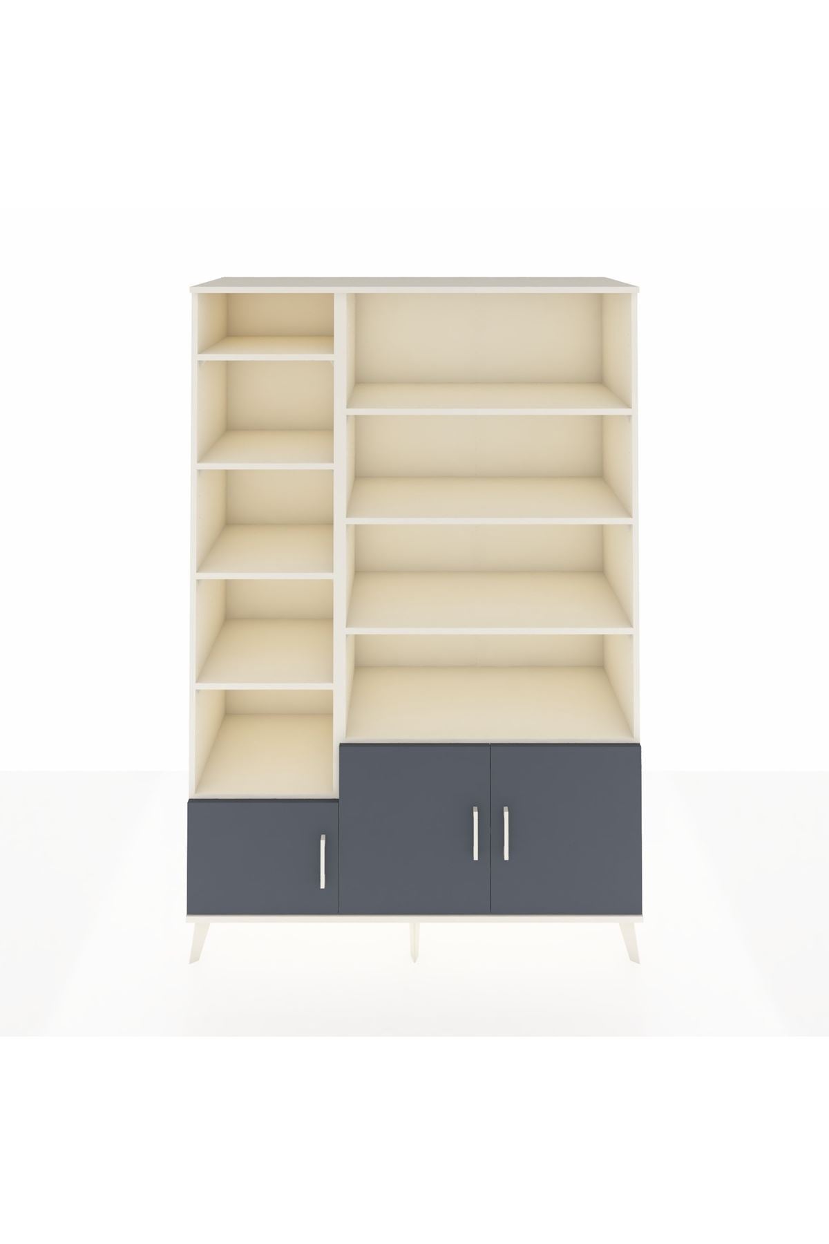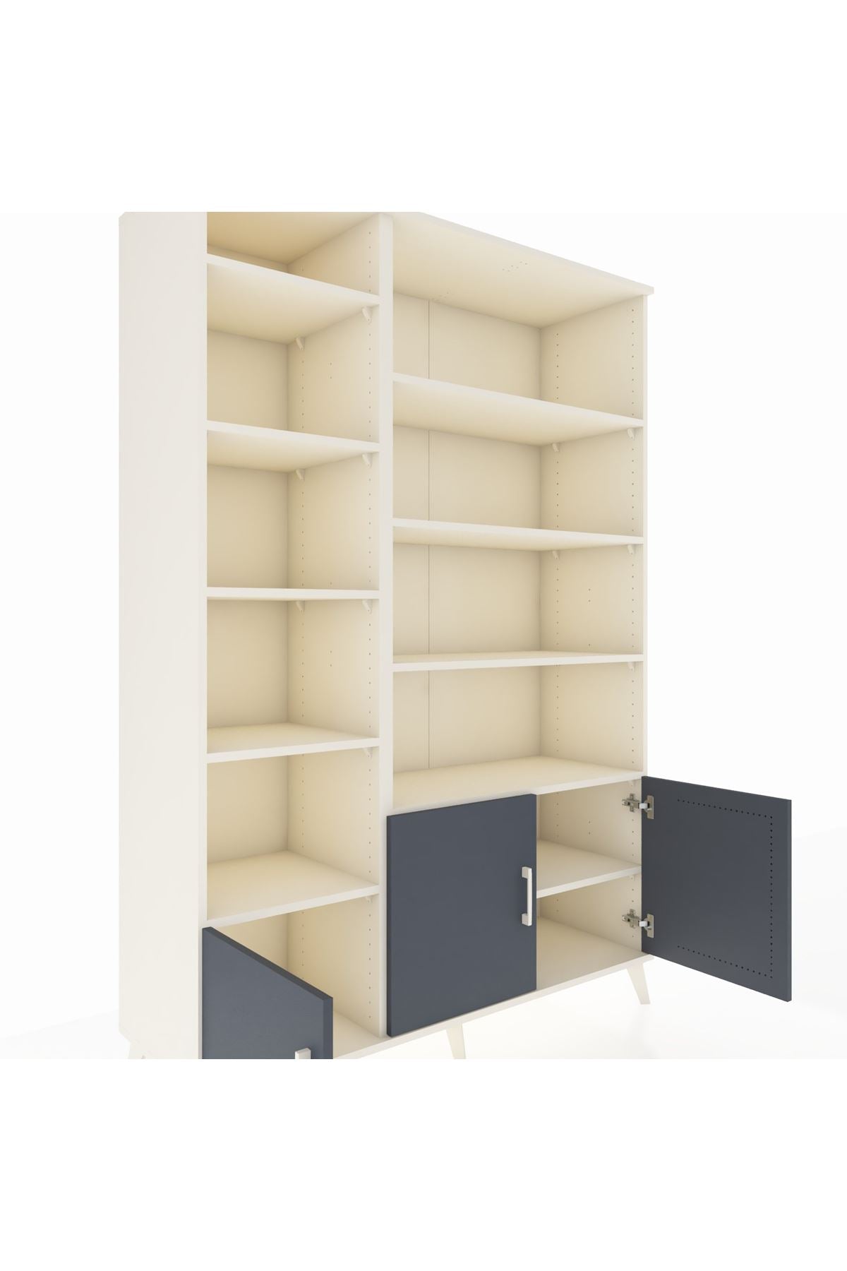 Çalışma odasında kitap, dosya ve ofis malzemelerini düzenlemek için ideal. Ayarlanabilir raflar sayesinde klasör yüksekliğine uygun yerleşim yapılabilir; kapaklı alt bölümler kablo, elektronik aksesuar ve özel evraklar için güvenli saklama sunar. Metal kulplar sık kullanımda bile konforlu erişim sağlar.