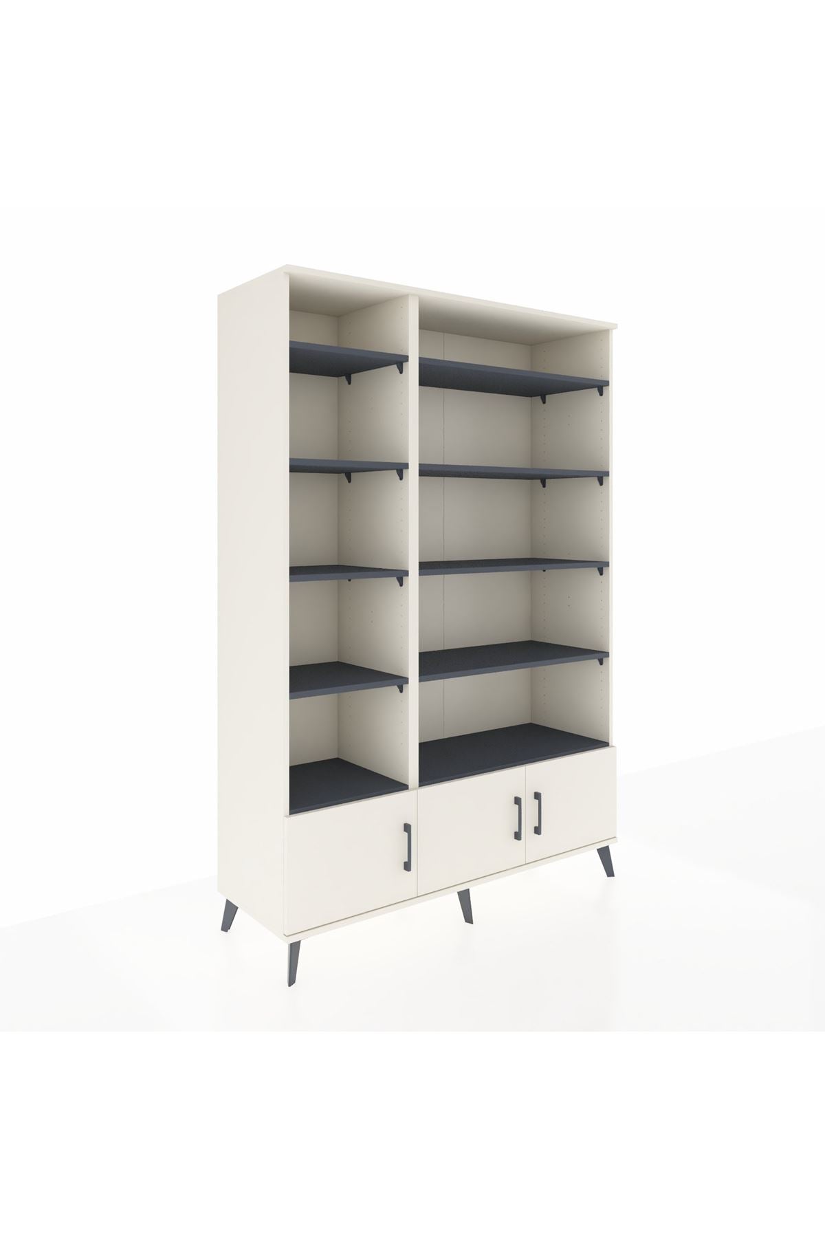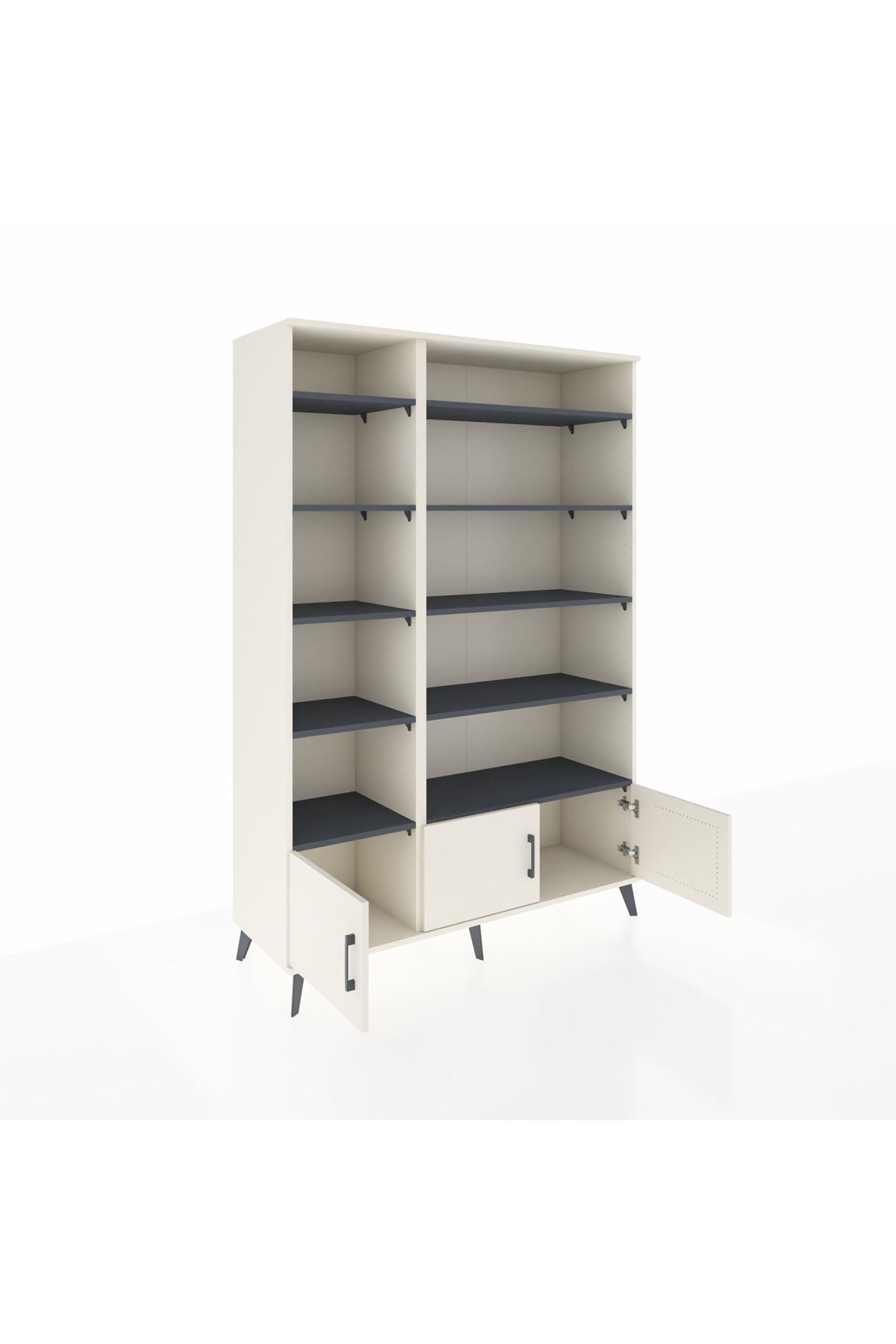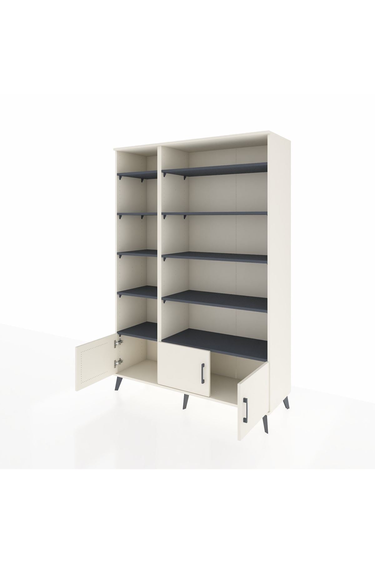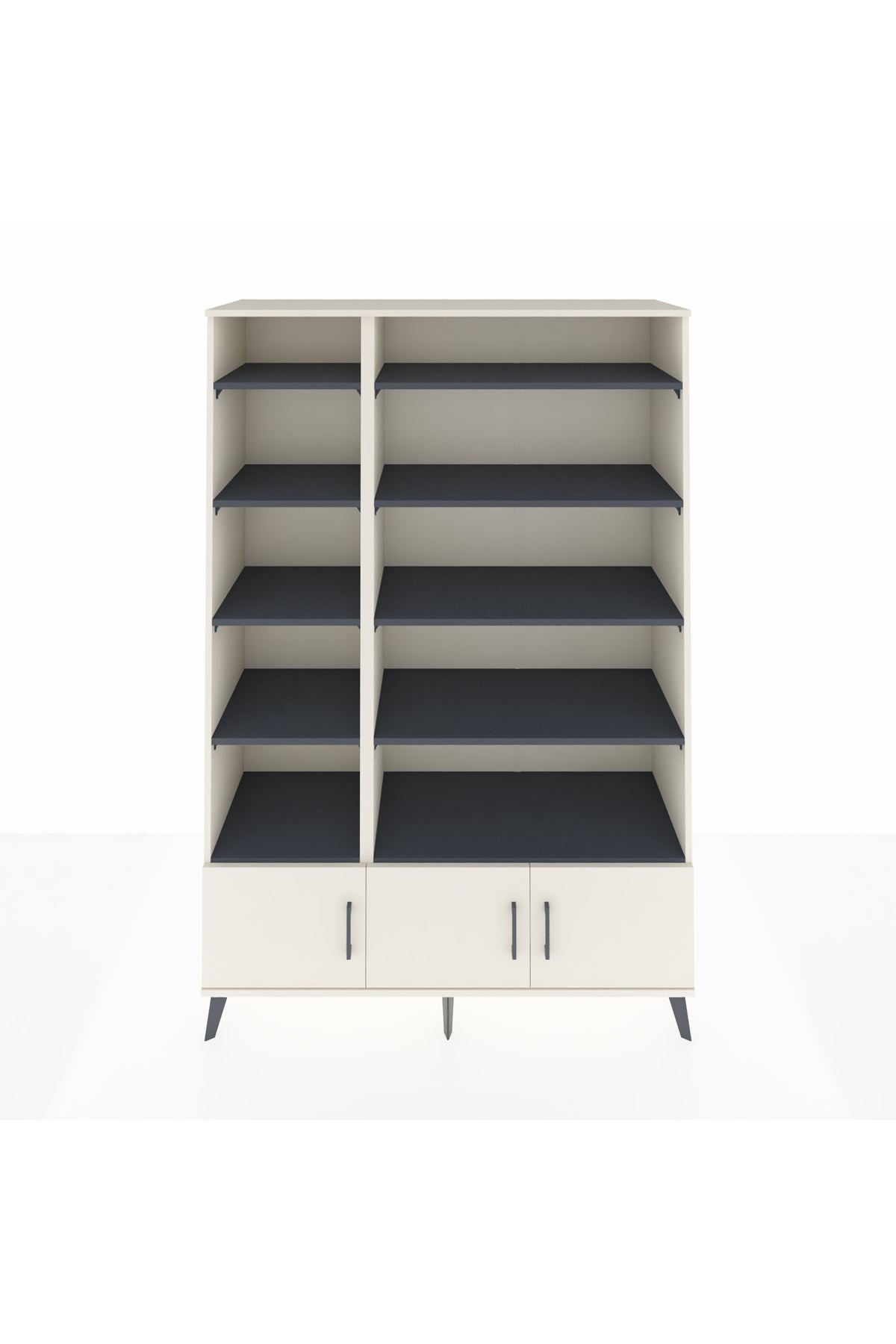 Geniş 10 raflı yapısı sayesinde kitaplar, dosyalar, kutular ve dekoratif objeler için sistemli saklama imkanı verir. Ayarlanabilir raflar farklı yüksekliklerde eşyaları destekleyerek esnek kullanım sunar. Alt bölümdeki 3 kapaklı bölme, görünmesini istemediğiniz eşyaları gizleyerek yaşam alanını ferah gösterir. Çekmece sayısı konfigüre edilebilir; ihtiyacınıza göre çekmece ekleyip çıkarabilirsiniz. Metal ayaklar zeminde stabilite sağlarken kolay temizlenebilir boşluk bırakır.
