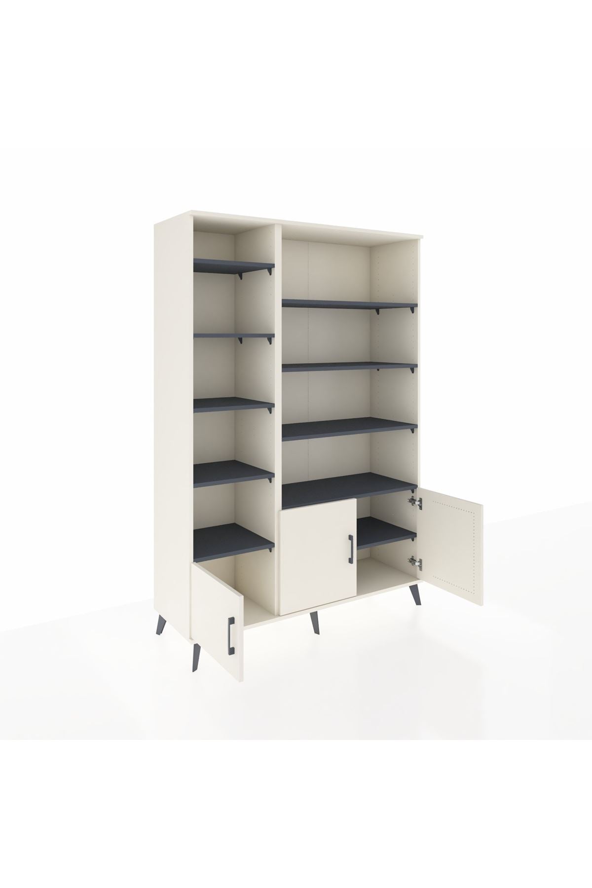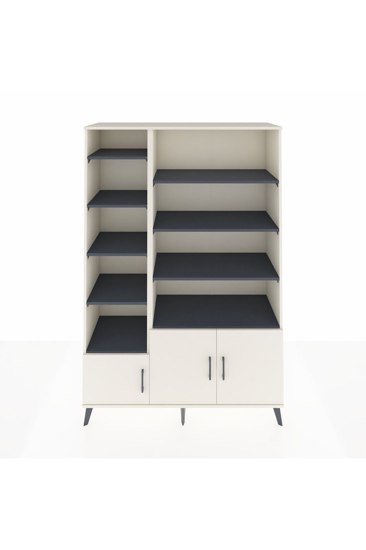 10 raflı tasarım, farklı yüksekliklerde yerleştirilebilen rafları sayesinde ayakkabı, kutu, tekstil ve evrak depolamada esneklik sağlar. Raflar ayarlanabilir olduğu için yüksek botlardan küçük aksesuar kutularına kadar farklı ebatlarla uyum sağlar. Alt bölümde yer alan 3 kapaklı dolap ve konfigüre edilebilen çekmece seçenekleri ile görünür ve gizli depolama ayrımı yapabilirsiniz. Metal ayaklar taşıma kapasitesini artırırken temizlik ve yer süpürme işlemlerini kolaylaştırır.