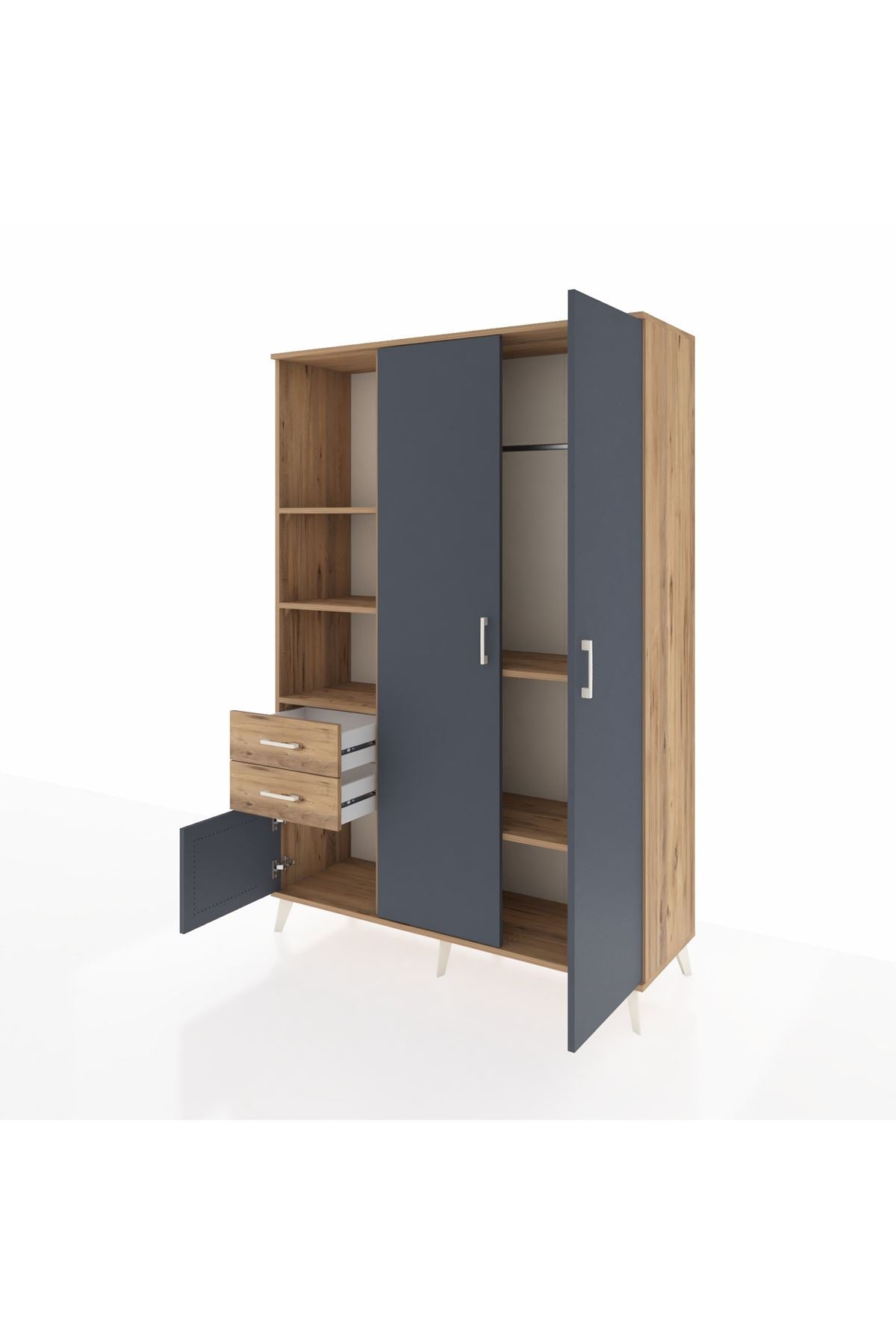 Bu dolap, yaşam alanlarında düzen ve estetik bir bütünlük sağlar. Antrasit kapakları ile çam dokulu gövdesi arasında modern ve sıcak bir kontrast bulunur; sade hatları farklı dekorasyonlara kolayca uyum sağlar. Metal ayakları zemine güvenle oturur, metal kulplar ise uzun ömürlü ve ergonomik çekmece / kapak kullanımı sunar. İç kısımda beş adet raf ve tek askılı bölüm ile hem katlanmış hem de asılı kıyafetleri düzenler; raf yüksekliği isteğe göre ayarlanabilir, çekmece sayısı konfigüre edilebilir.