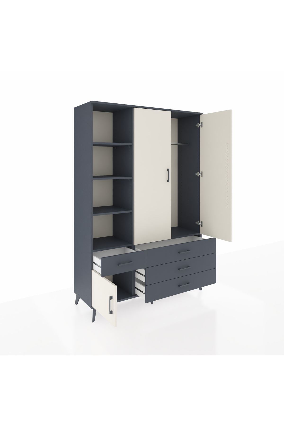 Geniş iç hacmiyle kıyafet, aksesuar ve ev eşyalarını düzenli şekilde saklama imkanı verir. 5 raf ayarlanabilir olduğundan farklı yüksekliklerde kitap, kutu veya dekoratif objeler için uygun depolama oluşturabilirsiniz. Tek askılık bölmesi ceketsiz ve elbiseler için ideal uzunluk sağlar. Çekmeceler konfigüre edilebilir yapısıyla kullanım ihtiyacınıza göre artırılıp azaltılabilir; derin çekmeceler çamaşır ve tekstil saklama, küçük çekmeceler ise ofis malzemeleri veya kişisel eşyalar için idealdir. Dayanıklı suntalam yüzey kolay temizlenir ve günlük kullanıma uygundur.