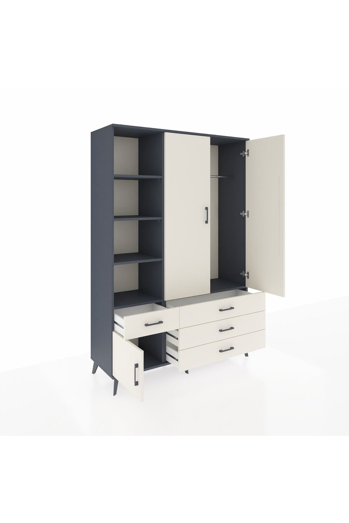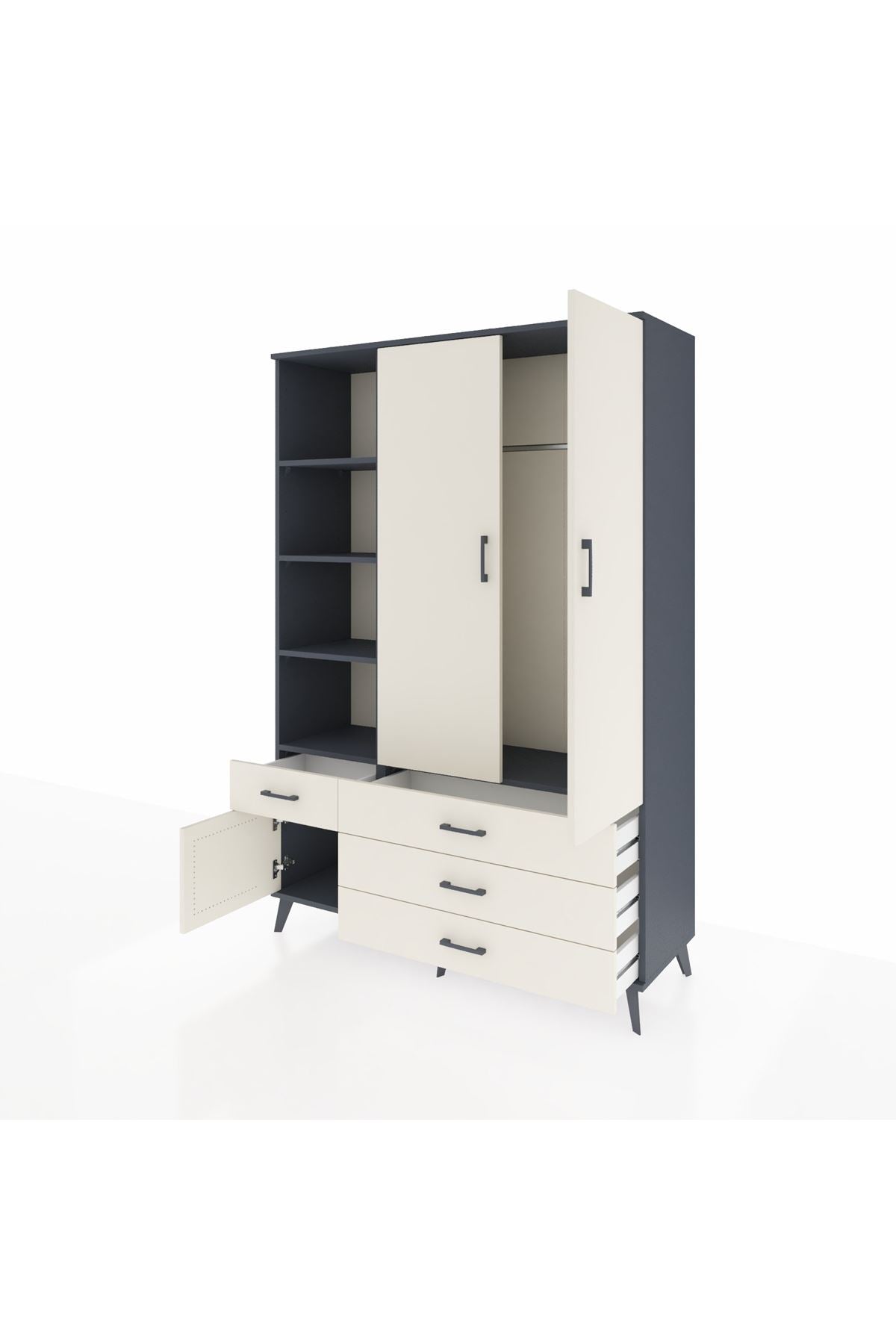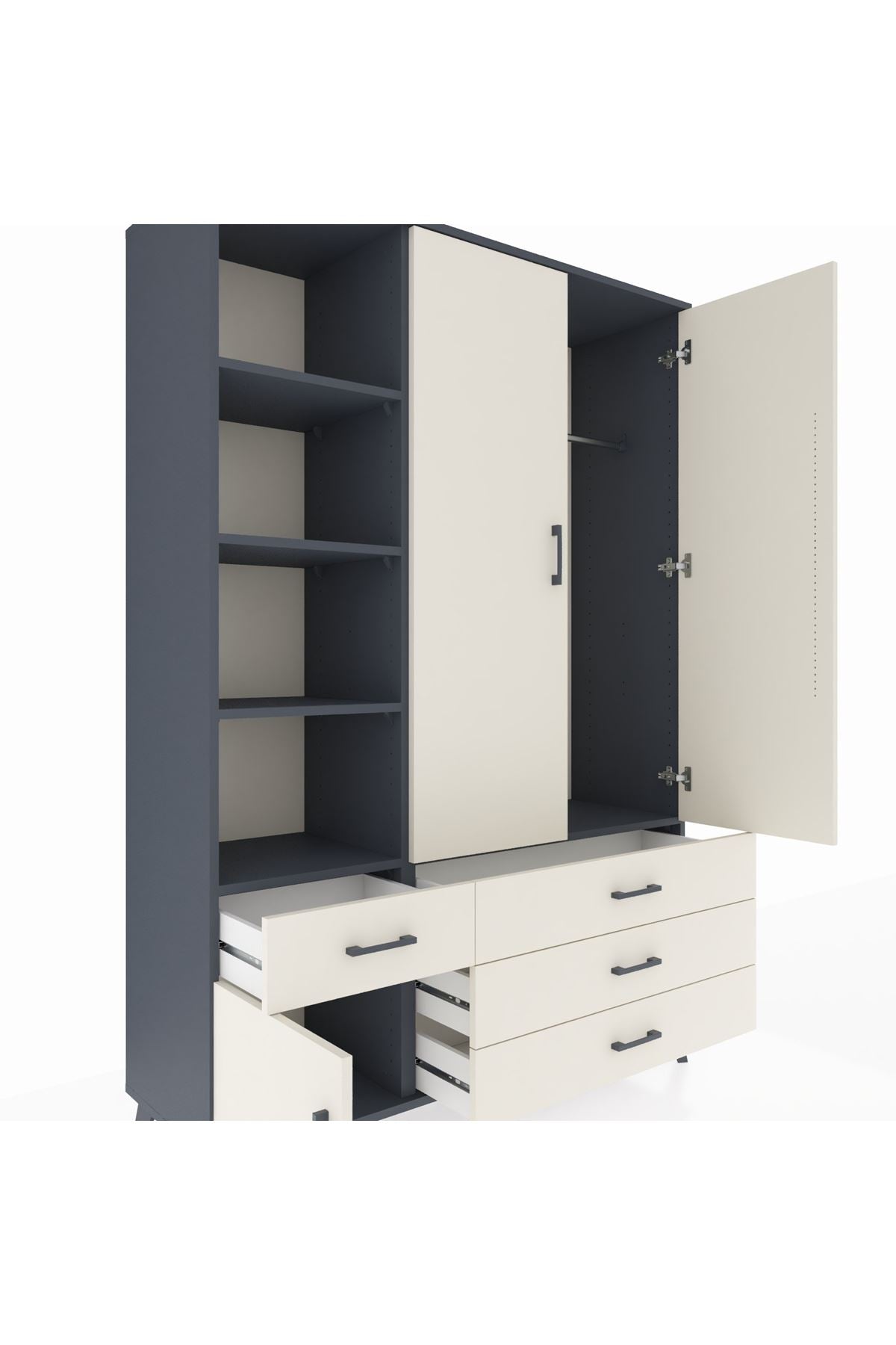 Bu dolap, yaşam alanlarında maksimum depolama ve düzen sağlar. Aytaşı ve antrasit uyumu modern ve sade bir estetik sunar; atlas çam seçeneği ise sıcak bir doğal dokunuş getirir. Metal ayakları mobilyayı zeminden kaldırarak nemden korur ve uzun yıllar sağlam kullanım garantiler; metal kulplar ise günlük açıp kapamalarda konfor sağlayacak dayanıklılıktadır. Raflar ayarlanabilir yapısıyla farklı yüksekliklerde eşyalarınızı rahatça saklamaya uygundur. Çekmece sayısı konfigüre edilebilir özellik sayesinde ihtiyaçlarınıza göre 4 çekmeceyi farklı kombinasyonlarda düzenleyebilirsiniz.