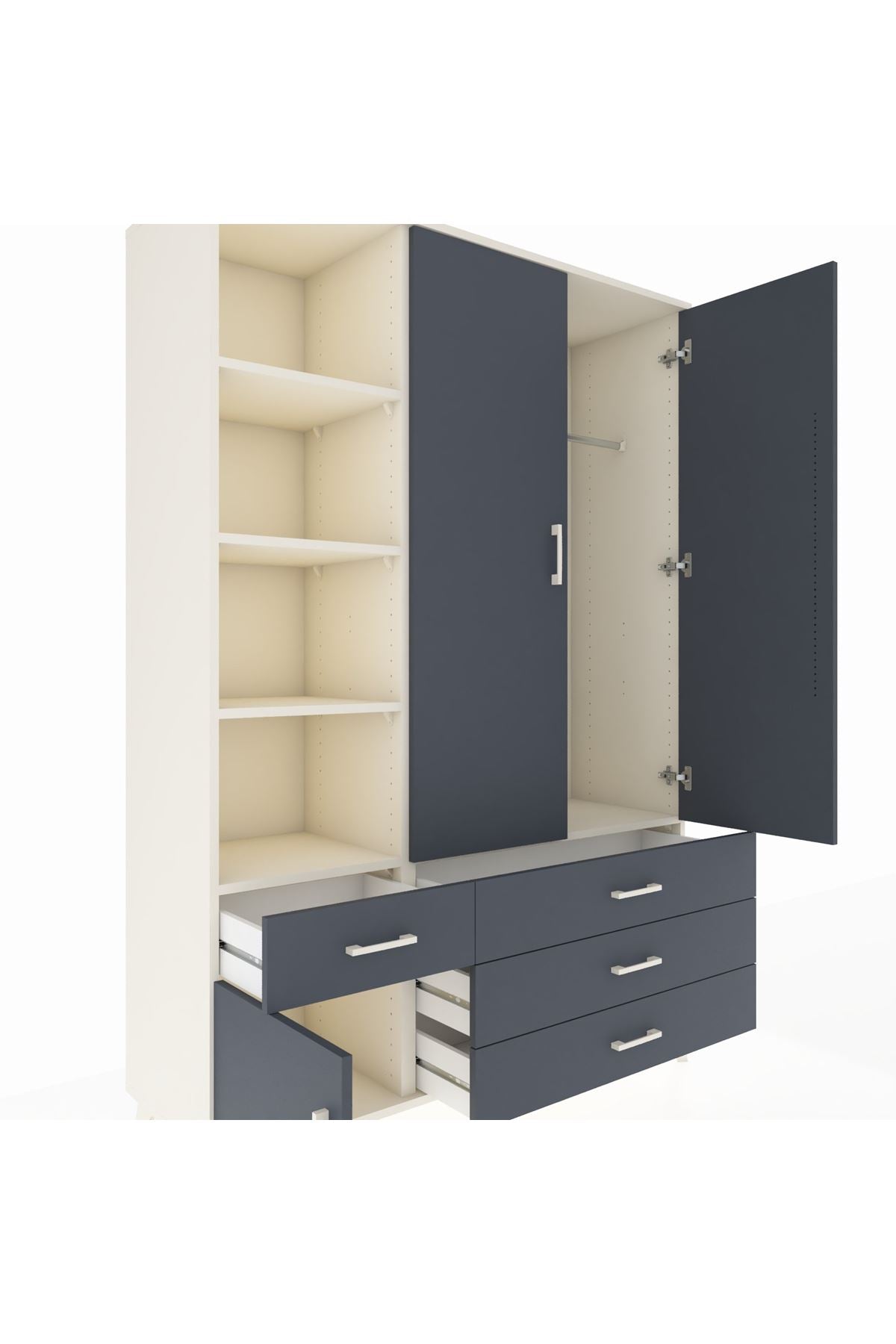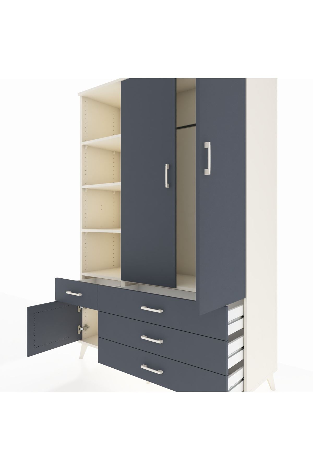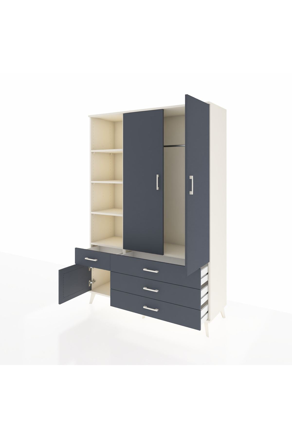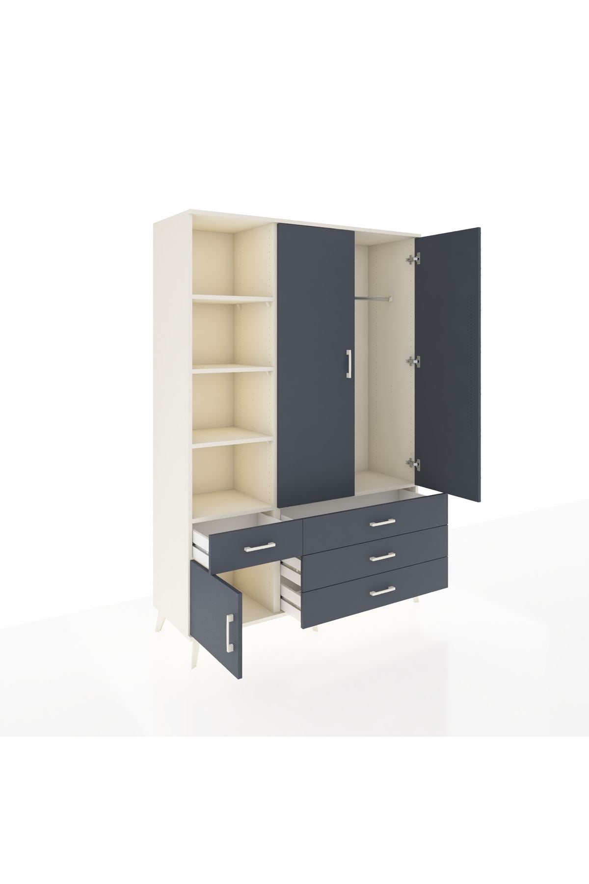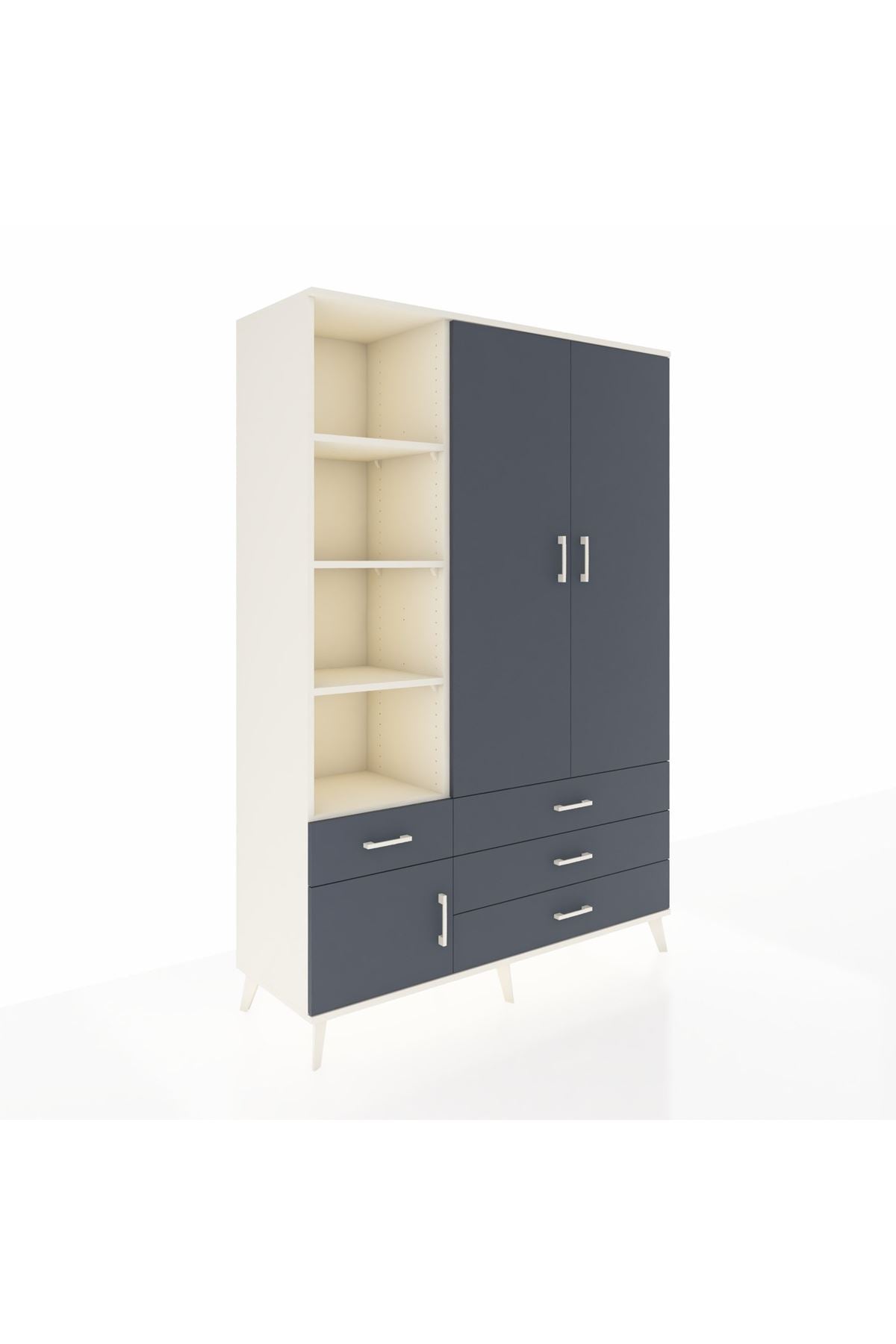 Çocuk odasında kıyafet, oyuncak ve okul malzemelerinin düzenlenmesine uygun tasarlanmıştır. Ayarlanabilir raflar çocuk büyüdükçe depolama düzeninin değişmesine imkan verir. Çekmece konfigürasyonu ile küçük eşyalar ayrıştırılabilir; sağlam metal donanımlar aktif kullanım ve sık açılıp kapanma için dayanıklıdır.