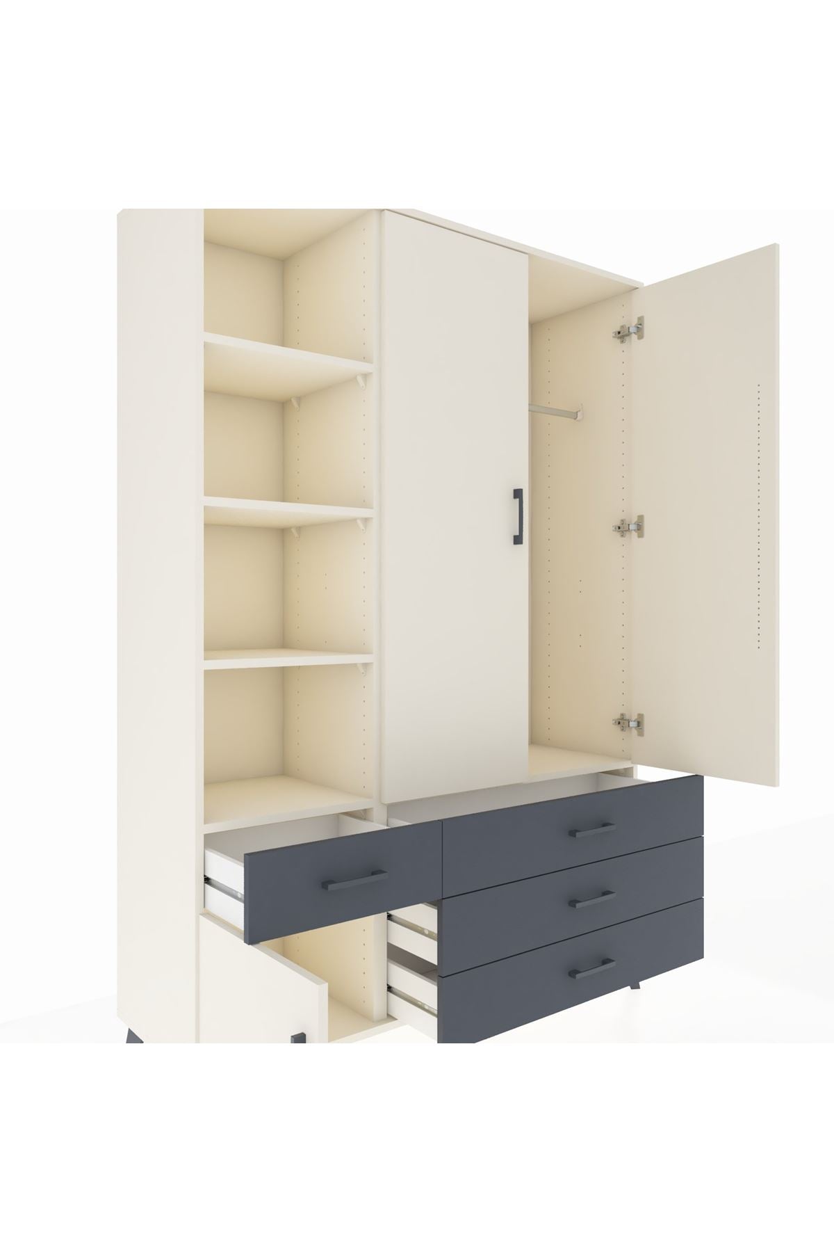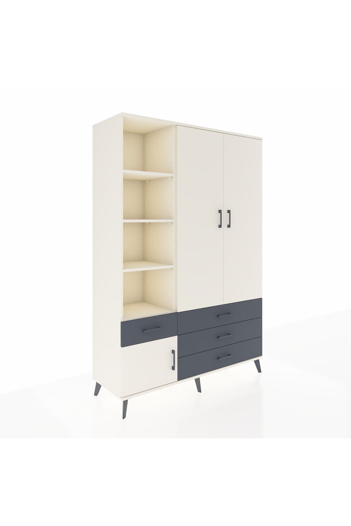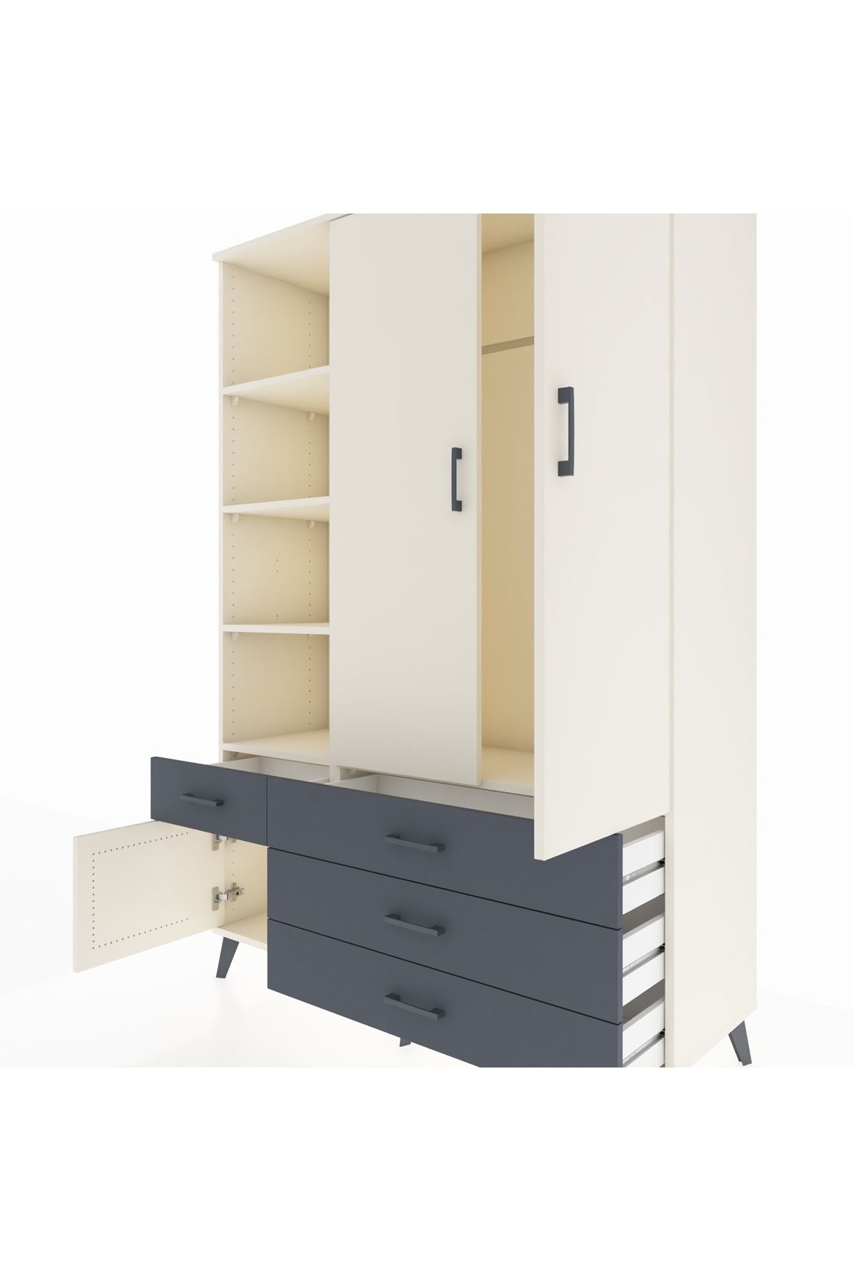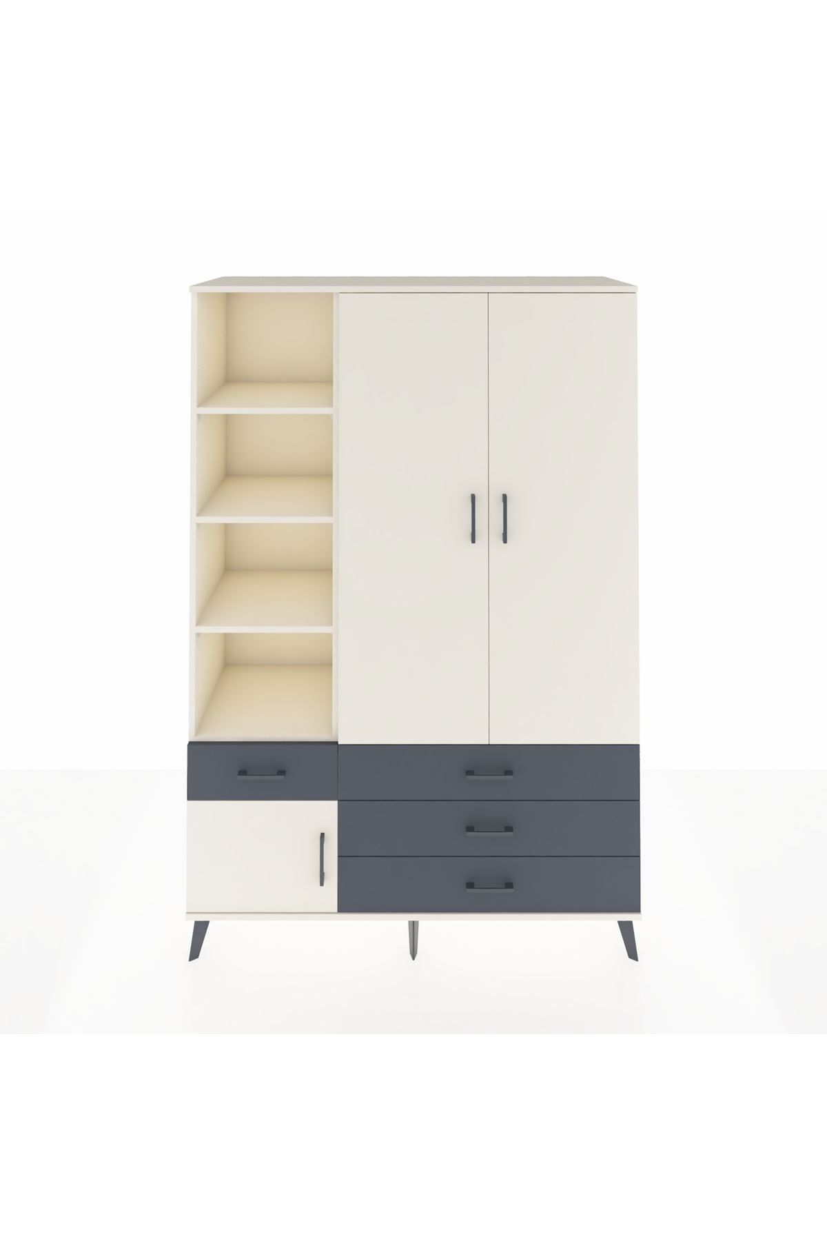 Geniş iç hacim ve açık raf sistemi kıyafet, kitap ve dekoratif objeler için çok yönlü kullanım sağlar. Ayarlanabilir raflar sayesinde mevsimlik tekstil ve büyük ebatlı eşyalar için esneklik sunar. Tek askılık bölümü ceket, gömlek ve elbiseler için ideal yüksekliği sağlar. Çekmeceler, küçük parçaları, çorap ve iç çamaşırlarını düzenli tutar; çekmece konfigürasyonu ihtiyaca göre artırılabilir ya da azaltılabilir. Metal ayak yapısı zeminden hafif yükseltme sağlayarak temizlik ve hava sirkülasyonu avantajı verir. Ürünün yüzeyleri kolay temizlenebilir, çizilmeye karşı dayanıklı suntalam kaplama uzun süre estetik görünümünü korur.
