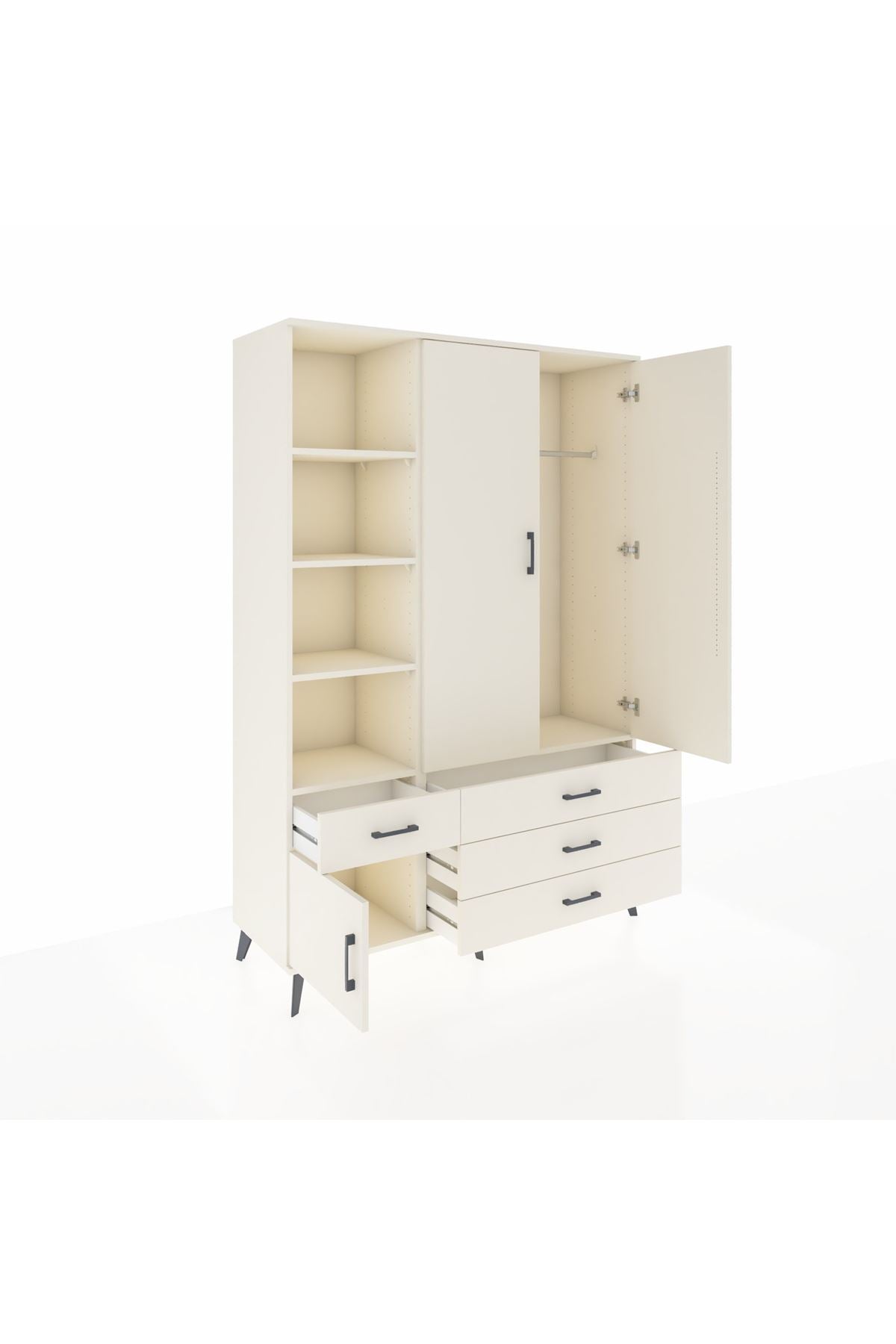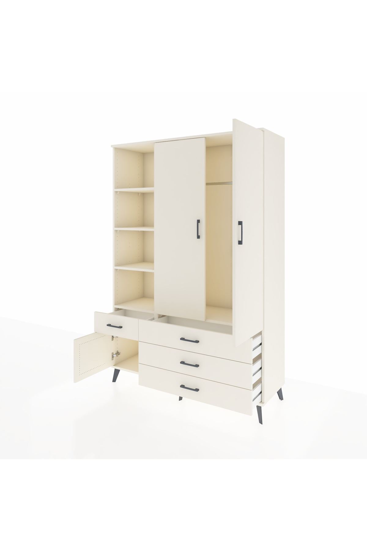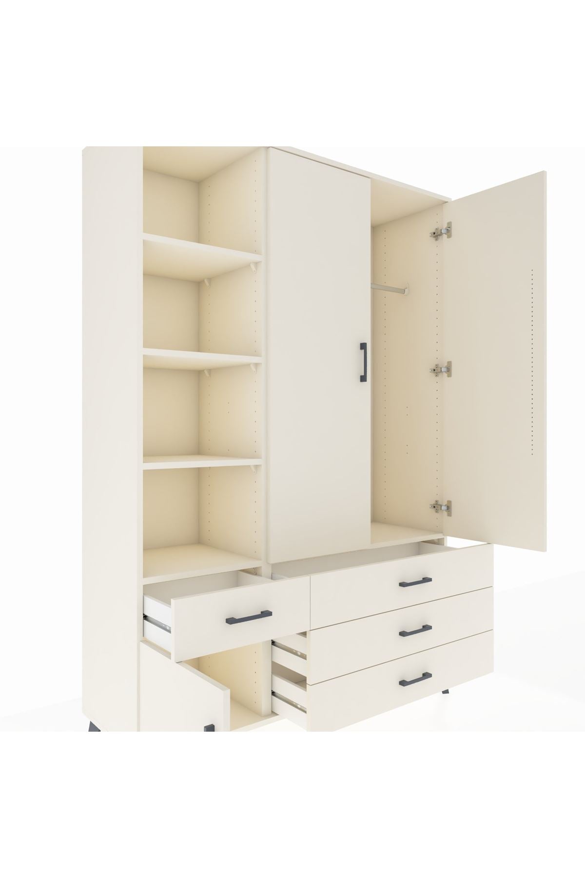 Kullanım kolaylığı sağlayan ayarlanabilir raflar sayesinde farklı ebatlardaki kutu, kitap veya aksesuarlar için depolama alanı oluşturabilirsiniz. Çekmece sayısı konfigüre edilebilir özelliği ile çekmece adedini ihtiyacınıza göre düzenleyerek içeriği optimize edebilirsiniz. Tek askılı bölüm kıyafetlerin kırışmadan saklanmasına yardımcı olurken, kapaklı bölmeler toz koruması sağlar. Metal ayaklar zeminde stabilite sağlar; suntalam yüzey kolay temizlenir ve günlük kullanıma uygundur.