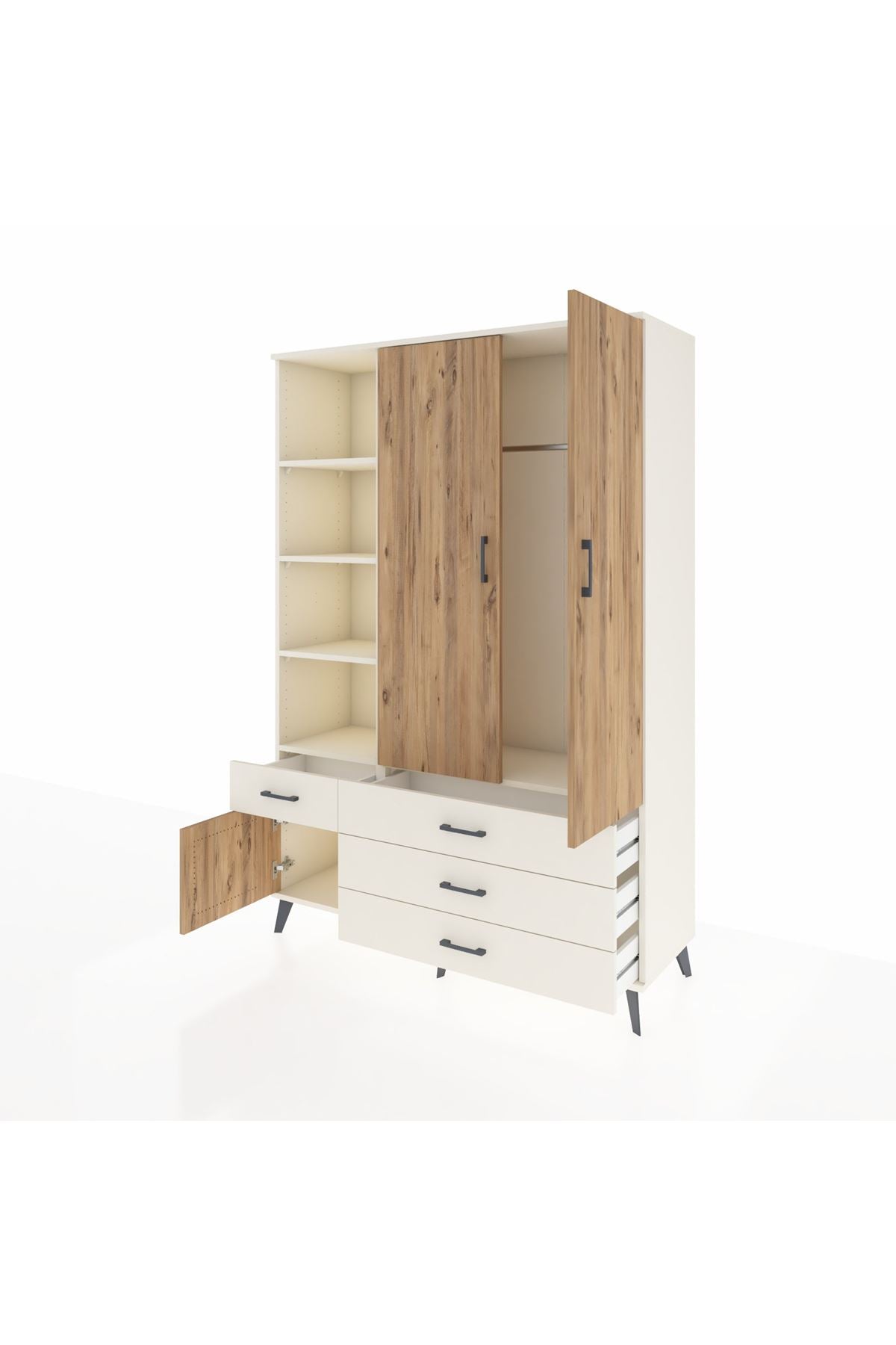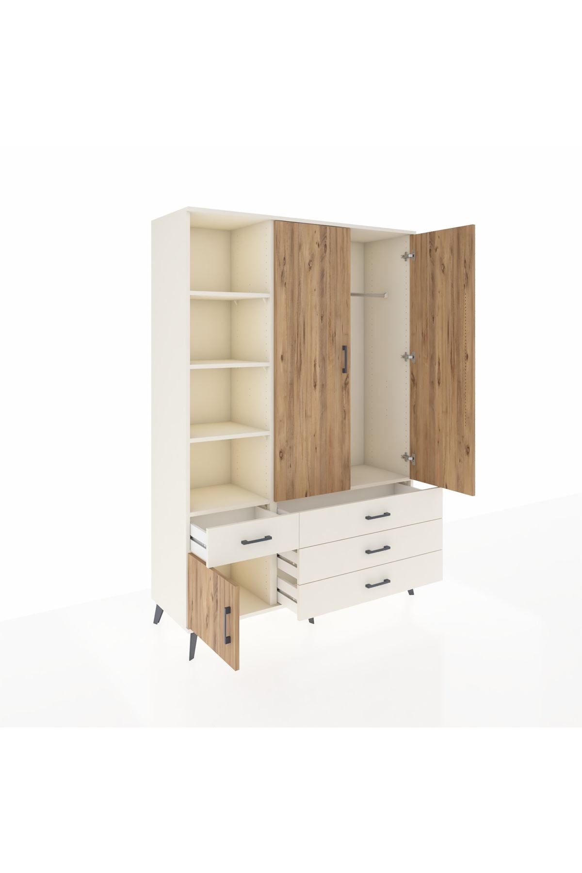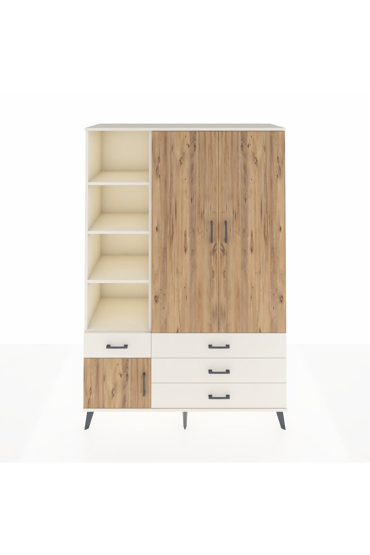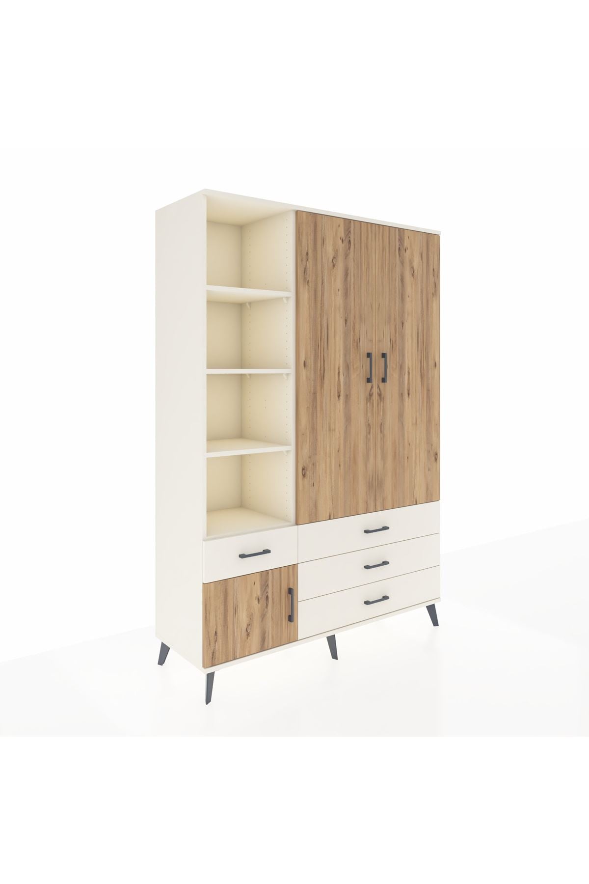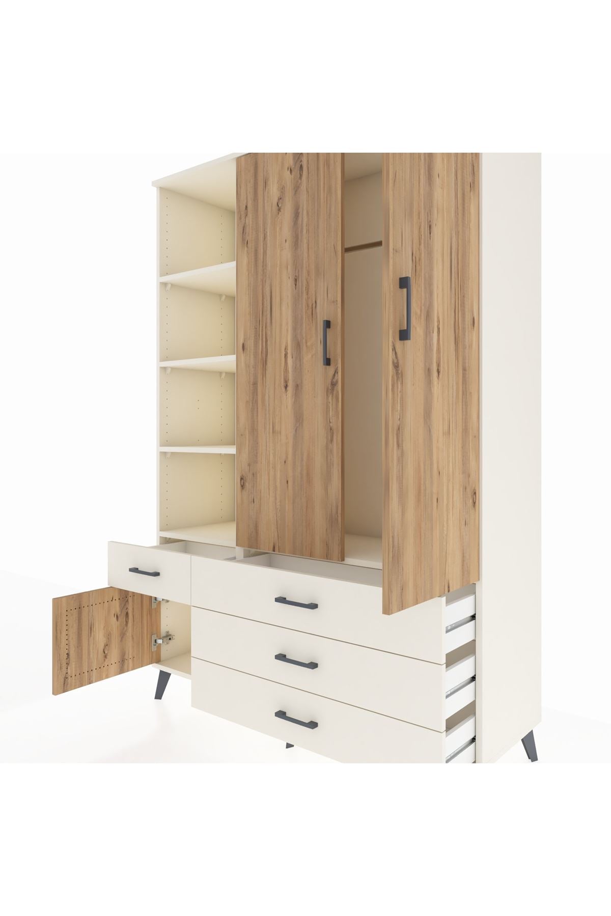 Geniş iç hacim, 5 ayarlanabilir raf ve tek askı bölmesi ile kıyafet, sezonluk mont, çanta ve düzenleyici kutuları bir arada tutar. 4 çekmece başlangıç konfigürasyonu ihtiyaçlara göre değiştirilebilir; çekmece sayısı konfigüre edilebilir olması depolama ihtiyaçlarına göre esneklik sunar. Raflar ayarlanabilir olduğundan kitaplar, dosyalar veya dekoratif objeler için ideal yükseklik ayarı yapılabilir. Metal ayaklar zeminden yükselterek temizlik kolaylığı sağlar ve nemli zeminlerden doğacak zararları azaltır.