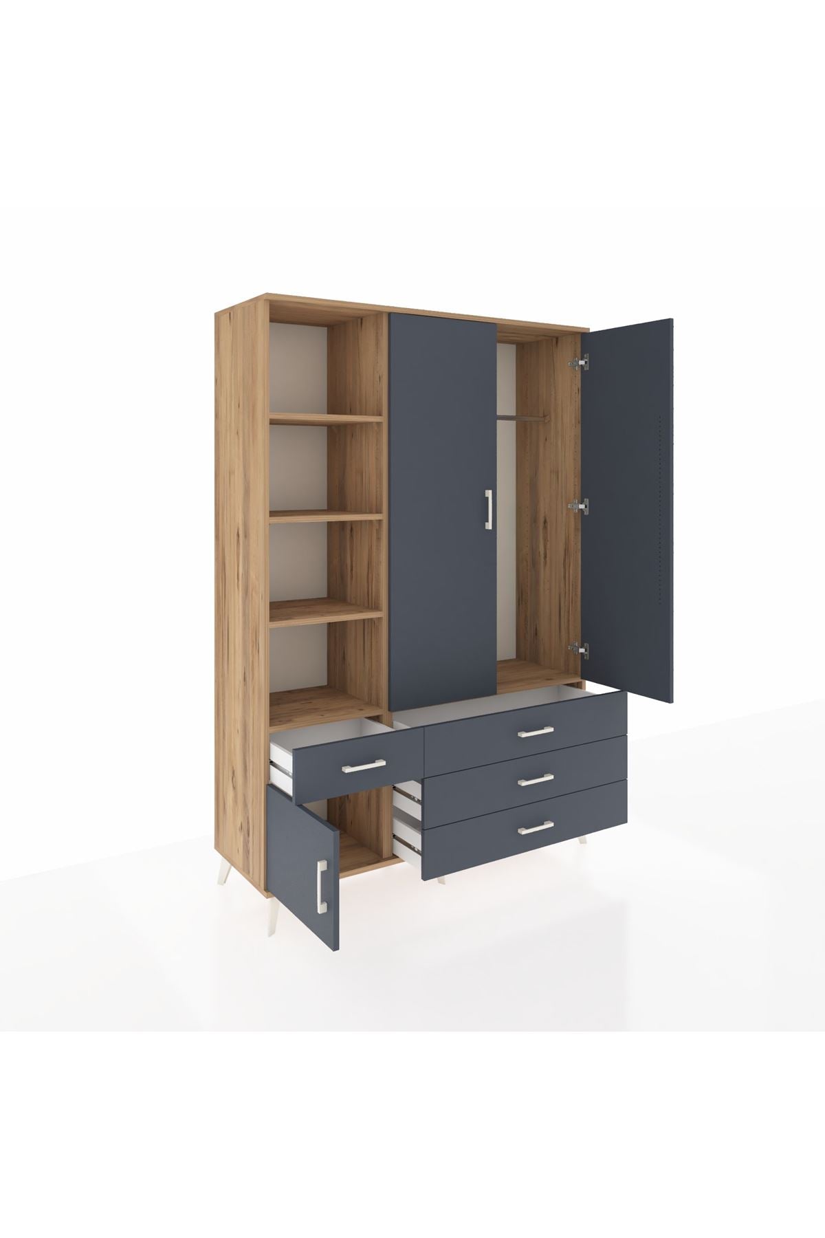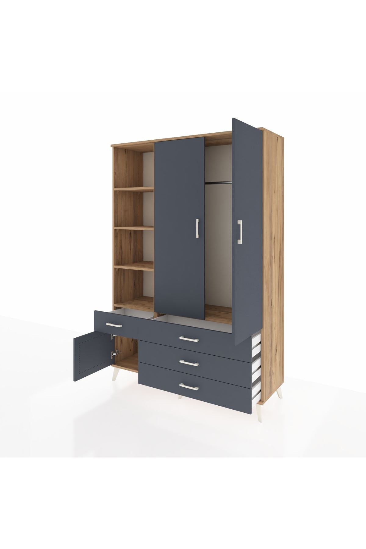 Hyperion Dolap 5 Raflı 4 Çekmeceli Tek Askılı 132x44x195 Çam-Antrasit/Antrasit – Fonksiyonel ve Şık Depolama Çözümü