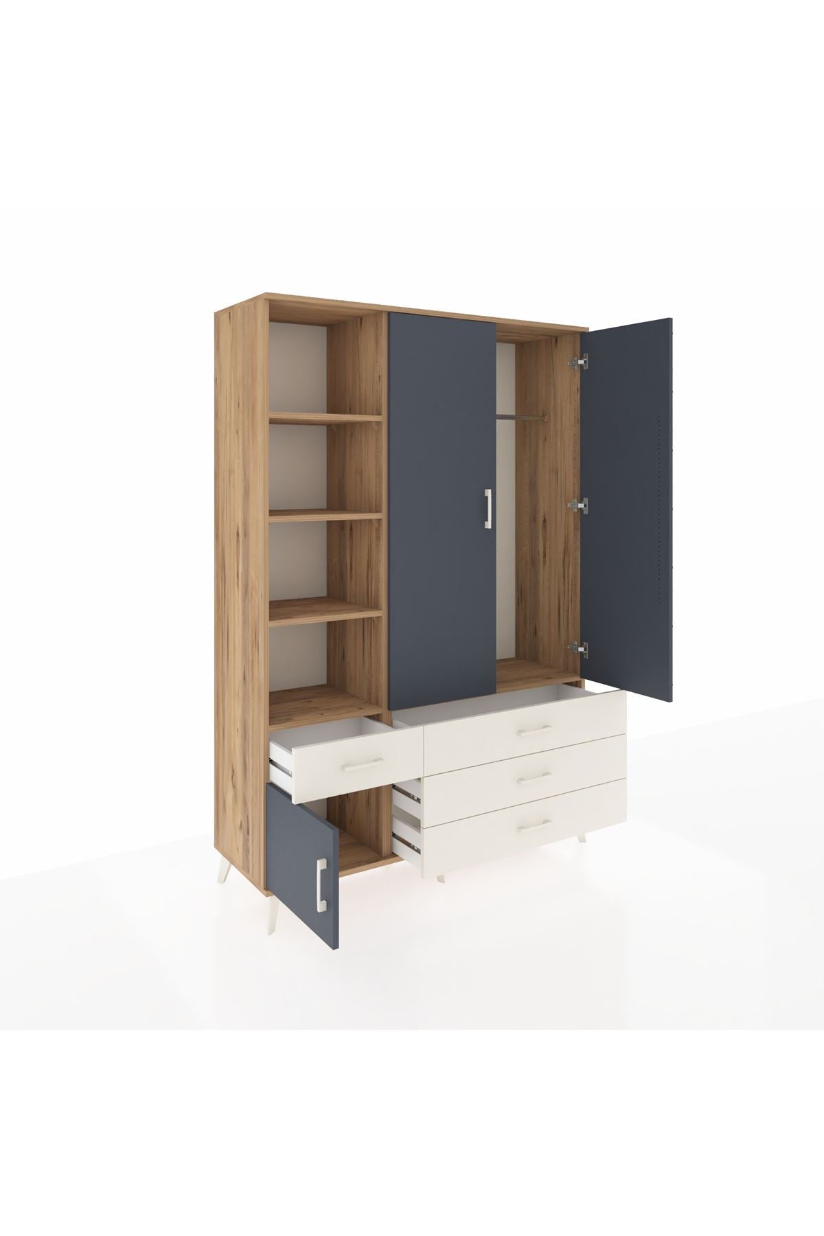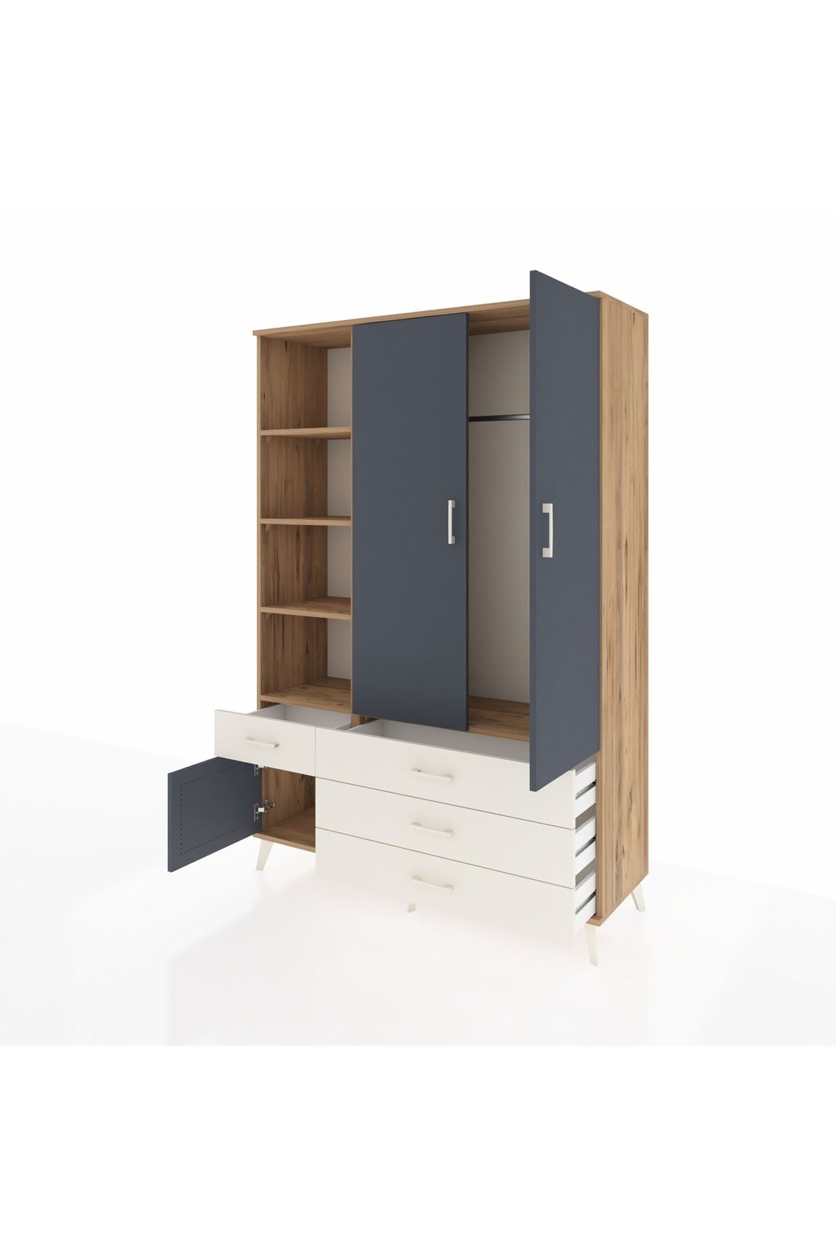 Bu dolap, evinizde düzenli ve şık bir depolama alanı sağlar. Aytaşı, antrasit ve atlas çam renk kombinasyonlarıyla modern ve sıcak bir atmosfer oluşturur. Metal ayakları ürüne stabilite kazandırırken zeminde uzun ömürlü kullanım sunar; metal kulplar ise sık kullanımda bile dayanıklılık gösterir. İç düzeni; 5 ayarlanabilir raf, tek askı bölmesi ve 4 çekmece ile farklı ebatlardaki eşyalarınızı kolaylıkla organize etmenize olanak tanır. Çekmece sayısı konfigüre edilebilir, böylece ihtiyaçlarınıza göre düzenleme yapabilirsiniz.