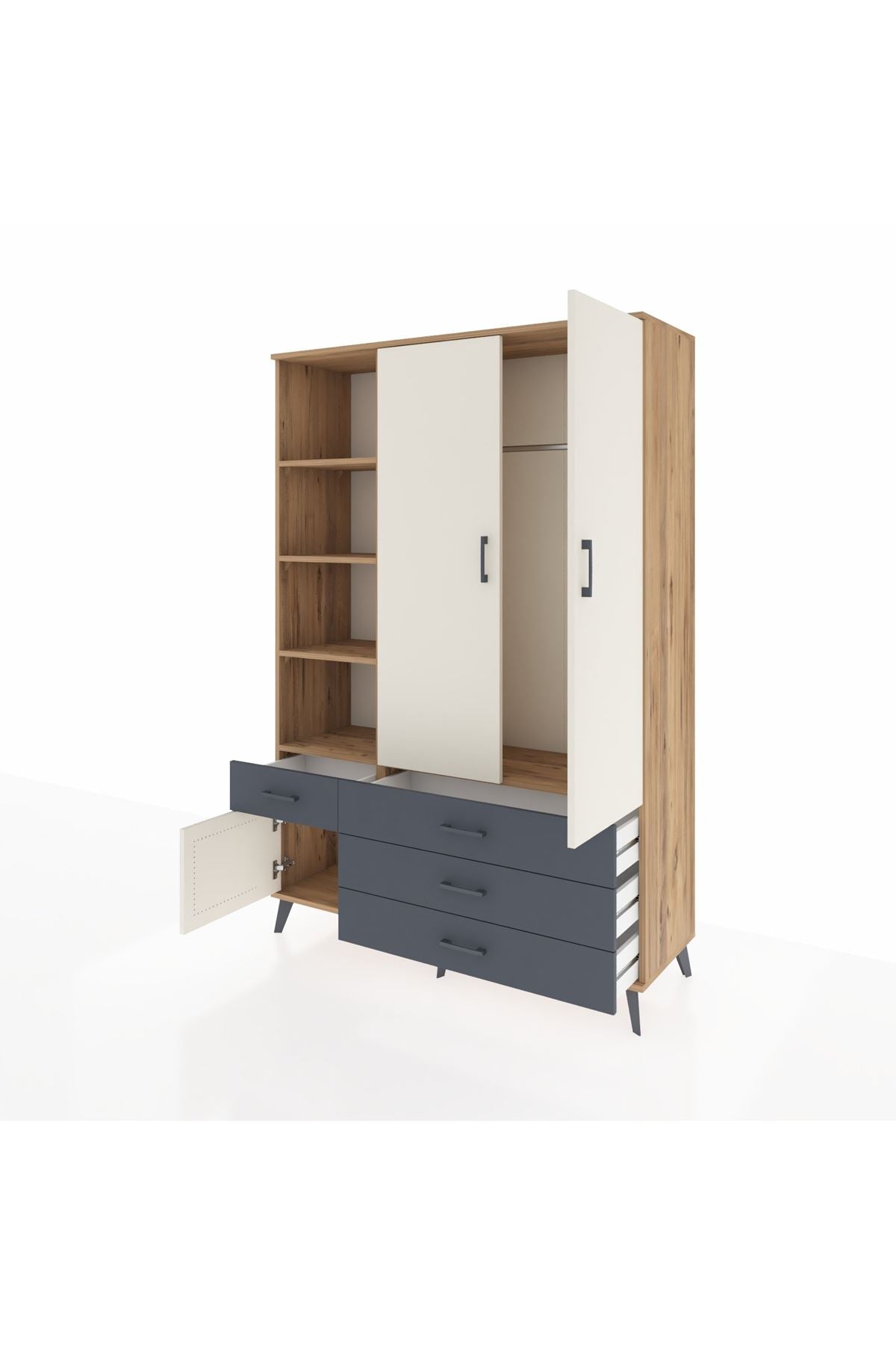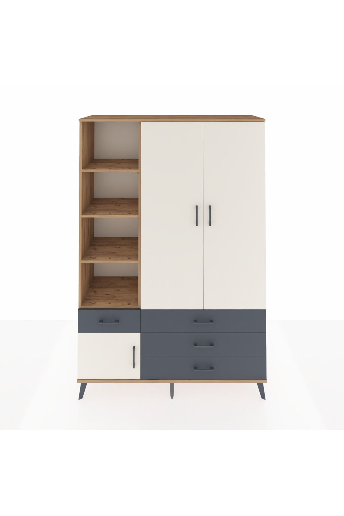 Günlük kullanımda kıyafetleri, mevsimlik giysileri, çarşaf ve havluları düzenli şekilde saklamanızı sağlar. Açık raflar sık kullanılan eşyaları erişilebilir kılar; kapaklı bölümler tozdan korur ve daha derli toplu bir görünüm sunar. Çekmeceler küçük eşyalar, iç çamaşırı ve aksesuarlar için düzen sağlar. Metal ayaklar temizlik kolaylığı sunar, dolabın yerden yüksek olması zemin temizliği ve hava dolaşımı açısından avantaj üretir. 1. sınıf suntalam yüzeyler çizilmelere ve nem değişimlerine karşı dayanımlıdır; uzun vadede estetik görünümü korur.