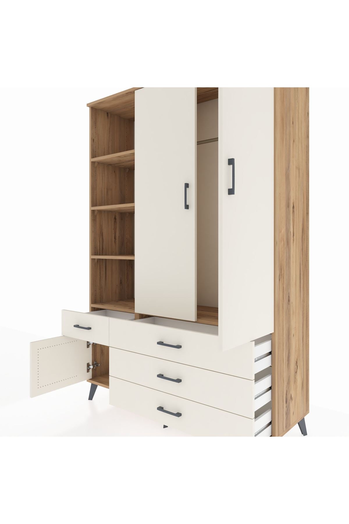 Bu dolap, evinizde düzen ve estetik uyumu bir arada sağlar. Aytaşı, Antrasit ve Atlas Çam renk seçenekleriyle farklı dekorasyon stillerine kolayca uyum sağlar. Metal ayakları zemine sağlam oturur ve uzun süreli stabilite sunar; metal kulplar ise sık kullanıma dayanıklı, ergonomik tutuş sağlar. İç bölümdeki tek askı alanı günlük kıyafetlerinizi düzenli asmanıza yardımcı olur, raflar isteğe göre ayarlanabilir; çekmece sayısı konfigüre edilebilir, böylece kullanım ihtiyaçlarınıza göre depolama düzeni oluşturabilirsiniz.