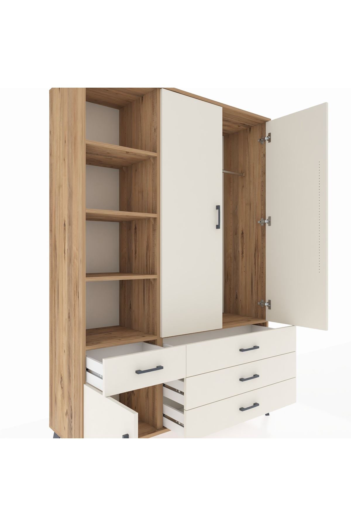 Geniş iç hacmi sayesinde mevsimlik giysiler, hafif ev tekstili ve günlük eşyalar için ideal depolama sunar. Ayarlanabilir raf sistemi kitap, tabak veya oyuncak gibi farklı boyutlardaki öğeleri düzenlemenizi sağlar. Alt bölümdeki çekmeceler küçük eşyaları sınıflandırma ve kolay erişim imkanı verir. Tek askılı bölüm, ceket ve elbiselerin kırışmadan saklanmasına yardımcı olur. Metal ayaklar dolabın temizliğini kolaylaştırır ve zeminin havasını korur.