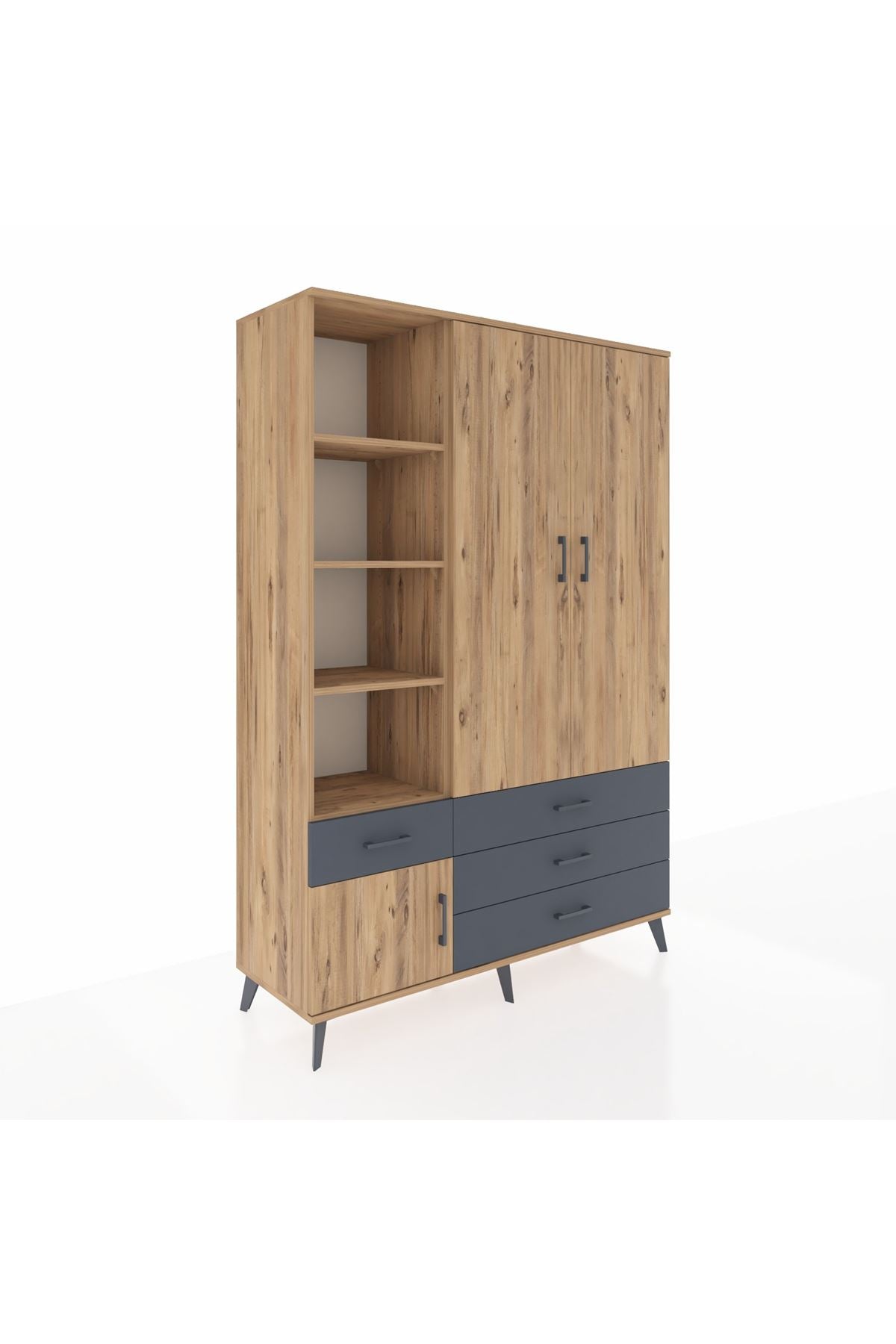 Hyperion Dolap 5 Raflı 4 Çekmeceli Tek Askılı 132x44x195 Çam-Çam/Antrasit