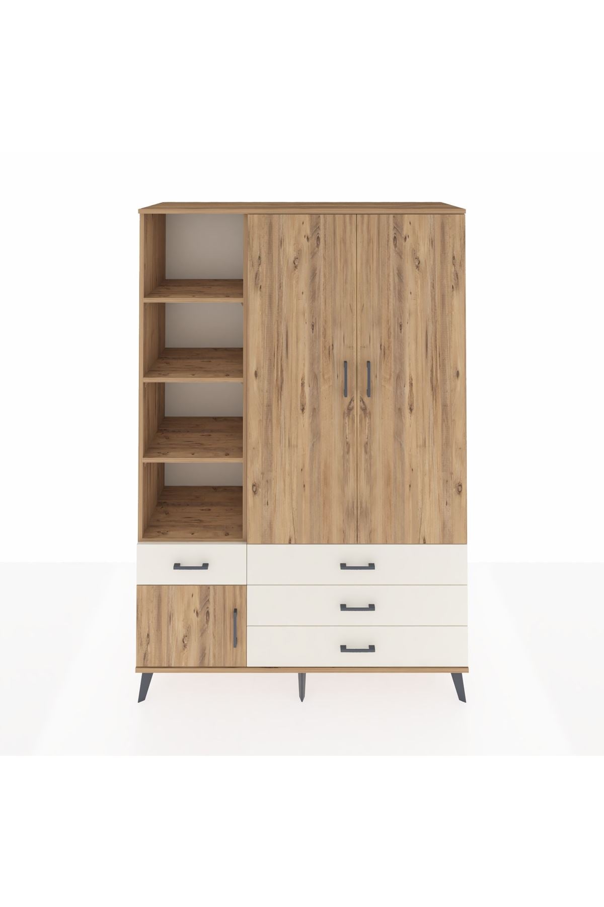 Geniş iç hacmiyle kıyafet, nevresim, havlu ve ev tekstilini düzenler. Açık raf bölümü sık kullanılan eşyalar için kolay erişim sağlar; kapaklı ve çekmeceli bölümler ise düzeni korur ve tozlanmayı engeller. Metal ayaklar zeminden yükselterek temizlik kolaylığı sağlar ve nemli zeminlerde ek koruma sunar. Şık kulplar kullanıcı konforunu artırır, çekmeceler pürüzsüz hareket eder. Modüler yapı ve konfigüre edilebilen çekmece sayısı, dolabı kişisel ihtiyaçlara göre özelleştirmeyi sağlar.
