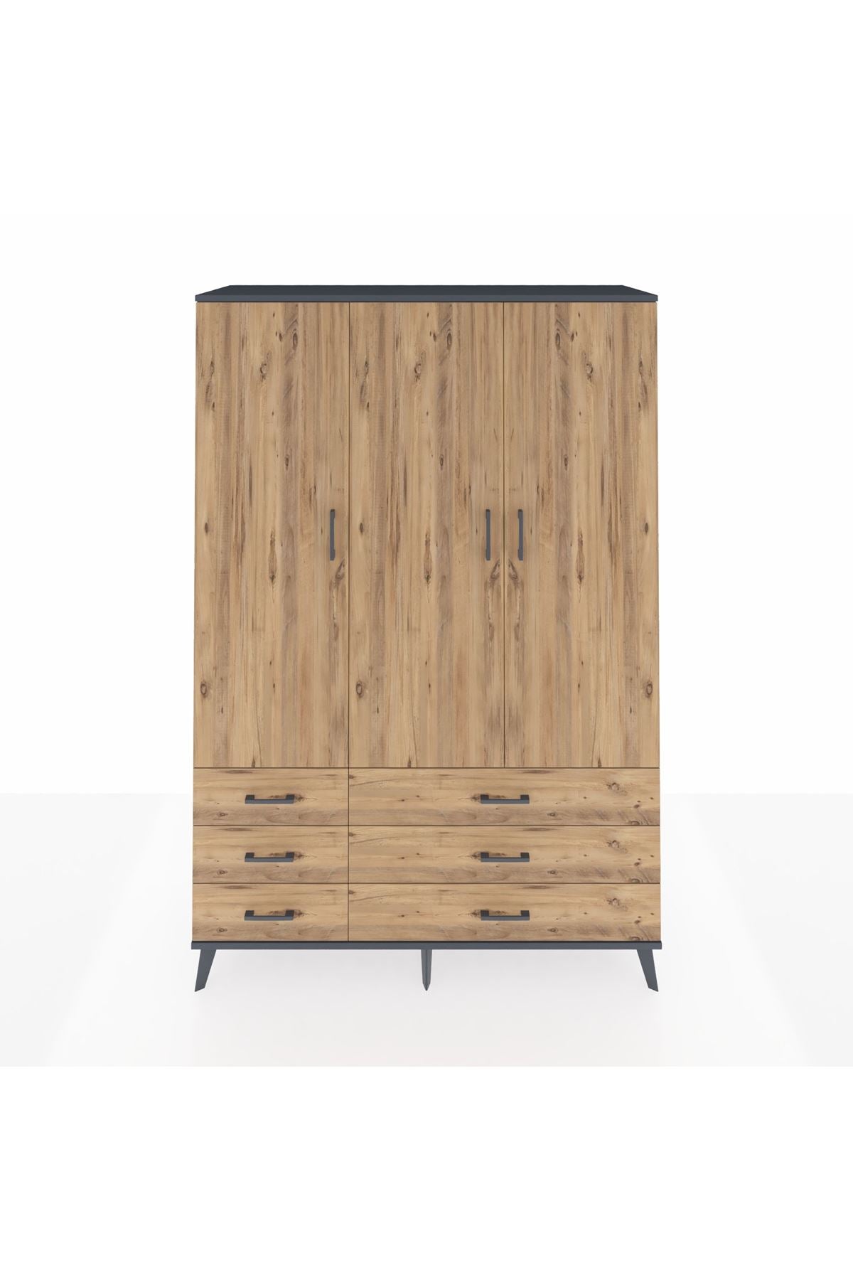 Bu dolap, yaşam alanlarınızda fonksiyonel depolama ve modern bir görünüm sağlar. Antrasit-Çam kombinasyonu, koyu metal detaylarla dengelenerek hem sıcak hem de sofistike bir estetik sunar. Metal ayakları sağlam duruş ve zemine düzgün oturma garantilerken, metal kulplar sık kullanıma dayanacak şekilde tasarlanmıştır. İç kısmında yer alan tek askılık, uzun kıyafetler için ideal alan yaratır; 5 raflı yapısı sayesinde raflar ayarlanabilir olarak farklı yüksekliklerde konumlandırılabilir. Alt bölümdeki 6 çekmece, düzen ihtiyacına göre konfigüre edilebilir, böylece çekmece sayısını kullanım amacınıza uygun hale getirebilirsiniz.