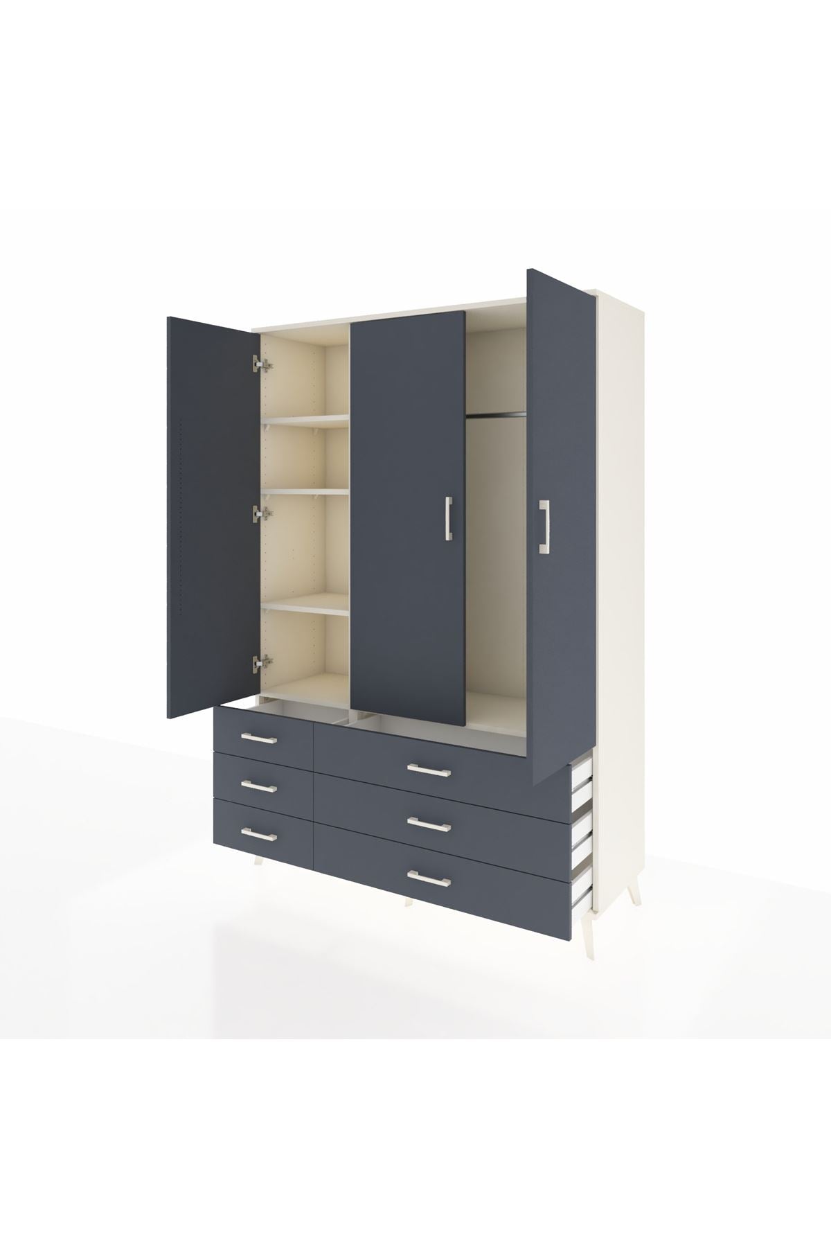 Geniş iç hacim ve 5 raf kombinasyonu ile kıyafet, yatak örtüsü, kişisel eşya ve arşiv belgeleri düzenli saklanır. 6 çekmece, küçük eşyaların sınıflandırılmasını kolaylaştırır; çekmece sayısı isteğe göre konfigüre edilebilir, böylece kullanım amacına uygun düzen oluşturulur. Rafların ayarlanabilir olması farklı yüksekliklerdeki kutu ve dosyaların rahatlıkla yerleştirilmesine imkân verir. Metal ayaklar zeminden yükselttiği için nem ve temizlik sorunlarına karşı avantaj sağlar.