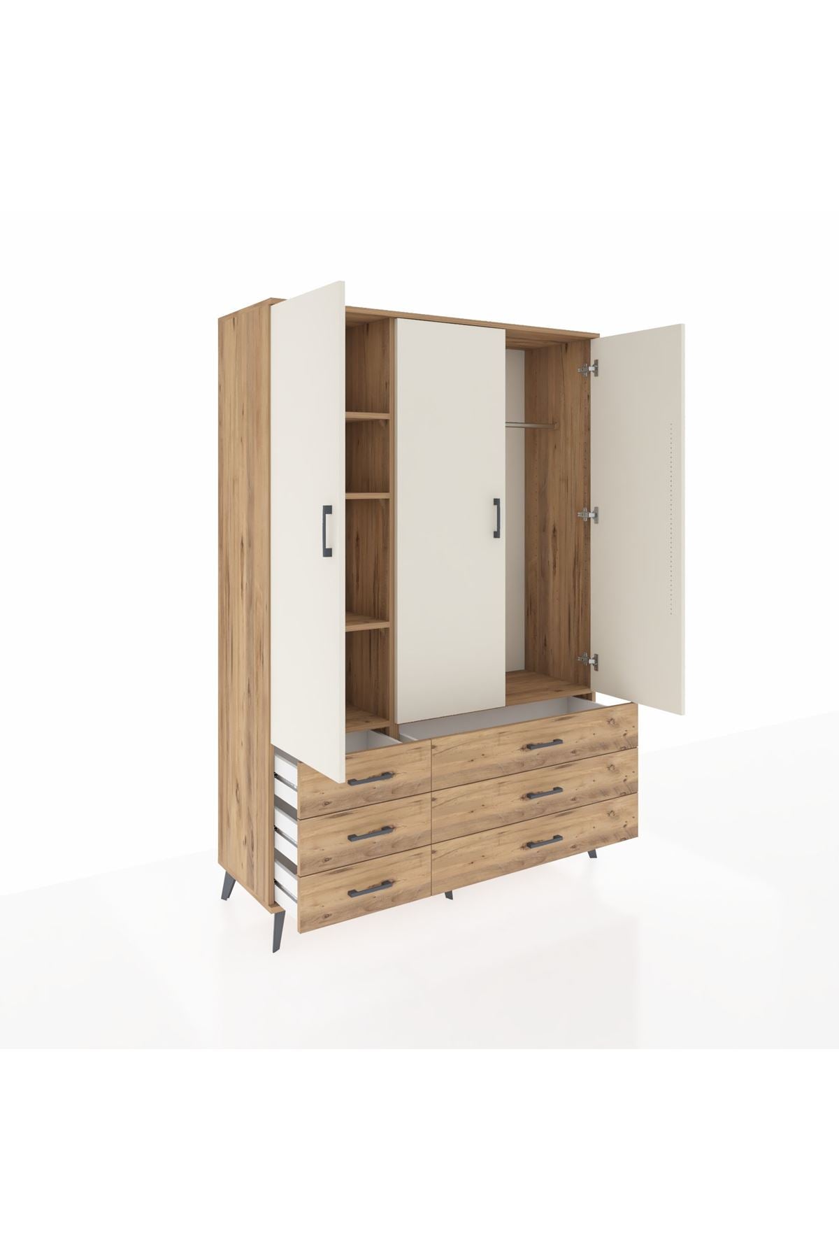 Geniş iç hacmi sayesinde kıyafet, nevresim ve mevsimlik gardırop eşyalarını düzenli şekilde saklama imkânı verir. Çekmeceler sıralı depolama sağlayarak küçük parçaları (çorap, iç giyim, aksesuar) ayırmanıza yardımcı olur. Ayarlanabilir raflar ile kitap, kutu ya da çanta gibi eşyalar için ideal yükseklik ayarı yapılabilir. Metal ayaklar zemini korur, temizlik kolaylığı sağlar; sağlam konstrüksiyon uzun yıllar kullanıma uygun dayanıklılık sunar.