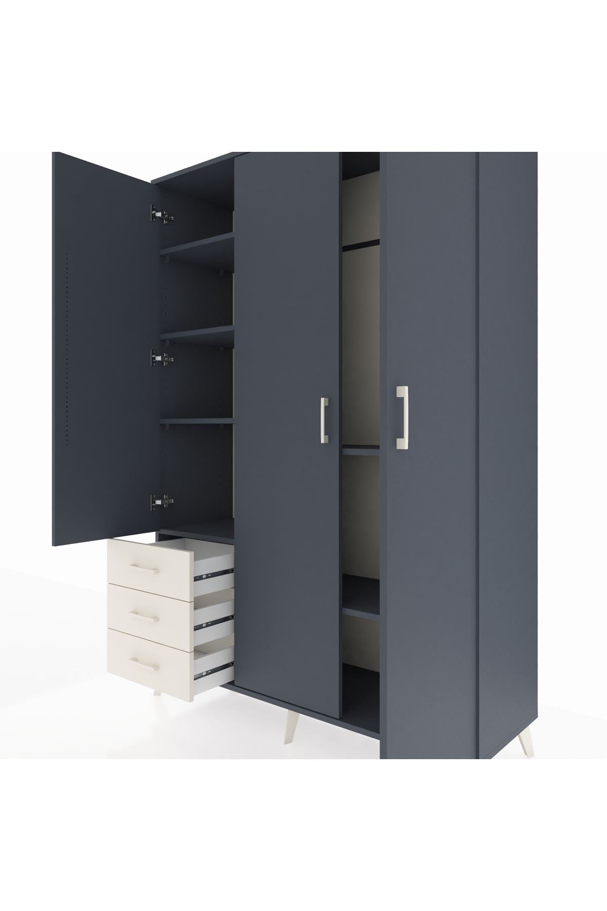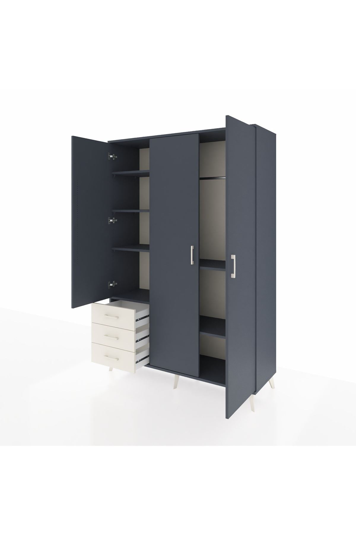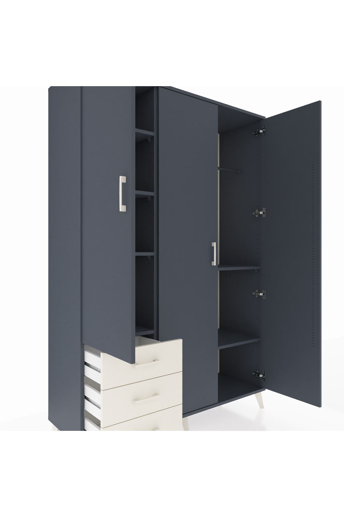 Bu dolap, evinizde düzen ve estetiği bir arada sağlar. Antrasit gövde ve aytaşı çekmeceler veya tercih ettiğiniz diğer renk kombinasyonları ile modern bir görünüm sunar. Metal ayakları sağlam ve dayanıklı, metal kulplar uzun ömürlü kullanım sağlar. İç kısmındaki tek askılık alanı ceket, kaban ve uzun giysiler için idealdir; 6 raflı düzeni sayesinde katlanmış kıyafet, çanta ve aksesuarları düzenli şekilde saklayabilirsiniz. Standart olarak 3 çekmece ile gelir; istenirse çekmece sayısı konfigüre edilebilir.