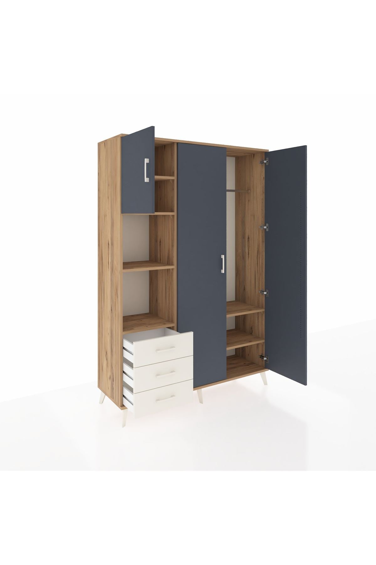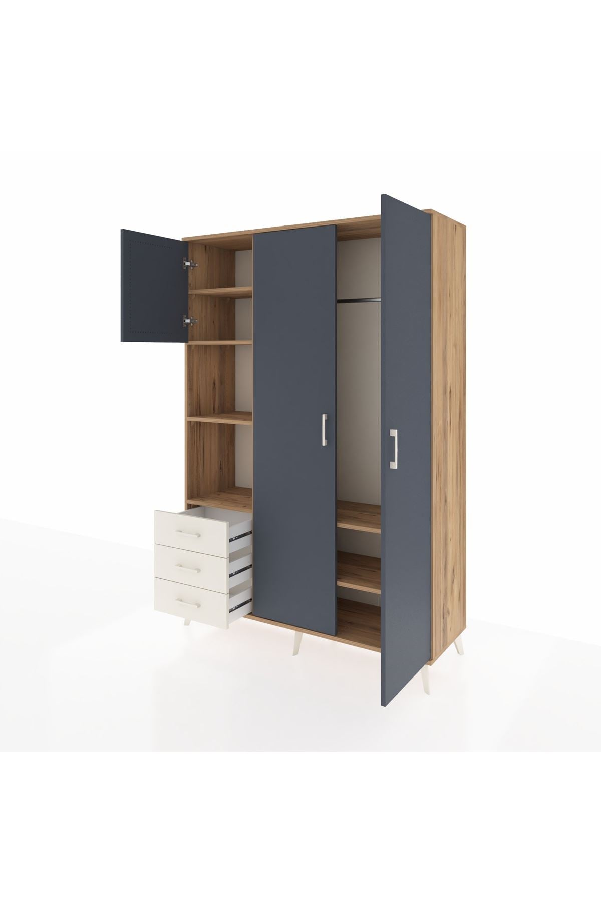 Bu dolap, evinizde düzen ve estetik sağlar. Çam yüzeyin sıcak dokusu ile antrasit kapakların modern duruşu bir araya gelerek hem minimal hem de sofistike bir görünüm sunar. Metal ayakları sağlamlık ve uzun ömür verir; metal kulplar günlük kullanıma dayanıklılık katar. İç düzeni, 6 raf ve konfigüre edilebilen 3 çekmece ile farklı ihtiyaçlara göre düzenlenebilir; raf yükseklikleri ayarlanabilir ve tek askılı bölme uzun kıyafetler için uygun şekilde tasarlanmıştır.