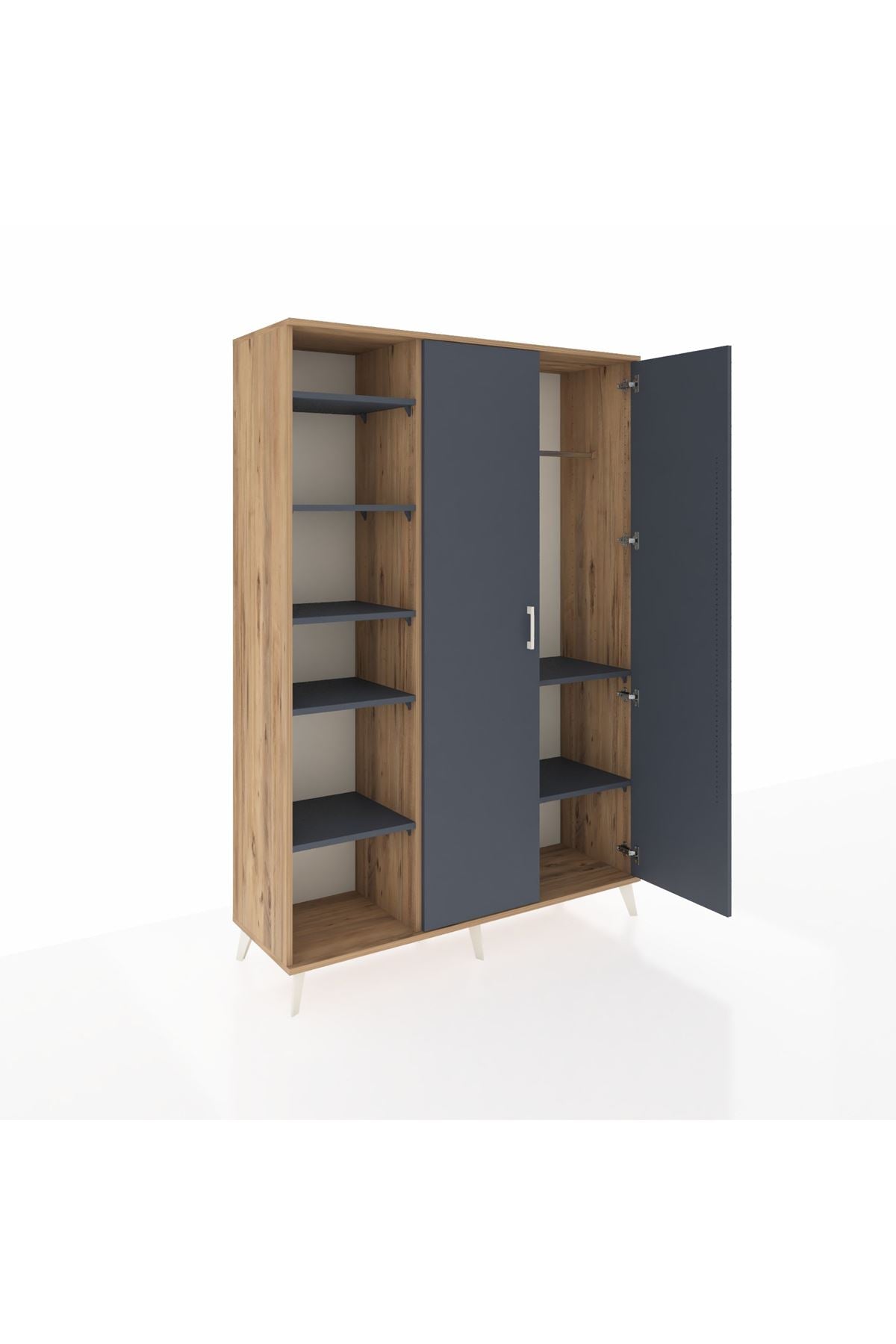 Bu dolap, yaşam alanlarında düzen sağlarken estetik bir görünüm sunar. Antrasit kapaklar ile çam dokulu gövde kombinasyonu modern bir kontrast oluşturur; Aytaşı seçeneği ferah, Atlas Çam seçeneği ise sıcak ve doğal bir atmosfer sağlar. Metal ayakları sağlam zemin oturumu verir, metal kulplar ise uzun ömürlü ve ergonomik kullanım sunar. 7 raflı düzeni günlük eşyalarınızı kategorize etmenize yardımcı olurken, raflar ayarlanabilir yapısıyla farklı yüksekliklere göre uyum sağlar. İhtiyaç halinde çekmece sayısı konfigüre edilebilir, böylece dolabı çekmeceli depolama veya açık raf kombinasyonuna göre kişiselleştirebilirsiniz.