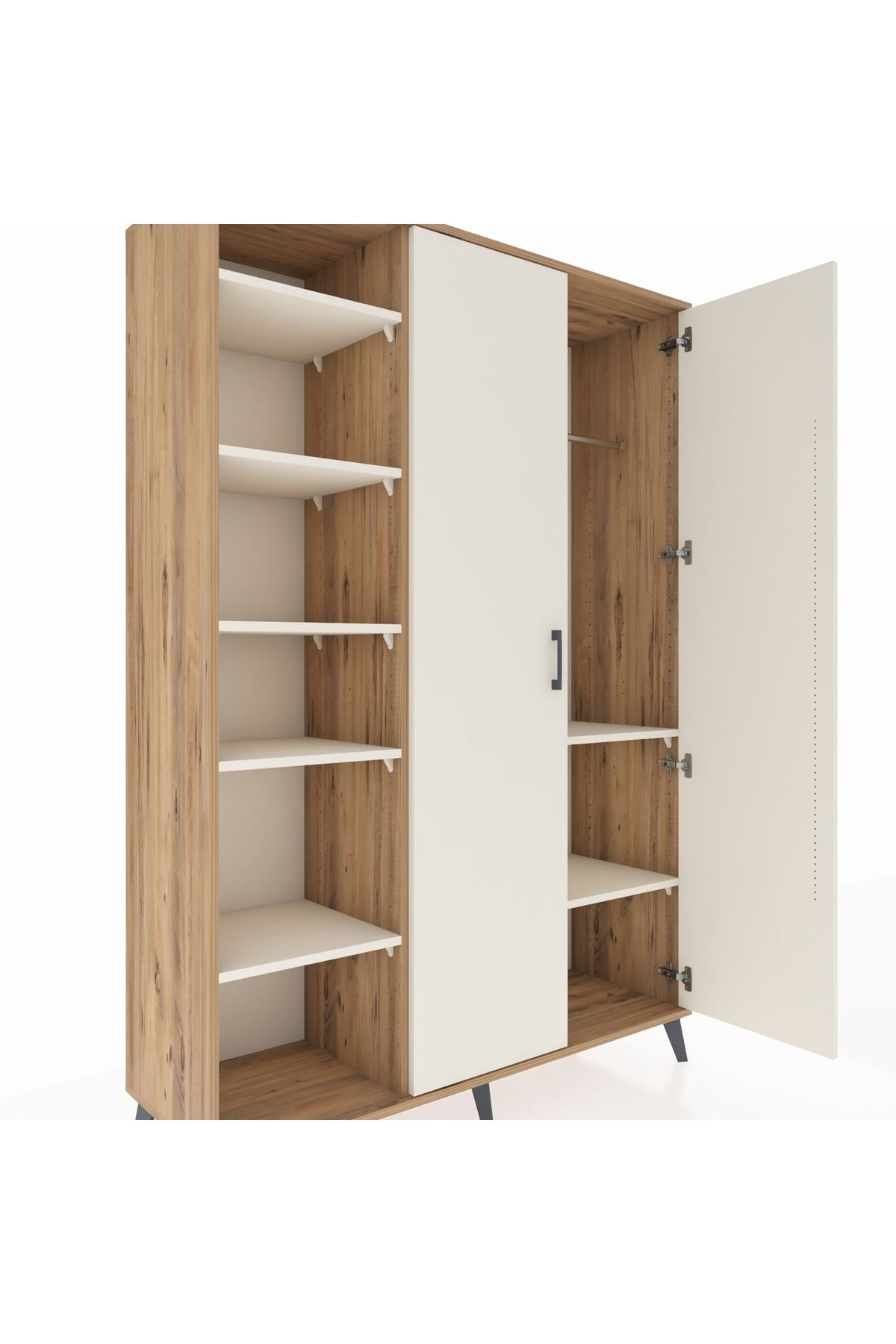 Yedi adet rafı sayesinde farklı ebatlardaki eşyalarınızı kategorize ederek saklayabilirsiniz; raflar ayarlanabilir olduğu için kupalar, mutfak gereçleri, tekstil veya oyuncaklar için ideal yükseklik ayarları yapılır. Tek kapaklı bölümde tek askılık sistemi ile kıyafetlerinizi kırışıksız asabilir, üst bölümlerde kutu veya sepetlerle düzen sağlarsınız. 1. sınıf suntalam yüzeyler çizilmeye karşı dirençlidir ve kolay temizlenir. Metal ayakları zeminden yükselttiği için alt temizlik rahat yapılır, nem ve leke riskleri azalır. Çekmece sayısı konfigüre edilebilir özelliği ile ihtiyacınıza göre çekmece ekleyip çıkararak depolama düzeninizi özelleştirebilirsiniz.