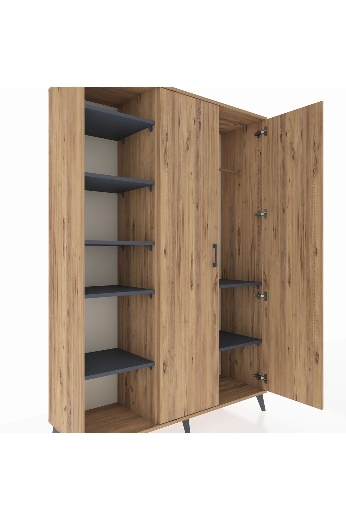 Bu dolap, evinizde düzen ve estetik dengesi sağlar. Doğal dokuyu yansıtan çam kaplama paneller ile koyu antrasit raf kombinasyonu modern ve sıcak bir görünüm sunar. Metal ayakları ekstra dayanıklılık verir; metal kulplar uzun ömürlü ve ergonomik kullanım sağlar. 7 raflı yapısı sayesinde farklı boyutlarda eşyaları kategorize ederek saklamanıza olanak verirken tek askı bölümü ceket, elbise veya uzun giysiler için pratik bir çözüm sunar.