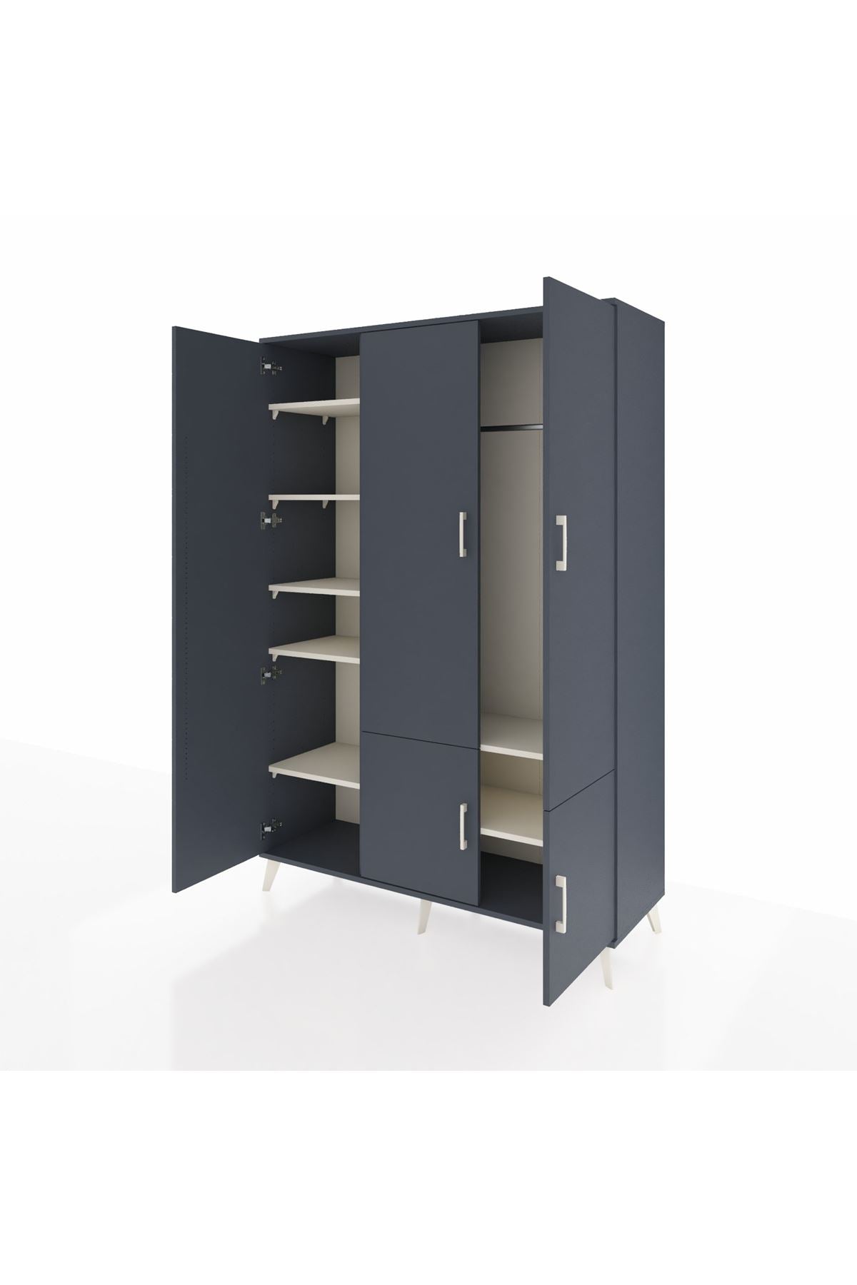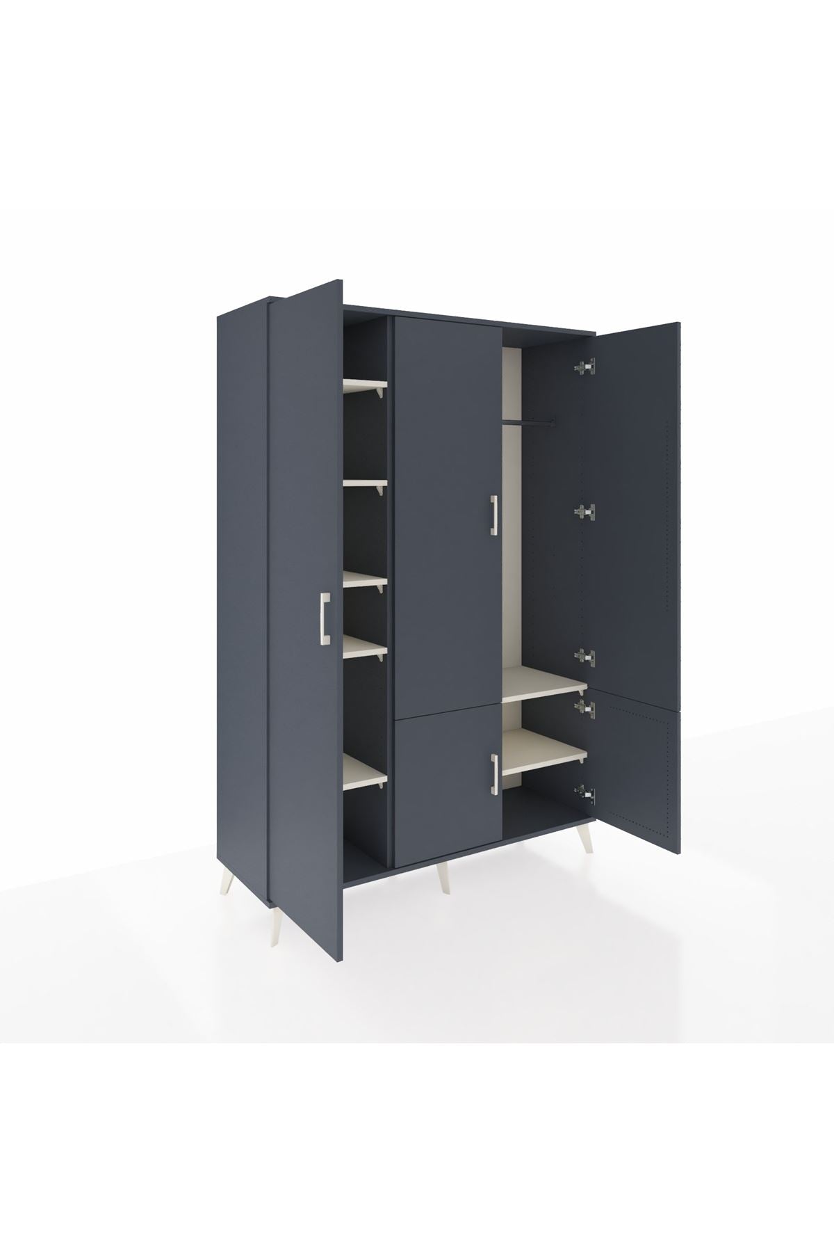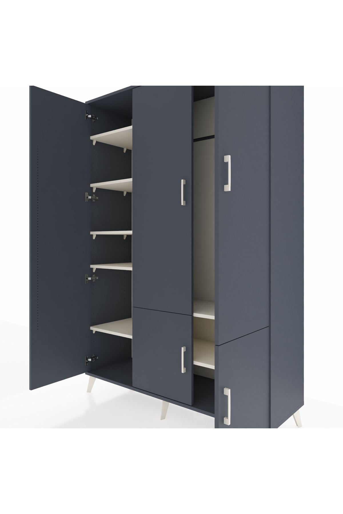 Bu dolap, evinizde düzen ve kullanım kolaylığı sağlar. Antrasit ve aytaşı tonları modern ve sofistike bir duruş sunar; atlas çam seçeneği ise doğal ahşap dokusunu tercih edenler için sıcak bir alternatif oluşturur. Metal ayakları sağlamlık ve yerden yükseklik sağlayarak zeminin korunmasına yardımcı olur, metal kulplar ise sık kullanıma dayanacak şekilde uzun ömürlü kullanım sunar. İç düzen 7 raflı yapısı, 5 kapaklı bölmeleri ve tek askılı kısmı ile hem dikey hem yatay depolama ihtiyaçlarını karşılar; raflar ayarlanabilir olduğundan fonksiyonel kullanım mümkündür ve çekmece sayısı isteğe göre konfigüre edilebilir.