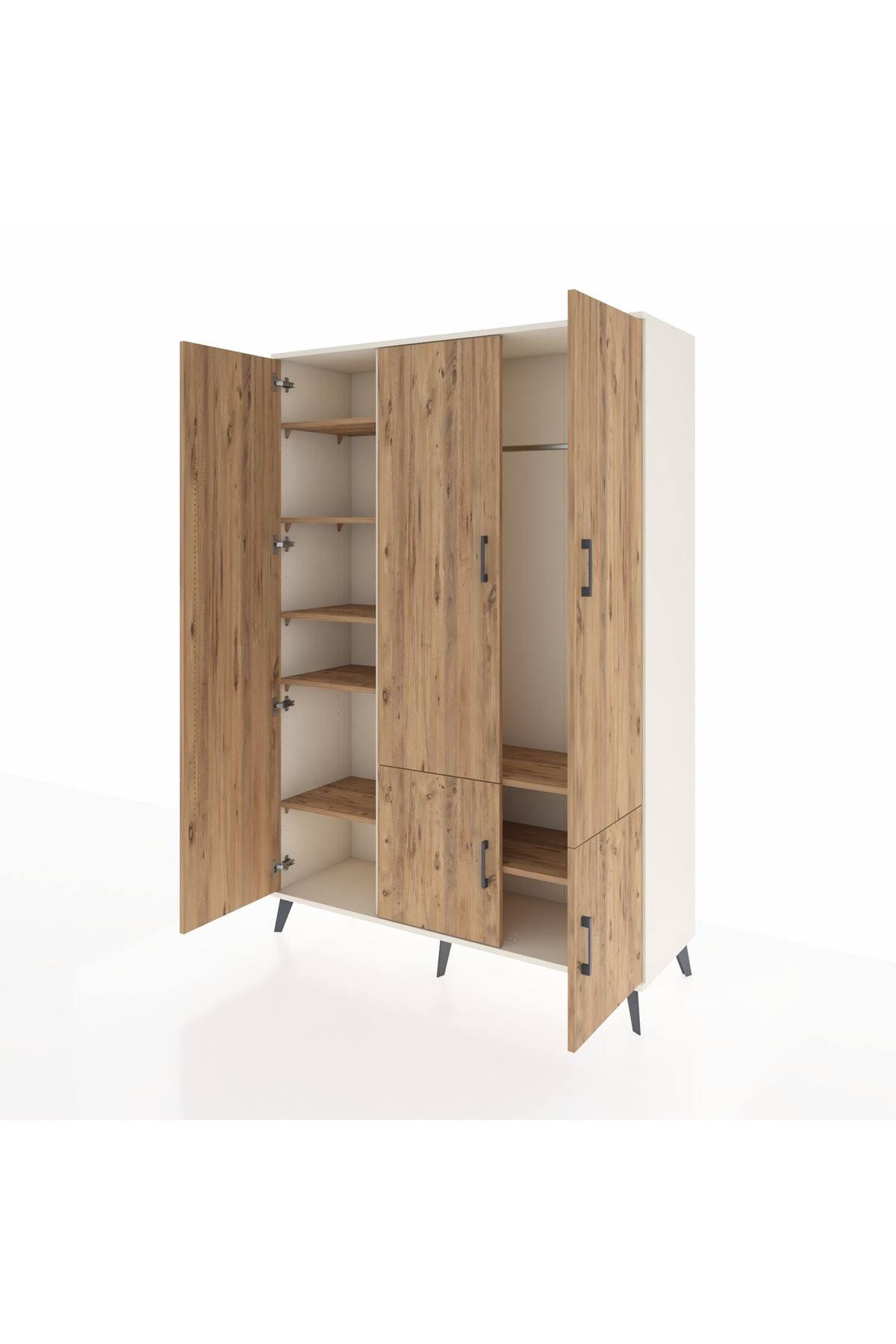 Tek askılı geniş bölümü elbise, kaban ve uzun paltolar için uygundur; ayarlanabilir raflarla ayakkabı ve aksesuar düzeni sağlanır. Üst raflar mevsimlik saklama için ideal olup, iç organizasyon kutuları yerleştirerek düzeni artırabilirsiniz. Metal kulplar ve minimal hatlar modern giyinme odalarına zarif bir görünüm kazandırır.