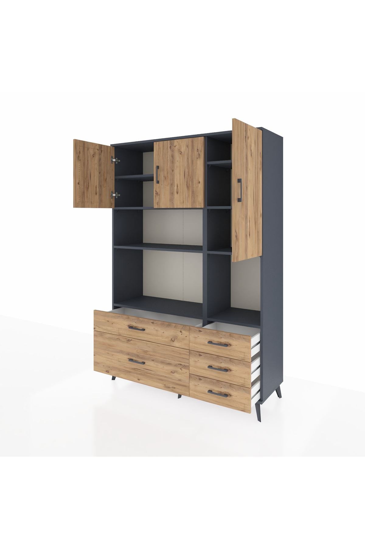 Hyperion Dolap 8 Raflı 5 Çekmeceli 3 Kapaklı 132x44x195 Antrasit-Çam/Çam