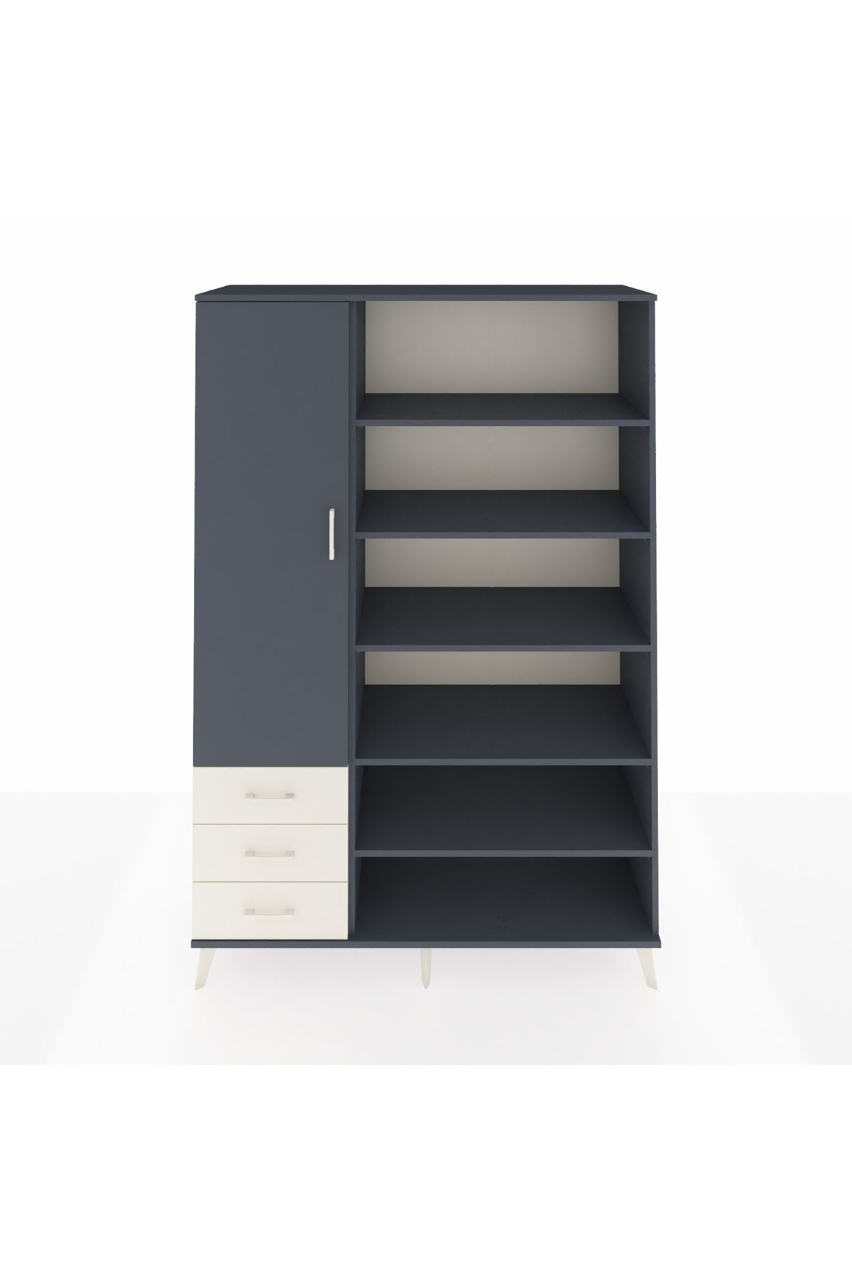 Bu dolap, evinizde ve iş yerinizde düzeni sağlarken depolama kapasitenizi artırır. Antrasit ve aytaşı tonlarının kontrastı modern bir görünüm sunar; temiz hatları ve minimal estetiği sayesinde farklı dekorasyon stilleriyle uyum sağlar. Metal ayakları sağlam zeminde yüksek taşıma kapasitesi sunar, metal kulplar ise sık kullanıma dayanıklı ve uzun ömürlü bir kullanım deneyimi vaat eder.