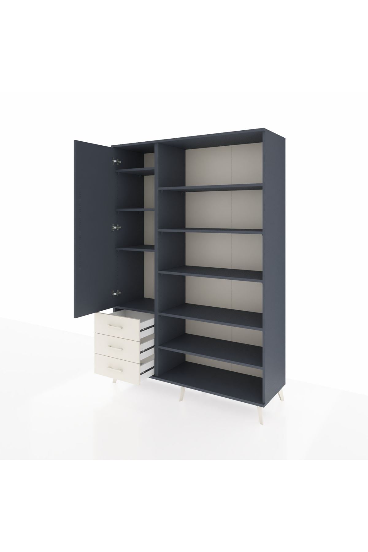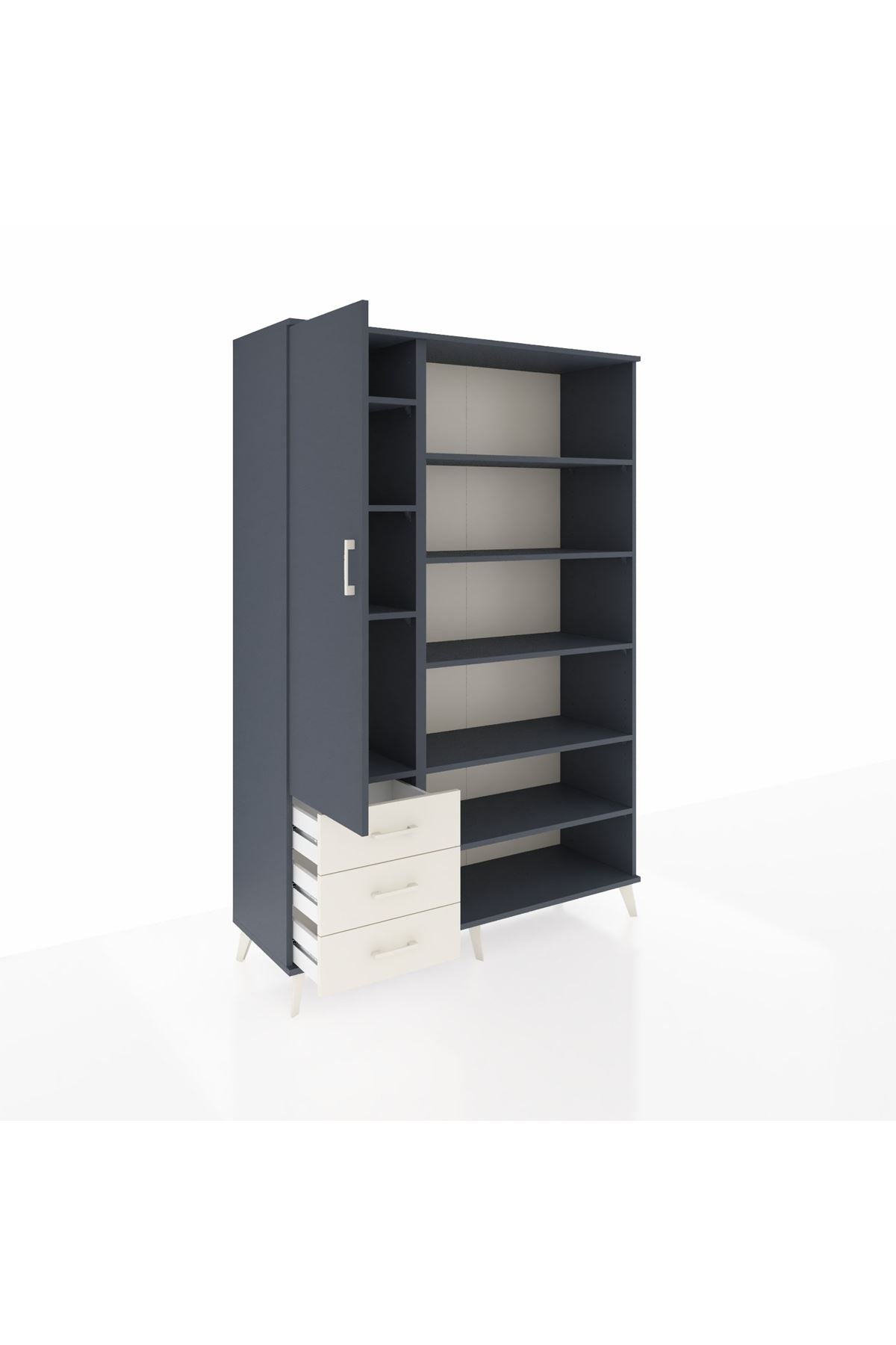 Geniş iç hacmi ve 9 rafı ile kıyafet, dosya, ürün stoğu veya tıbbi malzeme gibi farklı öğeleri düzenli şekilde saklar. Raf yükseklikleri ayarlanabilir olduğundan kitap, kutu veya ekipman gibi değişken boyuttaki eşyalar kolayca yerleştirilir. Çekmece sayısı konfigüre edilebilir yapısı sayesinde kullanım ihtiyaçlarına göre 3 çekmeceli baz modelden farklı çekmece düzenlerine geçiş yapılabilir. Suntalam yüzey bakımı kolaydır; nem ve leke dirençli kaplama uzun süre yeni görünümünü korur.