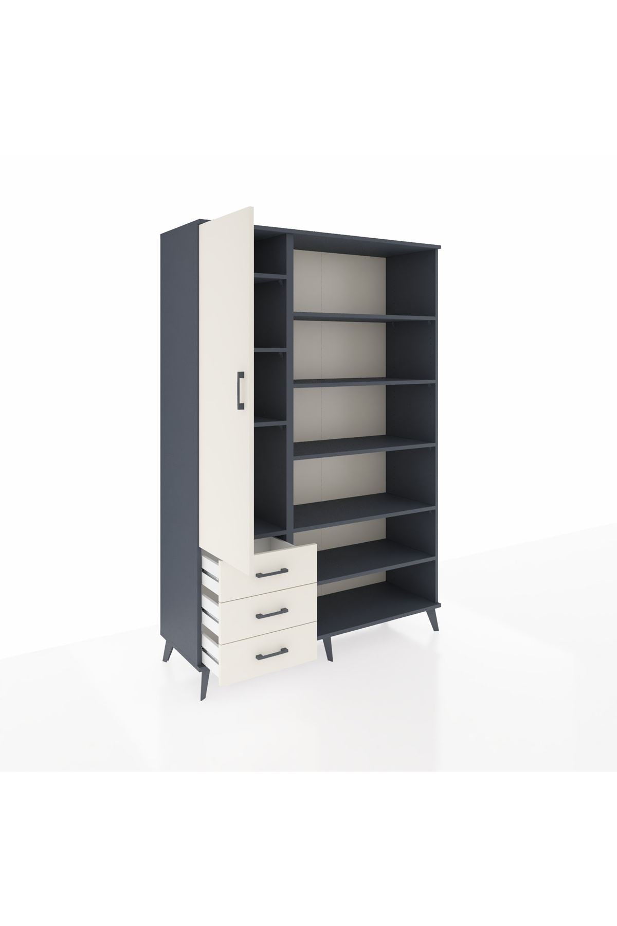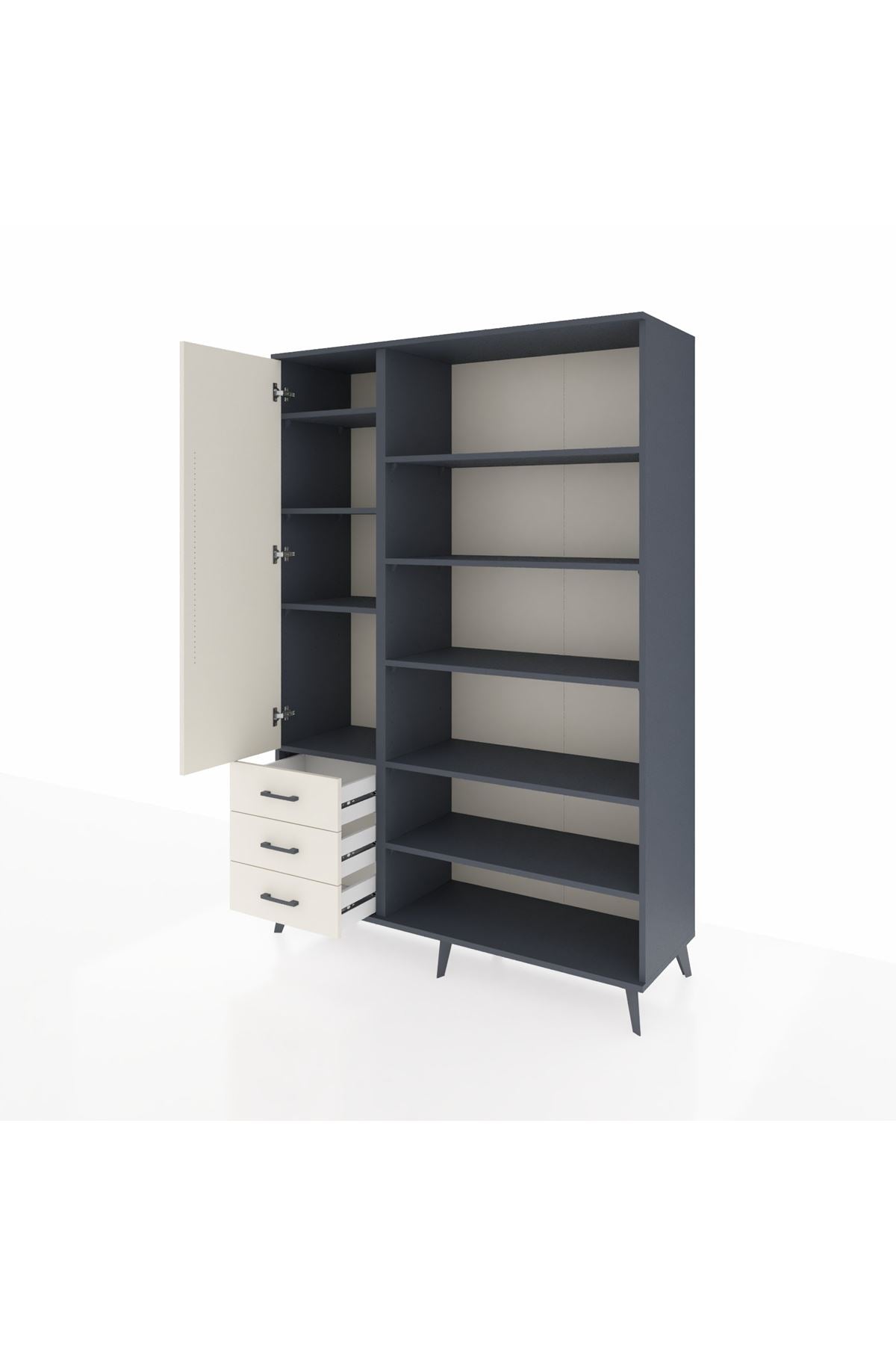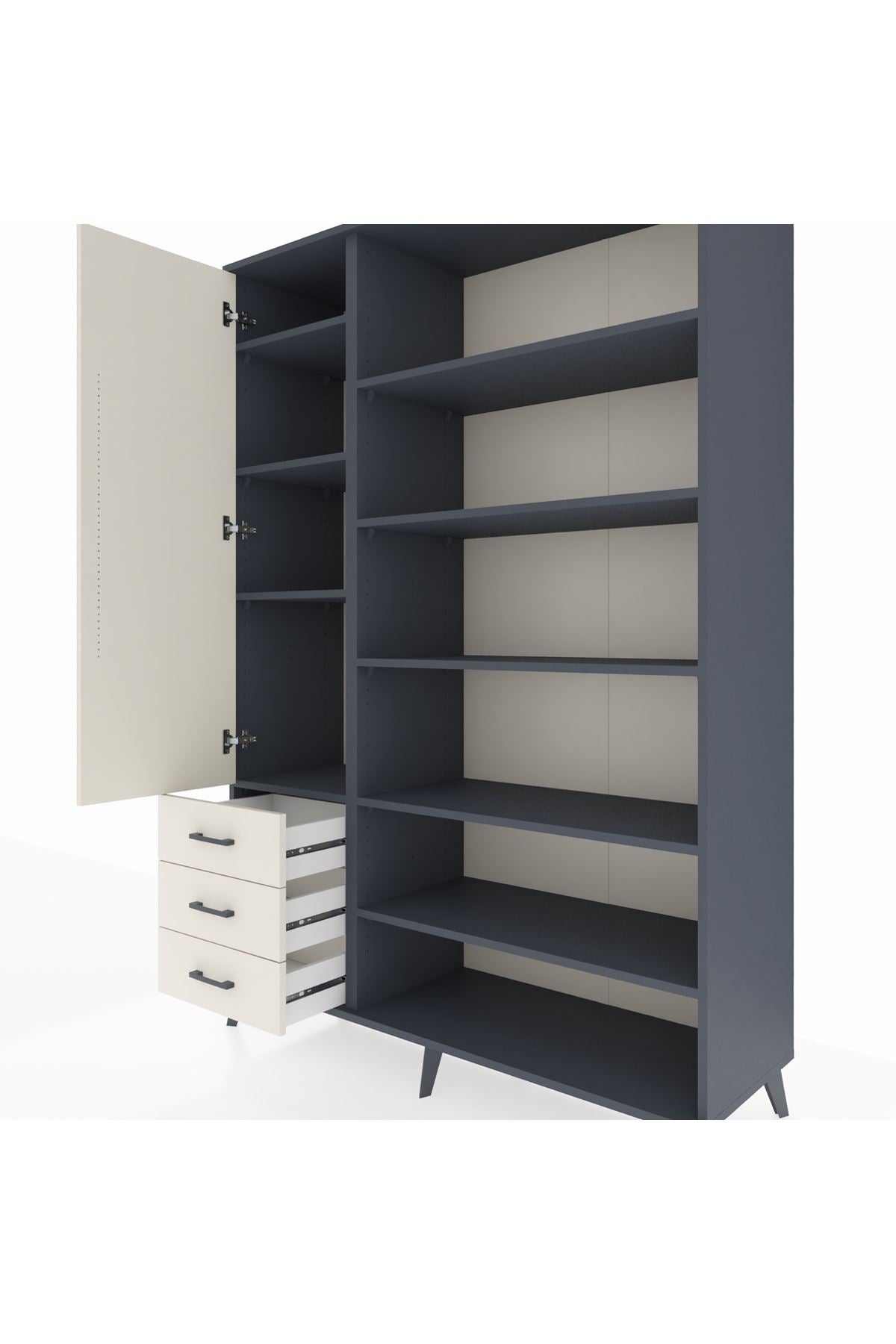 Geniş iç hacmi ve 9 rafı sayesinde kitaplar, dosyalar, saklama kutuları ve günlük eşyalar düzenli şekilde saklanır. Kapaklı bölme kişisel eşyalar ve kıyafetlerinizi toza karşı korur. Üç çekmece ile küçük aksesuarlar, kalemler, kablolar ve evraklar rahatça ayrıştırılabilir. Metal ayaklar zeminde sabit duruş sağlar, temizliği kolaylaştırır. Modüler yapısı ev değişikliklerine uyum gösterir; raf ve çekmece konfigürasyonu yaşam alandan tasarruf etmenize yardımcı olur.