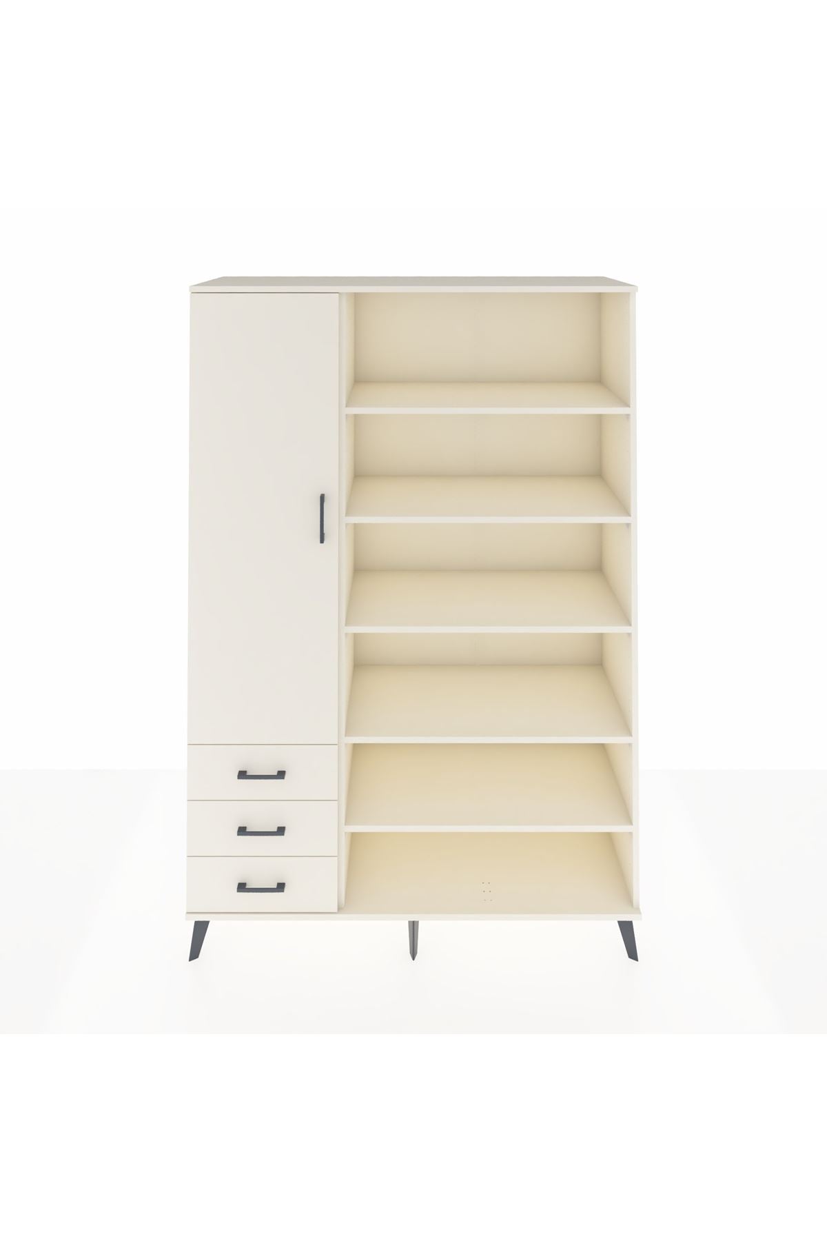 Bu dolap, yaşam alanlarında düzen ve kullanım kolaylığı sağlar. Aytaşı rengi modern bir beyaz tonuyla mekânlara ferahlık katar, antrasit seçeneği daha sofistike ve kontrastlı bir atmosfer sunar, Atlas Çam seçeneği ise sıcak ve doğal bir görünüm sağlar. Metal ayakları sağlamlık ve denge sağlarken metal kulplar estetiksayede uzun ömürlü kullanım sunar. İç kısımda yer alan 9 raf ile küçük eşyalar, tekstil ürünleri ve günlük gereçler rahatça gruplanır; raflar ayarlanabilir özelliktedir, ihtiyaçlarınıza göre yükseklik değişiklikleri yapabilirsiniz. Standart paket 3 çekmece içerir ancak çekmece sayısı konfigüre edilebilir, böylece depolama kapasitesini kullanım alışkanlıklarınıza göre kişiselleştirebilirsiniz.