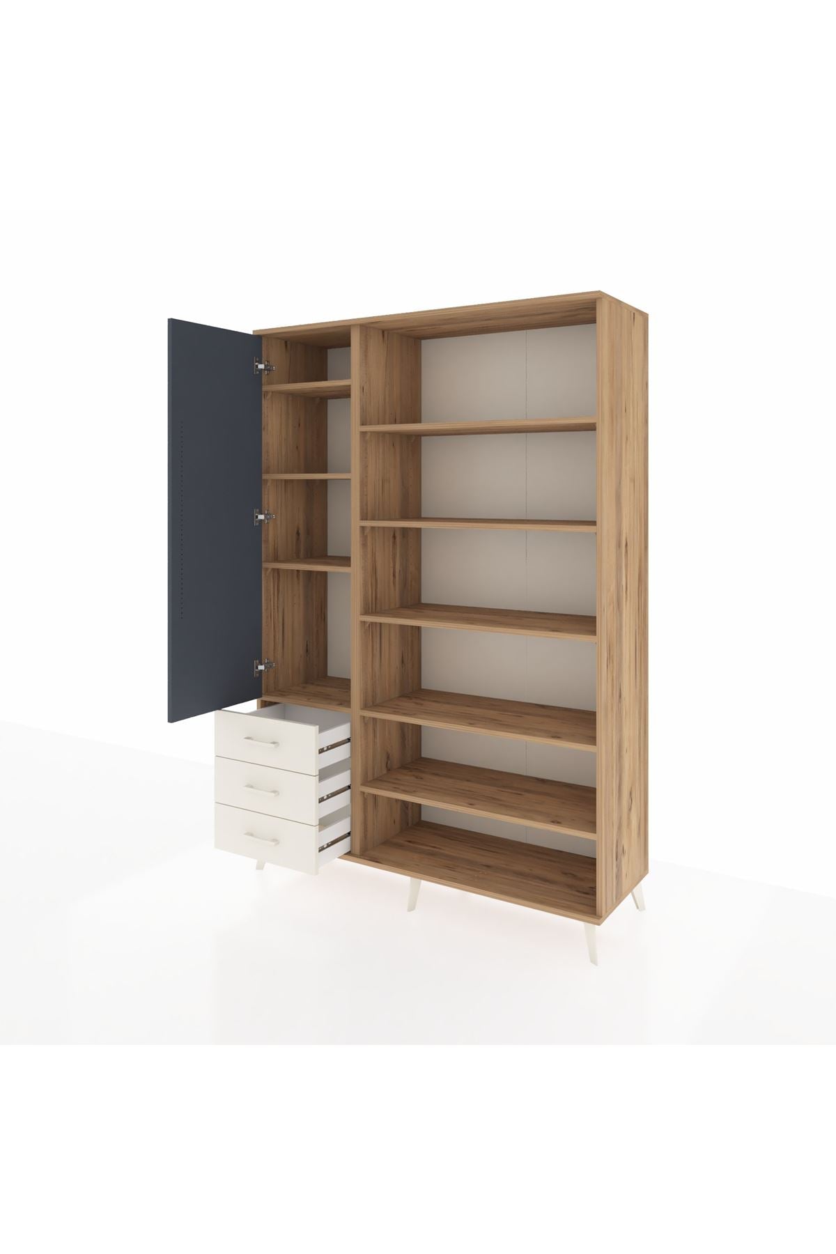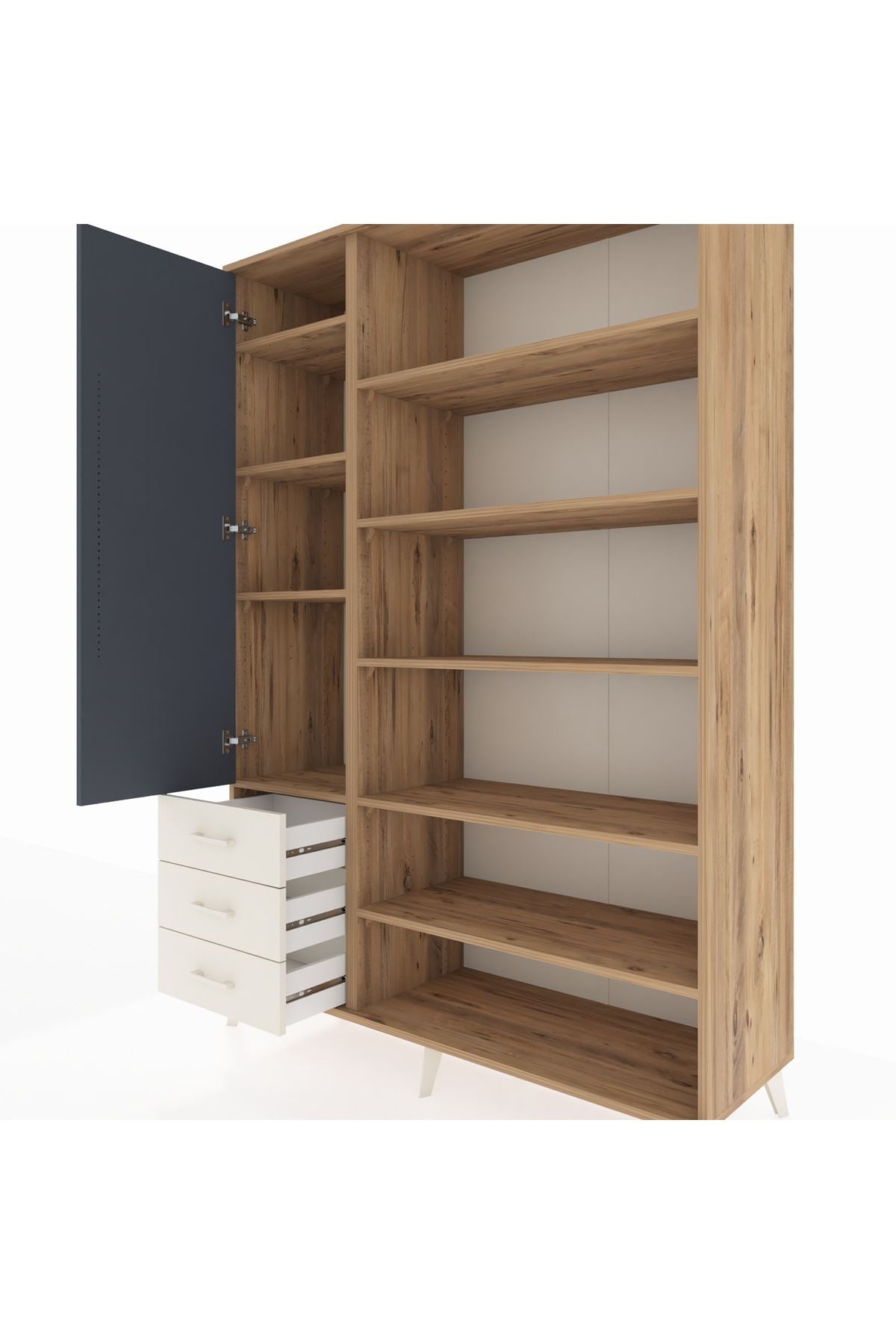 Geniş iç hacmi ve dokuz adet rafı ile günlük kullanım eşyalarını, kıyafetleri veya hobi malzemelerini düzenli bir şekilde saklamaya yardımcı olur. Ayarlanabilir raflar sayesinde farklı yüksekliklerde eşya yerleştirme imkânı mevcuttur; yüksek objeler veya küçük kutular için raflar kolayca konumlandırılabilir. Üç çekmece özelleştirilebilir yapıdadır; ihtiyaç halinde çekmece sayısı konfigüre edilebilir, bu sayede depolama çözümleri kişisel gereksinimlere uyum sağlar. Kapaklı bölme, toz ve görünürlükten koruma sağlar; açık raflar ise sergileme ve hızlı erişim için idealdir. Dayanıklı suntalam yüzey kolay temizlenir ve günlük aşınmalara karşı direnç gösterir.