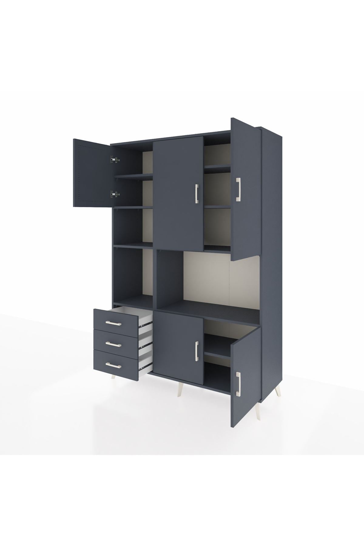 Bu dolap, evinizde düzen ve kullanım kolaylığı sağlar. Antrasit rengi mat yüzey, modern ve sade hatlarla her dekorasyona uyum sağlar. Metal ayakları sağlam ve dayanıklı yapı sunar; metal kulplar ise sık kullanımda bile uzun ömürlü performans verir. 9 raflı düzeni, 3 çekmece ve 5 kapaklı bölmeleri ile küçük parçaları saklamaktan büyük eşyaları düzenlemeye kadar geniş kullanım imkanı tanır. Raflar ayarlanabilir; ihtiyaca göre dikey bölmeleri yeniden düzenleyerek farklı yüksekliklerde depolama alanı yaratabilirsiniz. Çekmece sayısı konfigüre edilebilir; tercihinize göre ekstra çekmece ekletme veya azaltma opsiyonları mevcuttur.