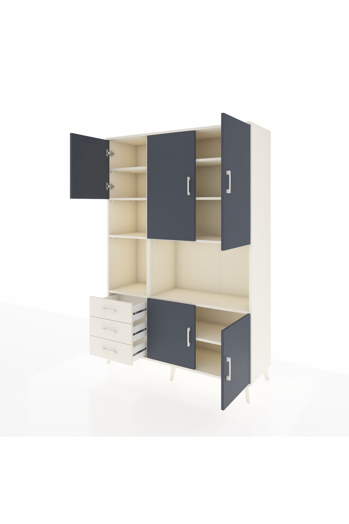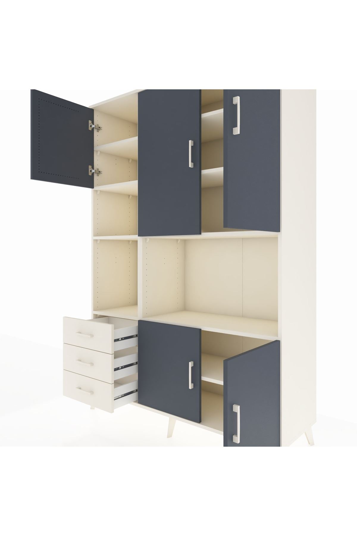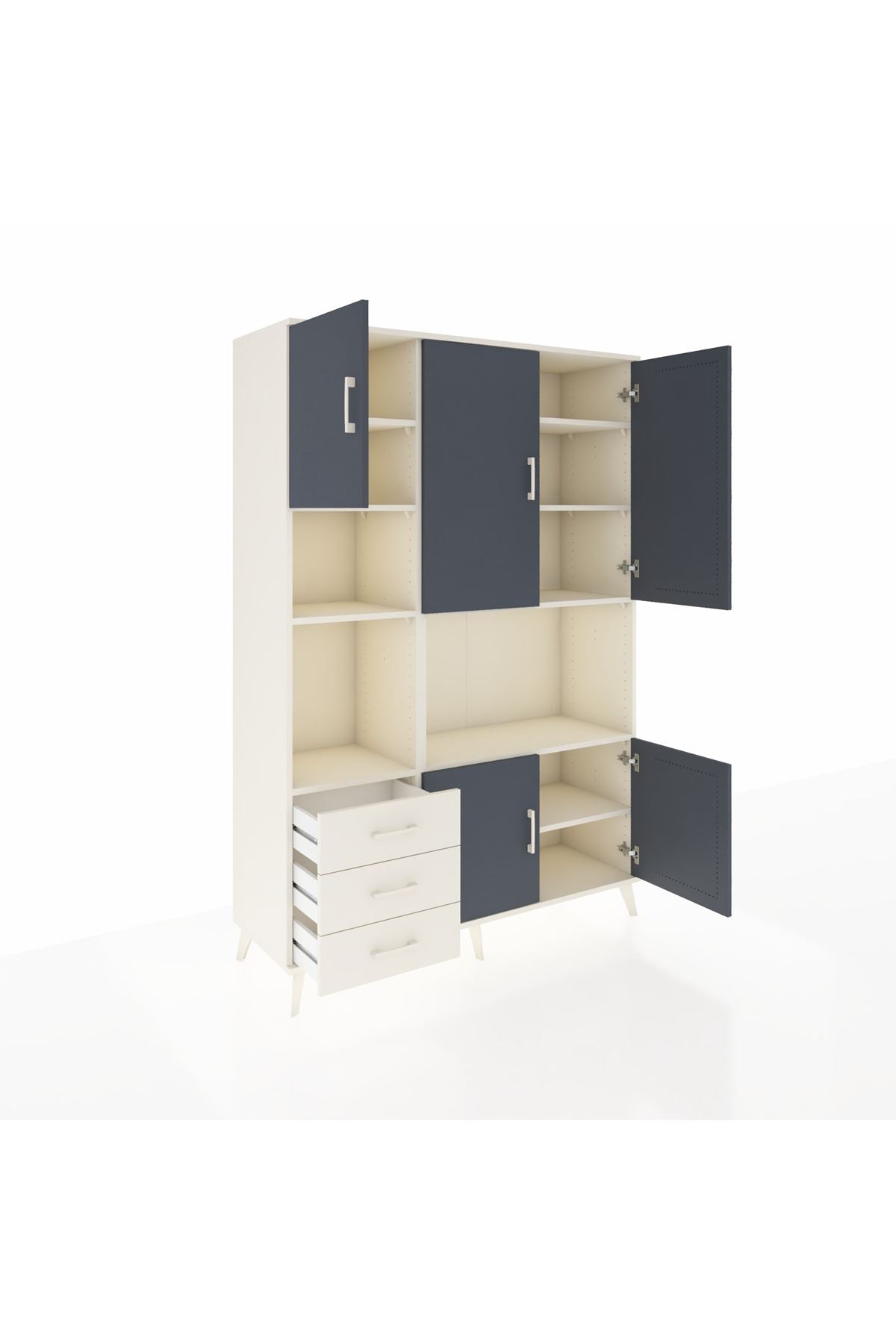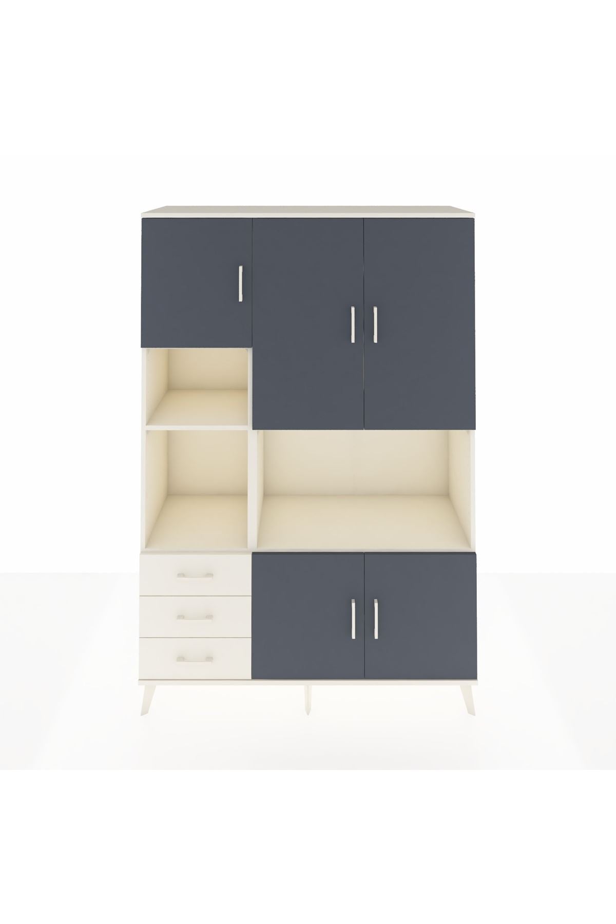 Çok bölmeli iç yapısı sayesinde farklı ebatlardaki eşyaları ayrı ayrı düzenleme imkanı verir. Ayarlanabilir raflar kitaplar, kutular veya mutfak gereçleri gibi farklı yükseklik gerektiren eşyalar için kolay uyum sağlar. Açık bölmeler dekoratif obje veya sık kullanılan aksesuarlar için hızlı erişim sunarken kapaklı kısımlar tozdan koruma sağlar. Çekmece sayısı konfigüre edilebilir özelliği ile 3 çekmeceyi ihtiyacınıza göre artırıp azaltarak kişisel kullanımınıza göre düzenleyebilirsiniz. Metal ayaklar zeminden yükseltme sağlayarak temizlik kolaylığı ve nem riskinin azaltılmasına yardımcı olur.