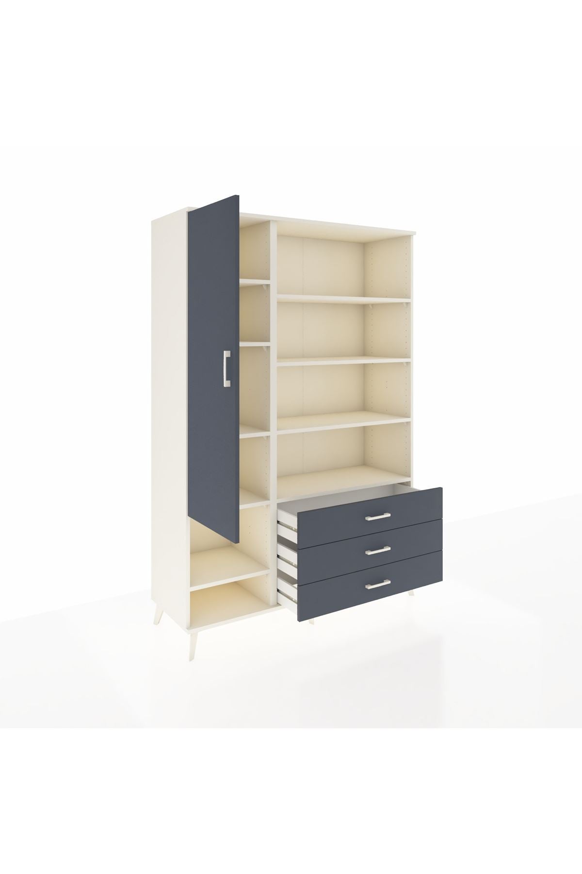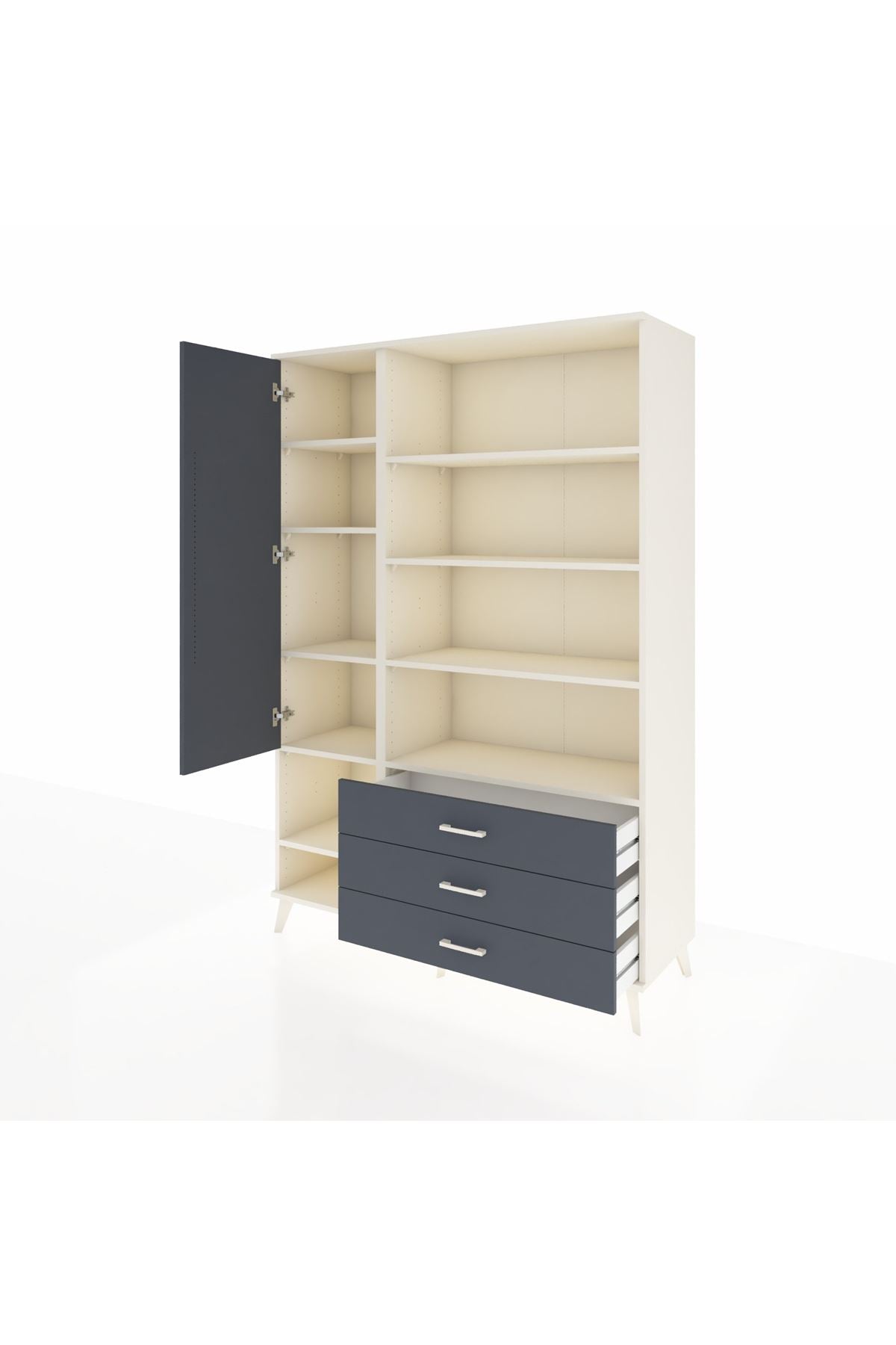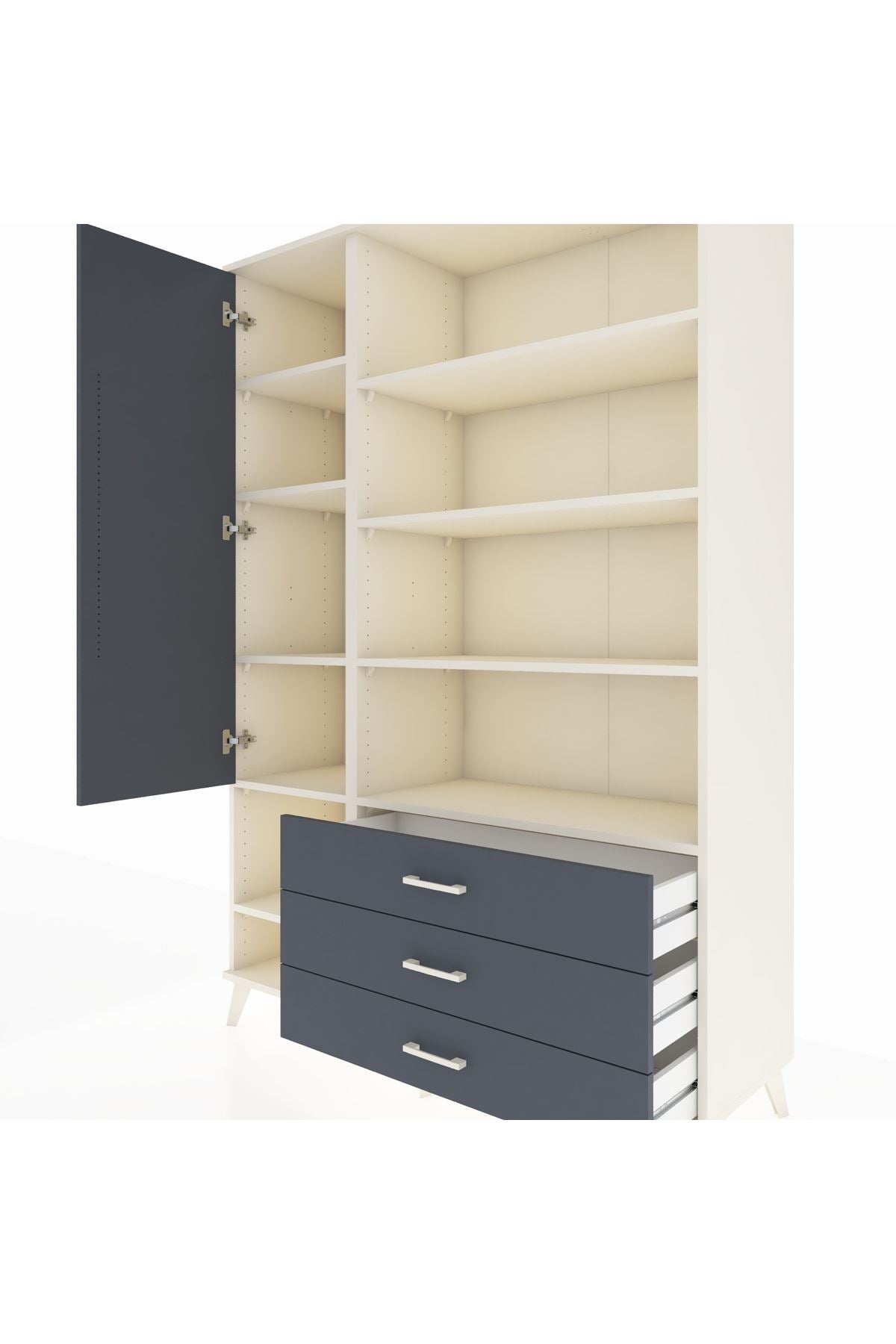 Geniş iç hacim ve 9 raf ile farklı boyutlardaki eşyalarınızı düzenli tutar. Açık raf düzeni sık kullanılan kitap, hobi malzemesi veya dekoratif objeleri sergilemeye uygundur; kapağı olan bölüm değerli veya tozlanmasını istemediğiniz eşyalar için güvenli saklama sağlar. Çekmeceler organize depolama sunar; çekmece sayısı konfigüre edilebilir, ihtiyaca göre 2, 3 veya daha fazla çekmece tercih edilebilir. Raflar ayarlanabilir, raf aralıkları farklı yüksekliklerde düzenlenebilir. Kompakt derinlik (44 cm) koridor veya küçük odalar için ideal yerleşim imkanı verir.