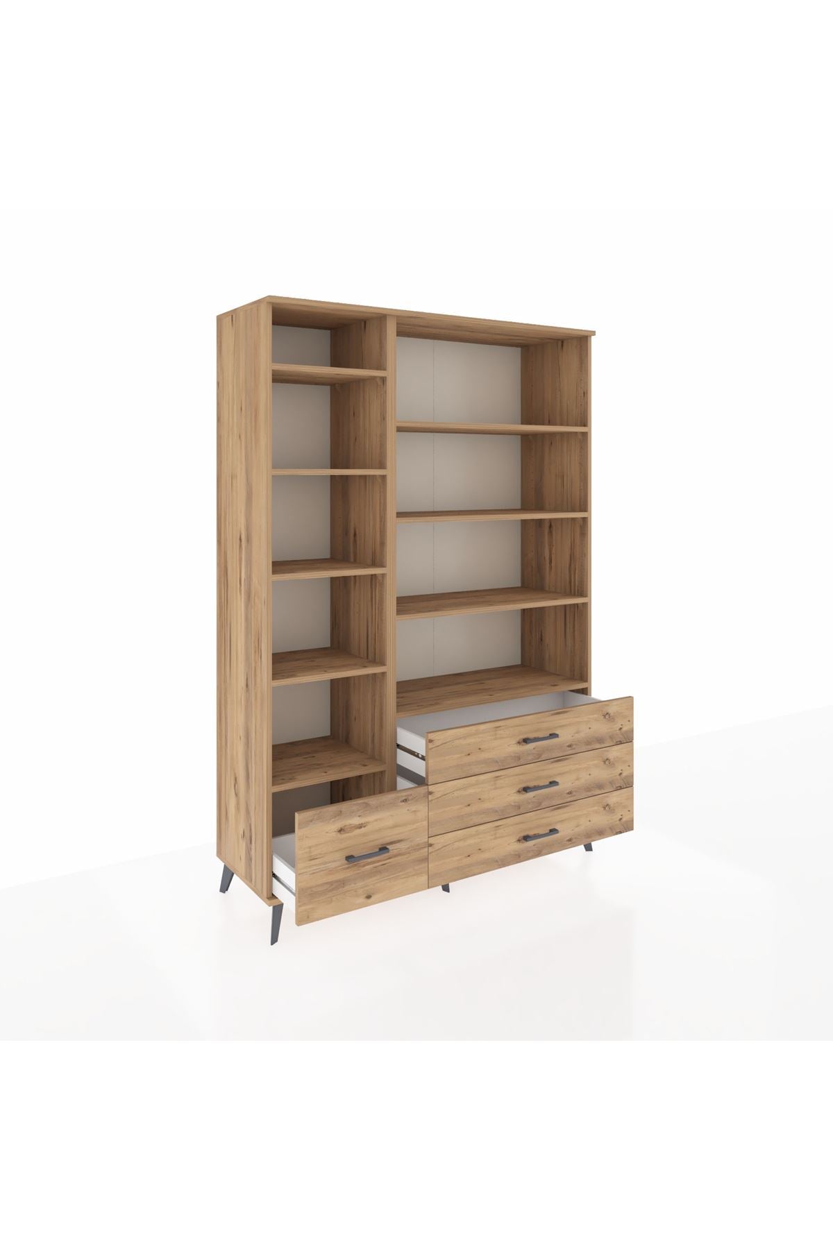 Geniş iç hacim ve 9 adet raf, kitaplardan ofis evraklarına, kırtasiye malzemelerinden mutfak gereçlerine kadar çok yönlü depolama sağlar. Rafların ayarlanabilir olması, yüksek objeler veya küçük kutular için esneklik sunar. Alt bölümdeki çekmeceler küçük eşyaları düzenli tutmayı kolaylaştırır; kulpların ergonomik yapısı çekme işlemini konforlu kılar. Metal ayak tasarımı taşıma sırasında oluşabilecek nem ve kirden uzak tutarak dolabın ömrünü uzatır. Modüler yapı sayesinde çekmece sayısı isteğe göre artırılabilir veya azaltılabilir, montaj süreci hediye şarjlı vidalama setiyle hızlı ve zahmetsizdir.