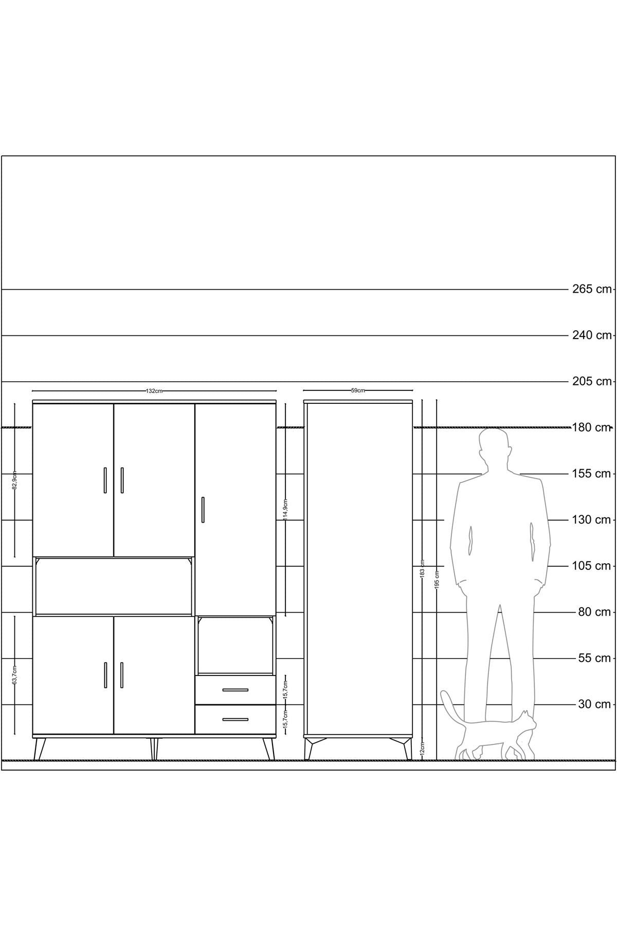 Geniş iç hacim ve 10 raflı düzen, kıyafet, kitap, ofis malzemesi veya depolama kutularını kategorize etmenize yardımcı olur. 2 çekmece, küçük eşyalar ve belgeler için ayrı bölmeler sunar; çekmece sayısı ihtiyaçlara göre konfigüre edilebilir. Beş kapak, içerikleri tozdan korurken iç mekânda düzen görünümü oluşturur. Sağlam suntalam yüzey temizliği kolaylaştırır ve uzun yıllar kullanım sunar. Metal ayak yüksekliği zeminden uzak tutarak nem ve lekelenmelere karşı avantaj sağlar.