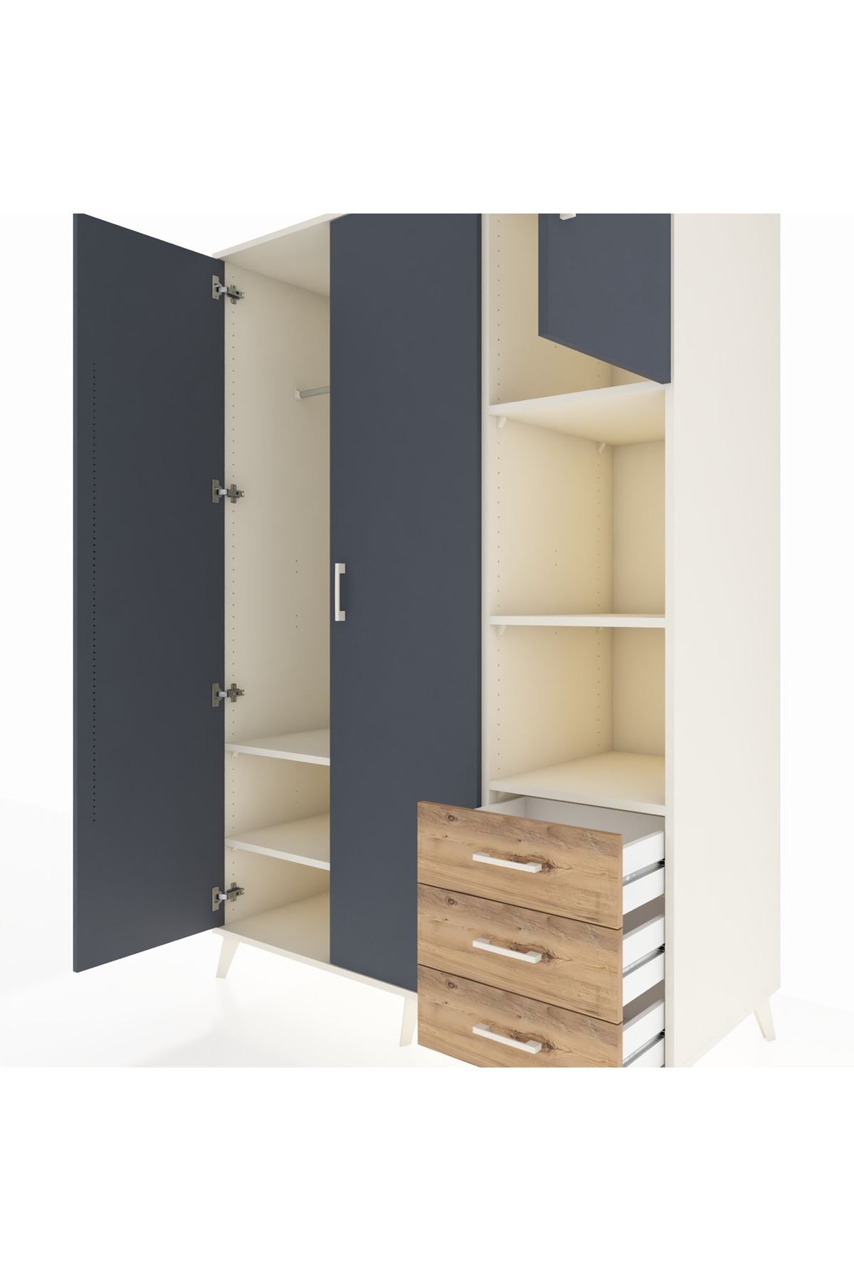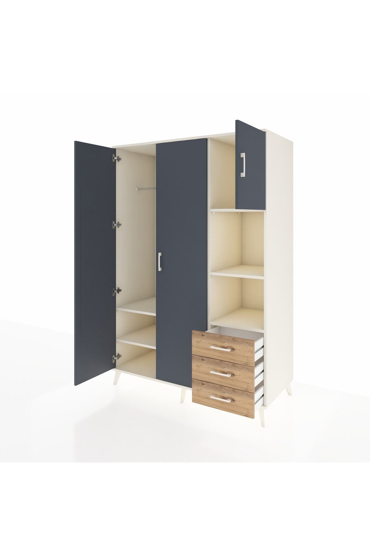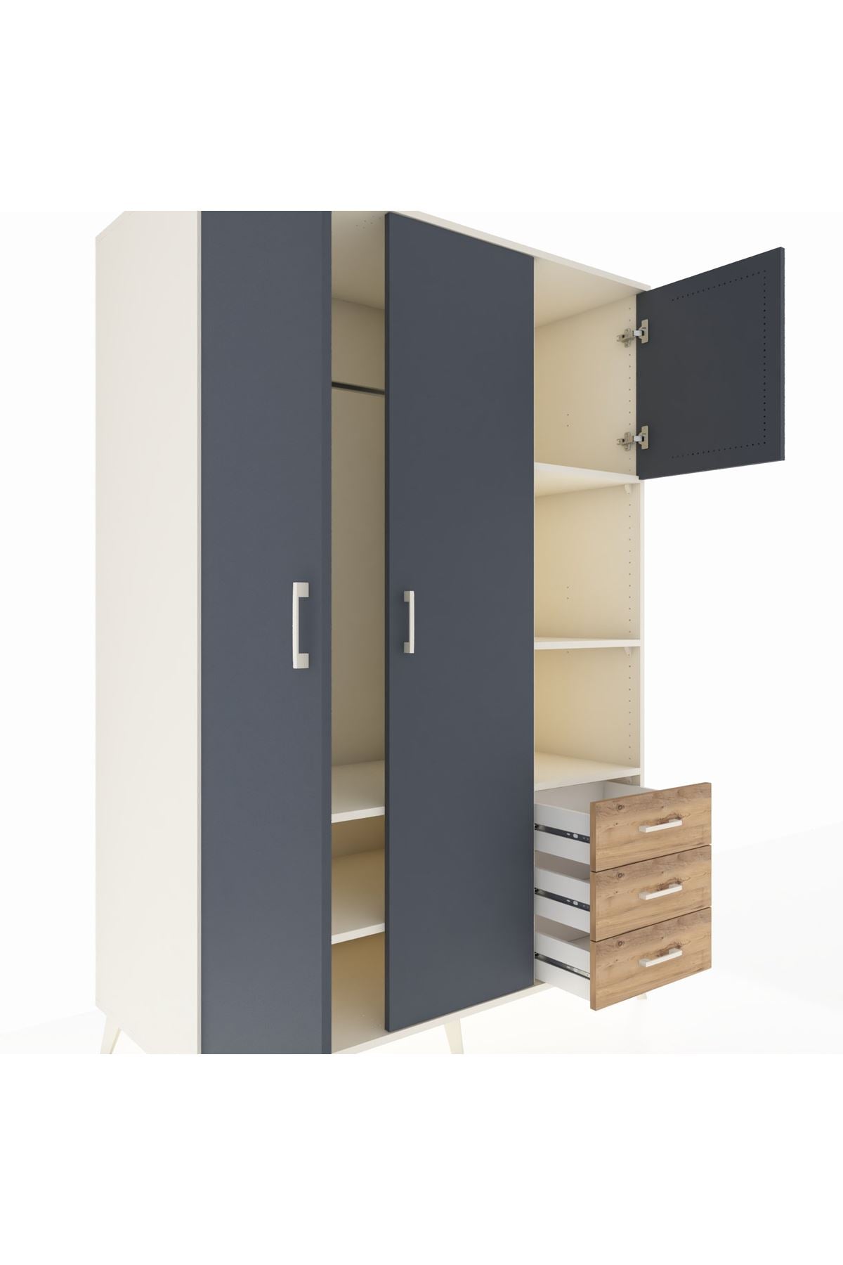 Geniş iç hacmi ve beş raflı düzeni sayesinde kıyafet, havlu, temizlik malzemesi ve ofis gereçleri gibi farklı eşyaları kategorize ederek depolamaya uygun. Raflar ayarlanabilir olduğu için yüksek eşyalar veya küçük kutular için kolayca yeniden düzenleme yapılabilir. Çekmece sayısı konfigüre edilebilir yapısıyla kullanım ihtiyacınıza göre üç çekmecenin tamamı veya bir kısmı çıkarılarak farklı kombinasyonlar oluşturulabilir. Metal ayak tasarımı zeminden yükseltme yaparak nem ve kir birikimini azaltır, alt temizlik ve taşıma kolaylığı sağlar.