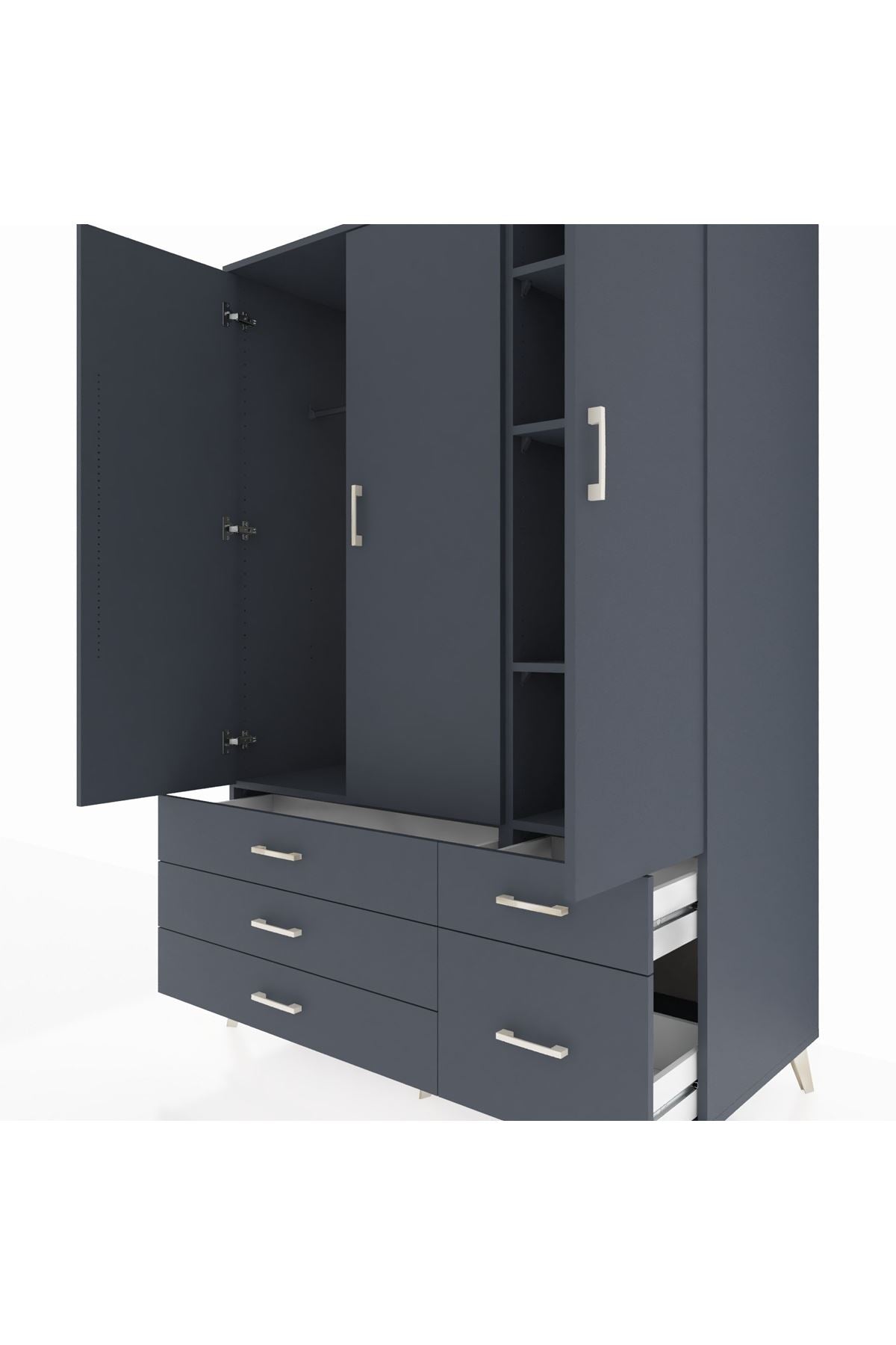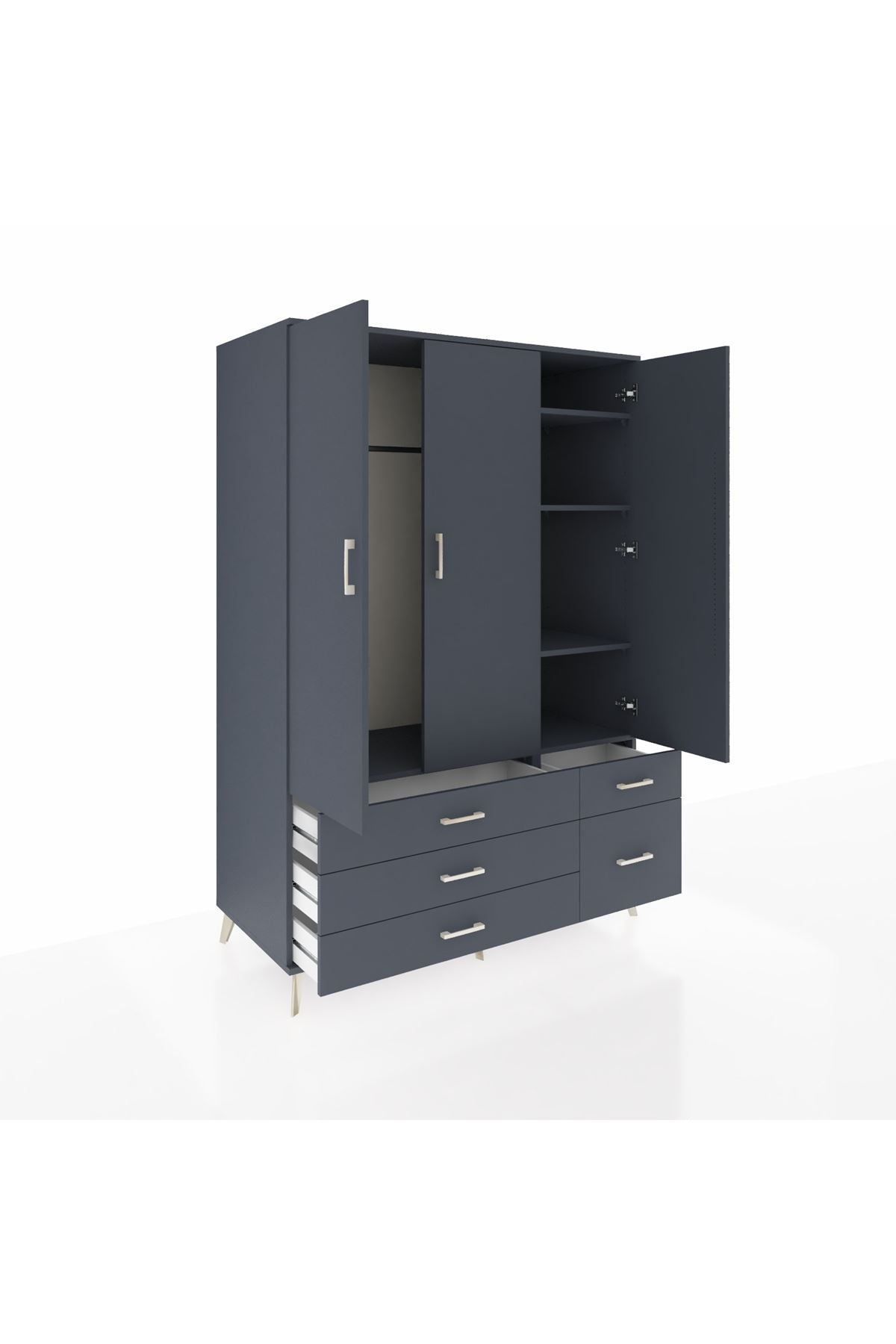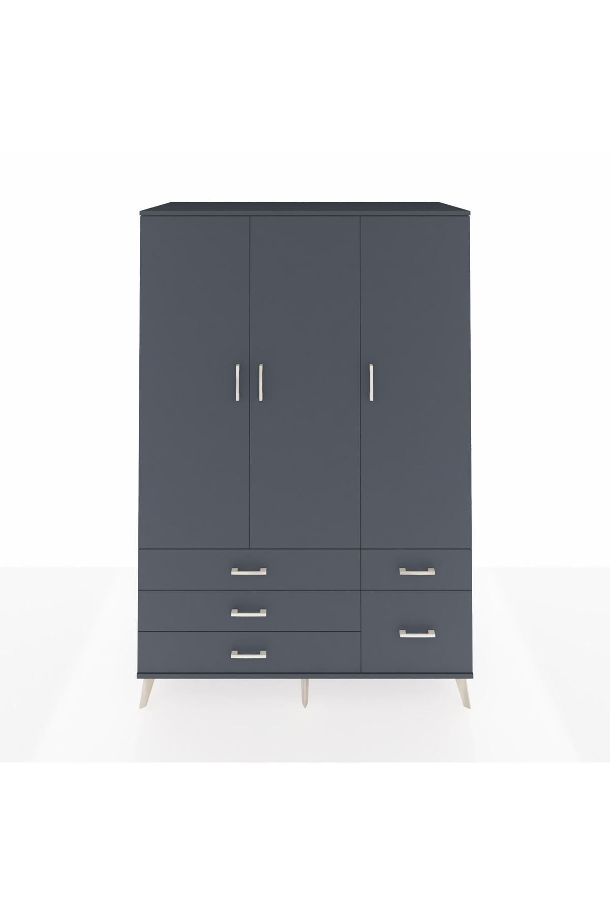 Bu dolap, düzen ve estetik için maksimum depolama çözümü sağlar. Antrasit rengi mat ve çağdaş bir atmosfer yaratarak odalara modern bir dokunuş katar. Sadeliği ön plana çıkaran düz paneller ve zarif metal kulplar, kullanım kolaylığını estetikle birleştirir. Metal ayakları sağlam ve dayanıklı, metal kulplar uzun ömürlü kullanım sunar. İç kısımda yer alan tek askı bölmesi geniş kıyafet asma alanı sağlar; beş adet raf, ihtiyaçlara göre ayarlanabilir yapıda tasarlanmıştır ve farklı boyutlardaki eşyalar için esnek depolama imkânı verir. Alt kısımda konumlandırılmış beş çekmece, iç düzenleme gereksinimlerinize uygun şekilde konfigüre edilebilir; çekmece yerleşimi ve adedi isteğe göre düzenlenebilir.