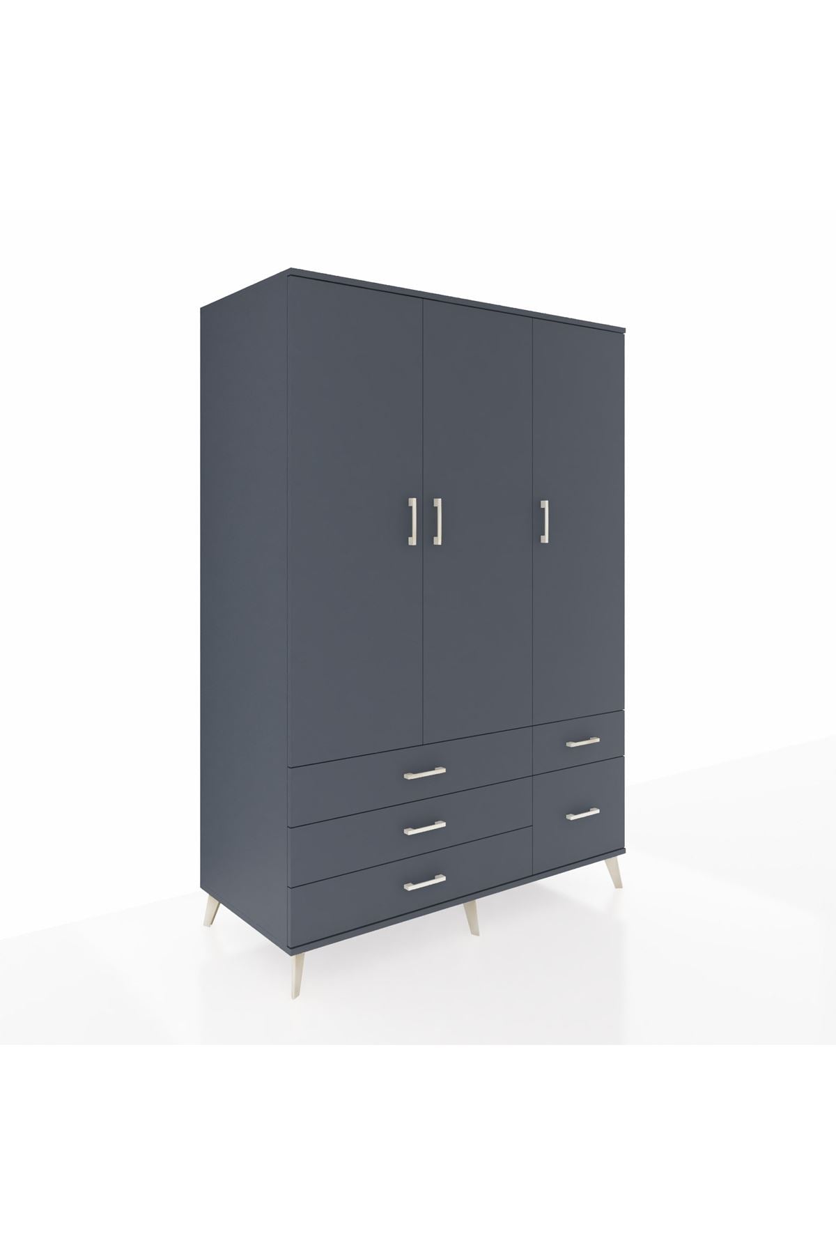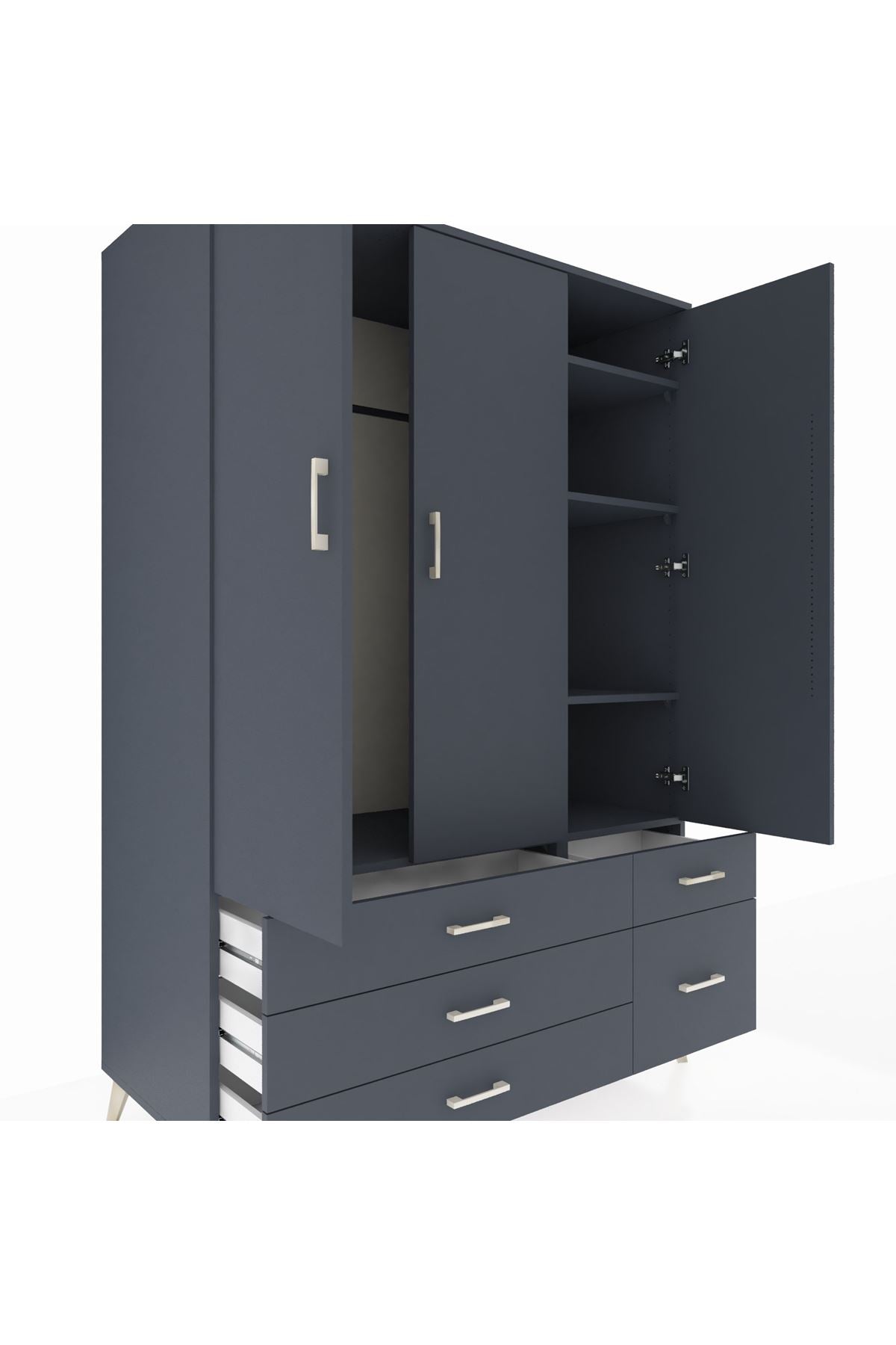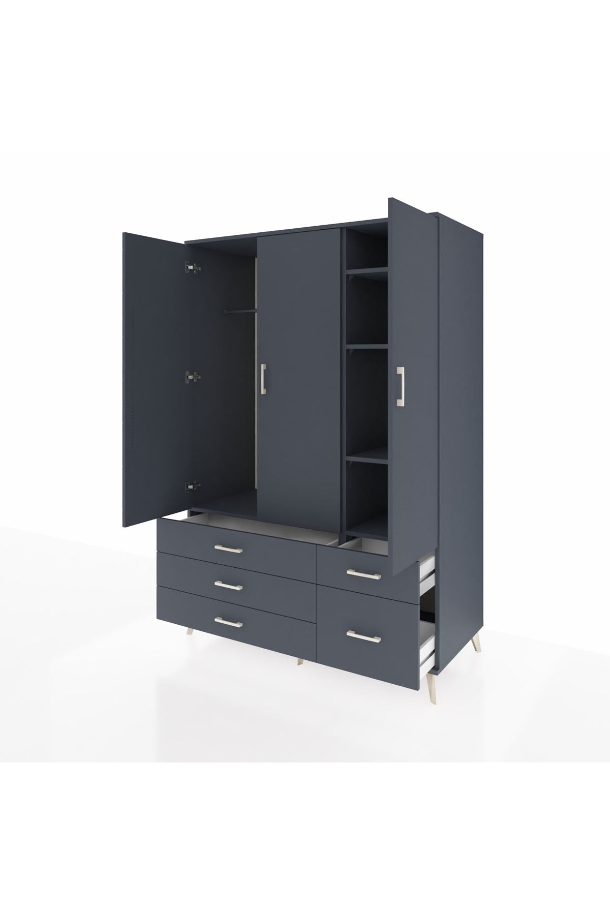Bu dolap, düzen ve estetik için maksimum depolama çözümü sağlar. Antrasit rengi mat ve çağdaş bir atmosfer yaratarak odalara modern bir dokunuş katar. Sadeliği ön plana çıkaran düz paneller ve zarif metal kulplar, kullanım kolaylığını estetikle birleştirir. Metal ayakları sağlam ve dayanıklı, metal kulplar uzun ömürlü kullanım sunar. İç kısımda yer alan tek askı bölmesi geniş kıyafet asma alanı sağlar; beş adet raf, ihtiyaçlara göre ayarlanabilir yapıda tasarlanmıştır ve farklı boyutlardaki eşyalar için esnek depolama imkânı verir. Alt kısımda konumlandırılmış beş çekmece, iç düzenleme gereksinimlerinize uygun şekilde konfigüre edilebilir; çekmece yerleşimi ve adedi isteğe göre düzenlenebilir.