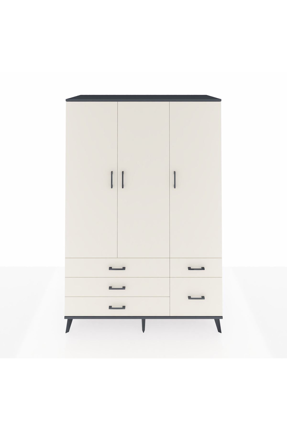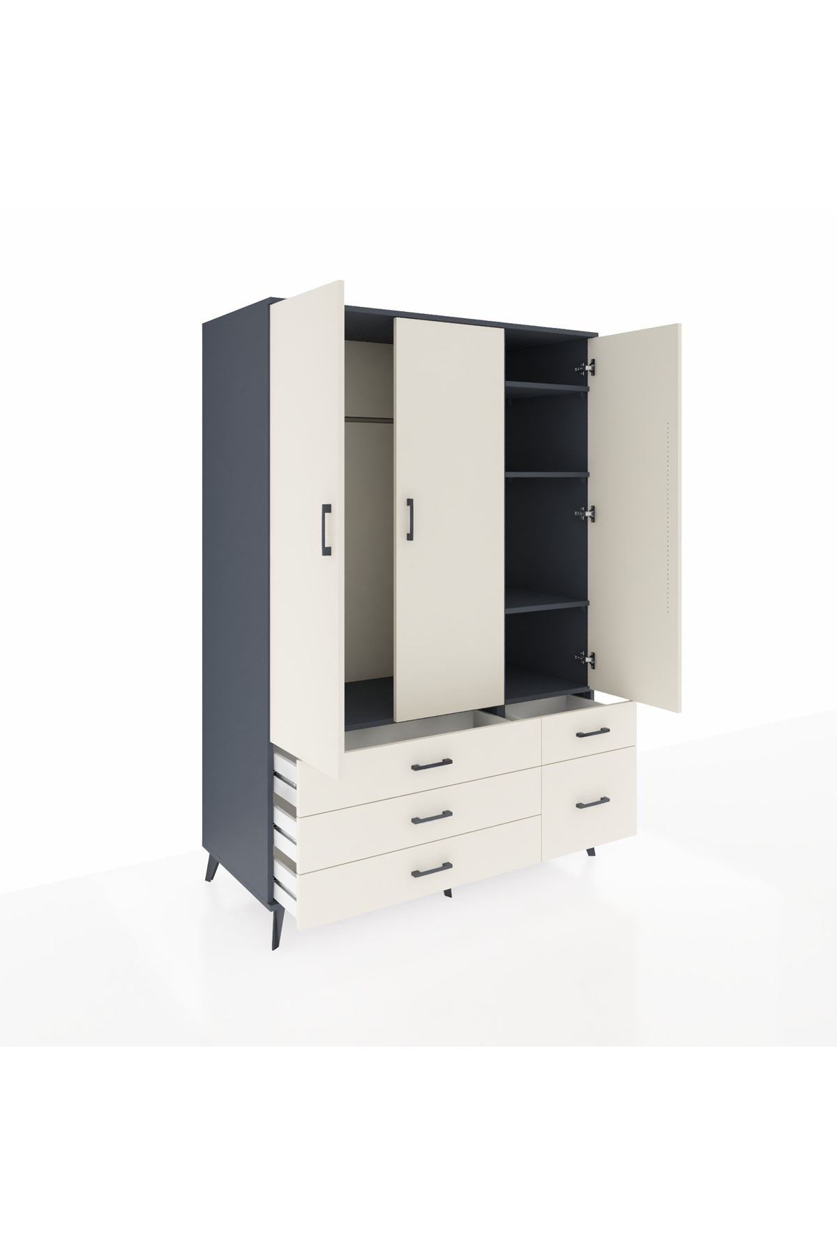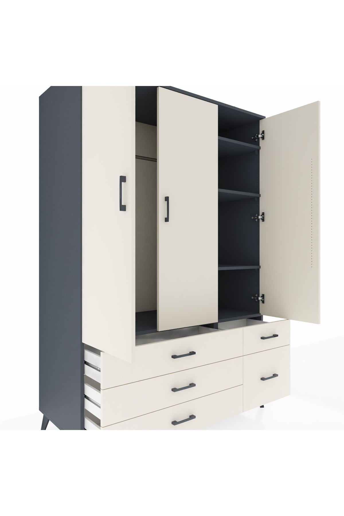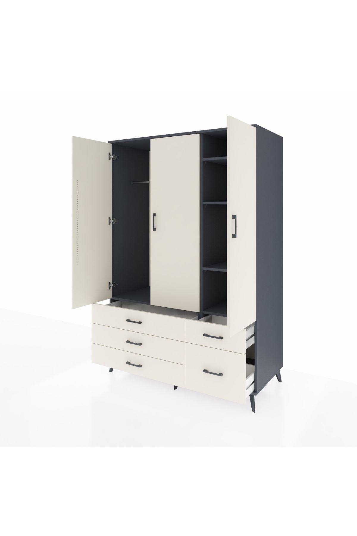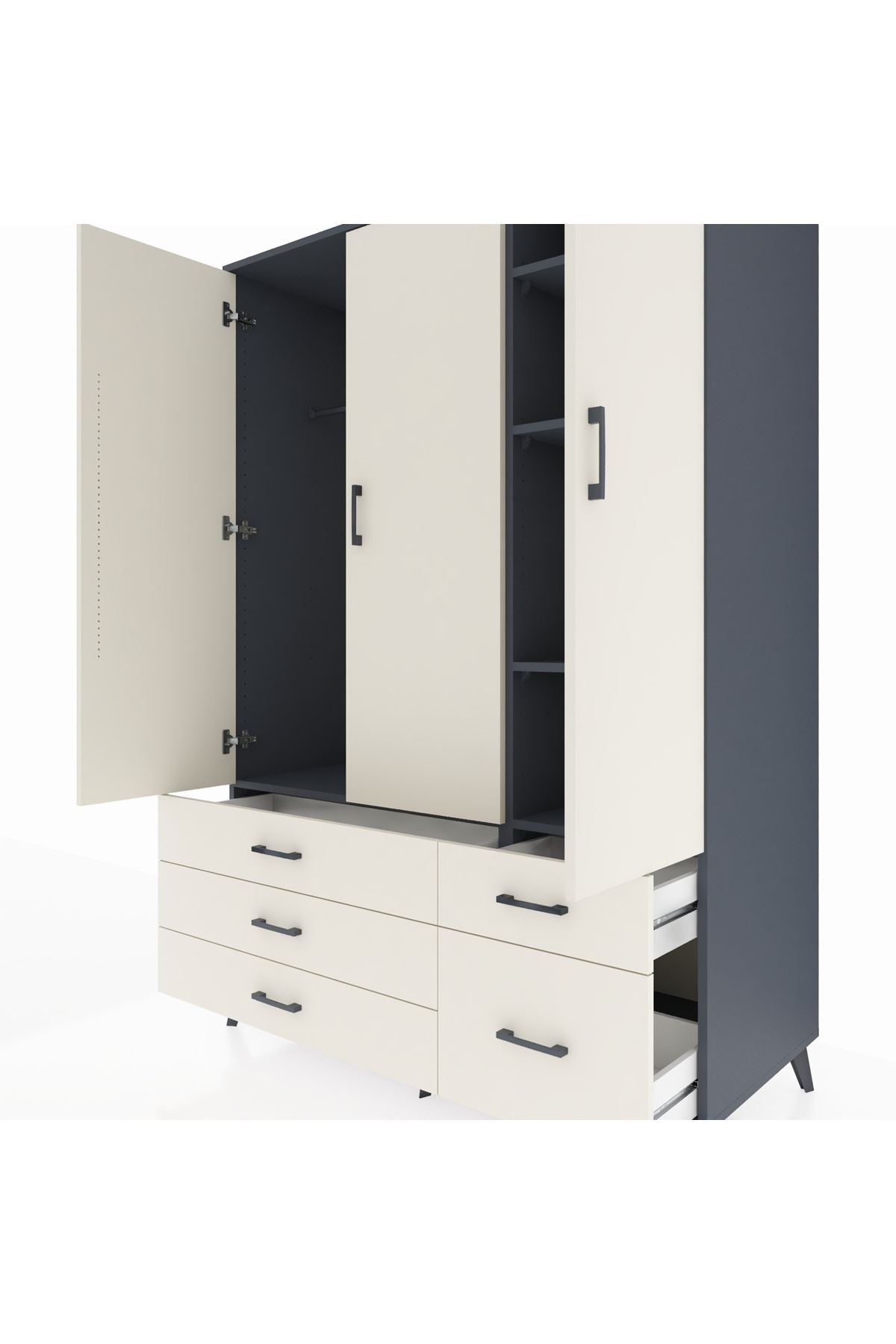 Geniş iç hacmi sayesinde kıyafet, aksesuar ve ev tekstilini düzenli biçimde saklama imkanı verir. Tek askılı tasarım uzun elbiseler ve ceketler için ideal askı yüksekliği sunar. Beş adet ayarlanabilir raf, farklı ebatlardaki eşyalarınızı kolayca organize etmenizi sağlar; raf konumu ihtiyaçlarınıza göre değiştirilebilir. Beş çekmece konfigüre edilebilir; çekmece sayısını kullanımınıza göre azaltıp artırabilirsiniz. Metal ayak yapısı temizlik ve yerden yükseklik avantajı sağlar; dolabın altını süpürme ve mop ile temizlik kolaylaşır.