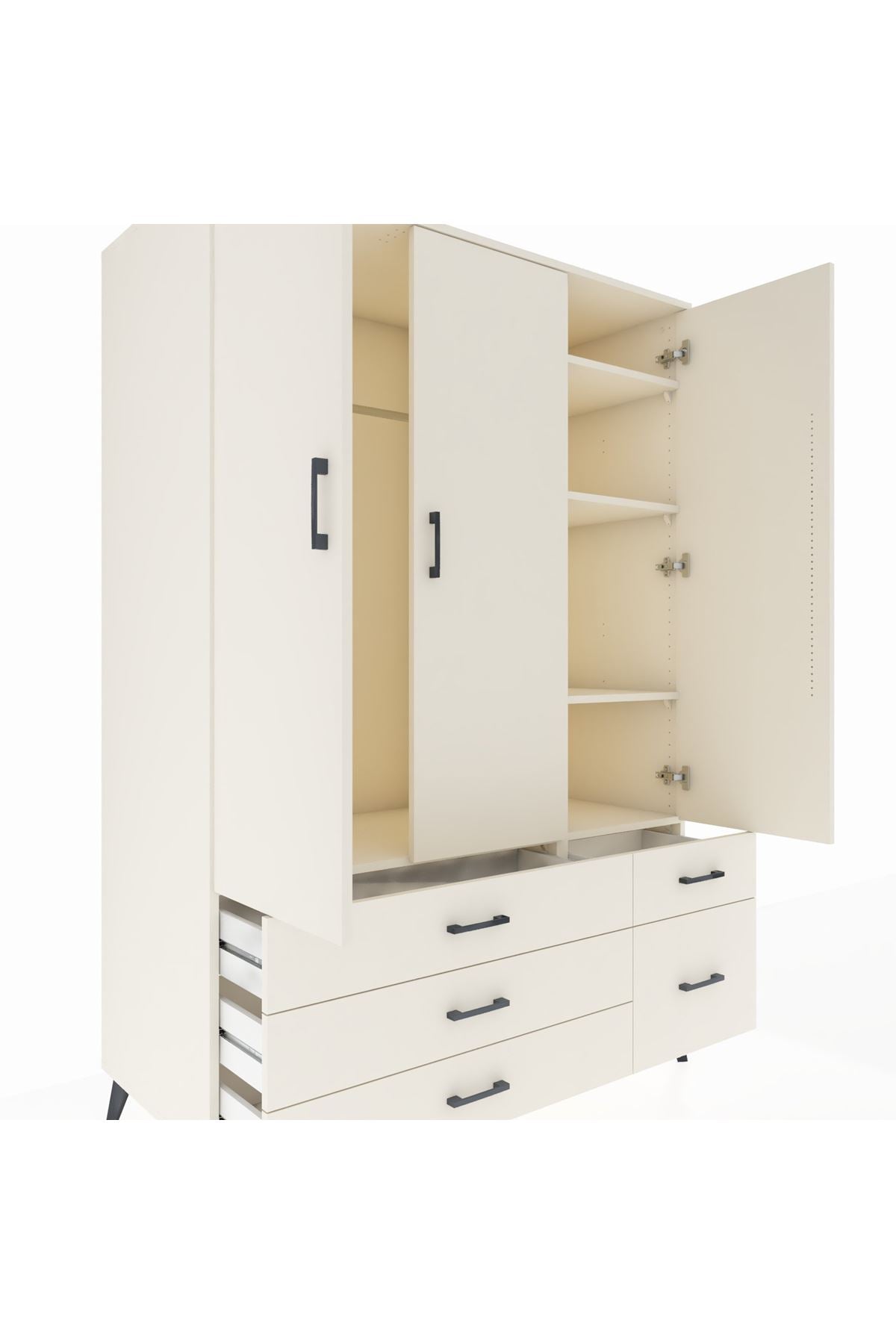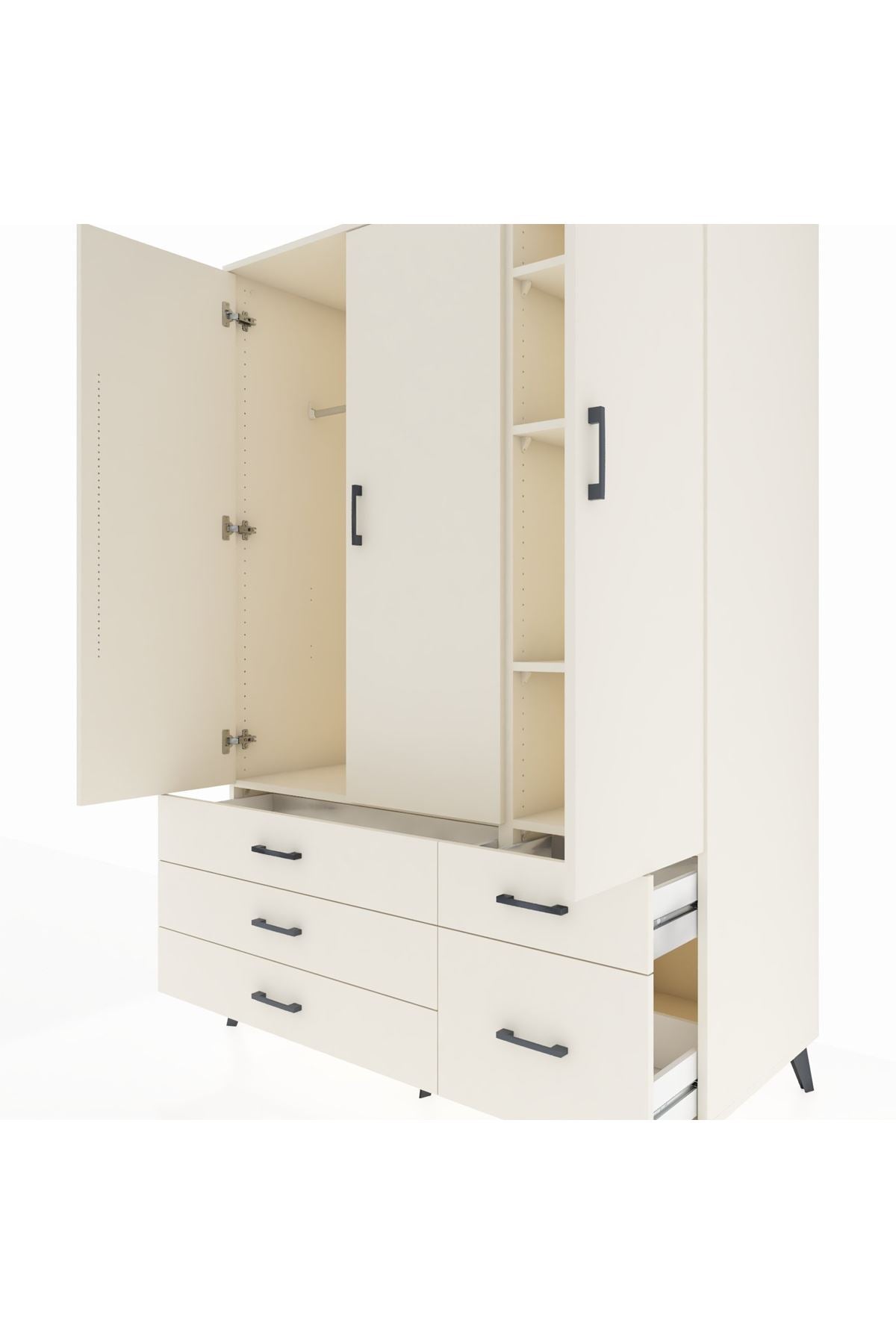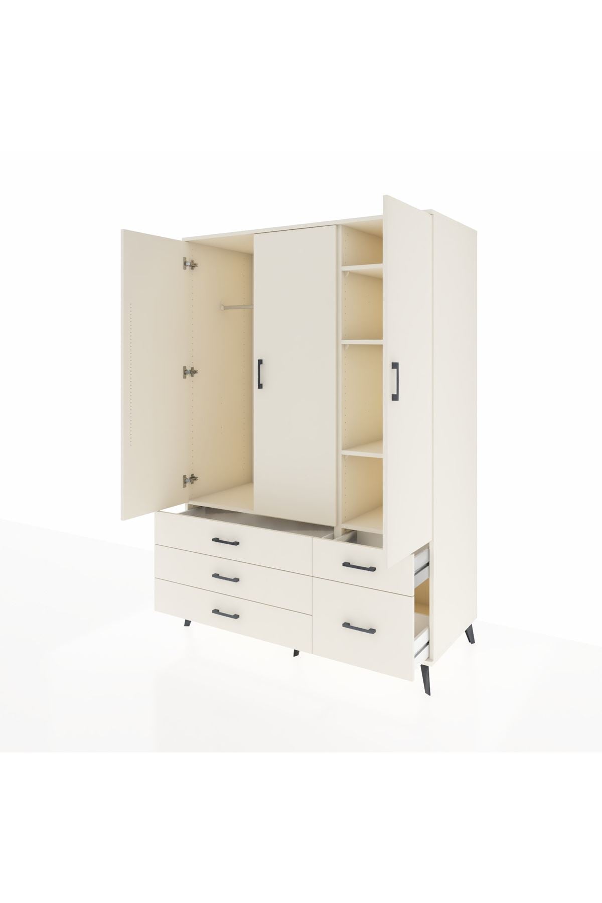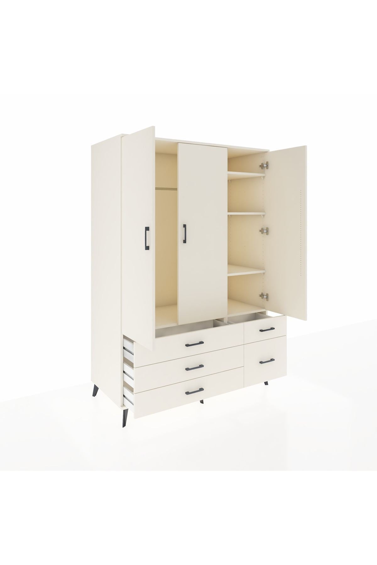 Bu dolap, yaşam alanlarında düzen ve kullanım kolaylığı sağlar. Aytaşı, Antrasit ve Atlas Çam renk seçenekleri odanıza uyum sağlar; düz yüzeyleri ve zarif hattı modern bir duruş sunar. Metal ayakları sağlam ve dayanıklı, metal kulplar uzun ömürlü kullanım sunar. İç bölümde tek askı alanı günlük kıyafetlerinizi asmak için ideal, beş raf eşya veya kutularla düzen kurmayı kolaylaştırır; raflar ayarlanabilir, çekmece sayısı konfigüre edilebilir ve farklı ihtiyaçlara göre uyarlanabilir.