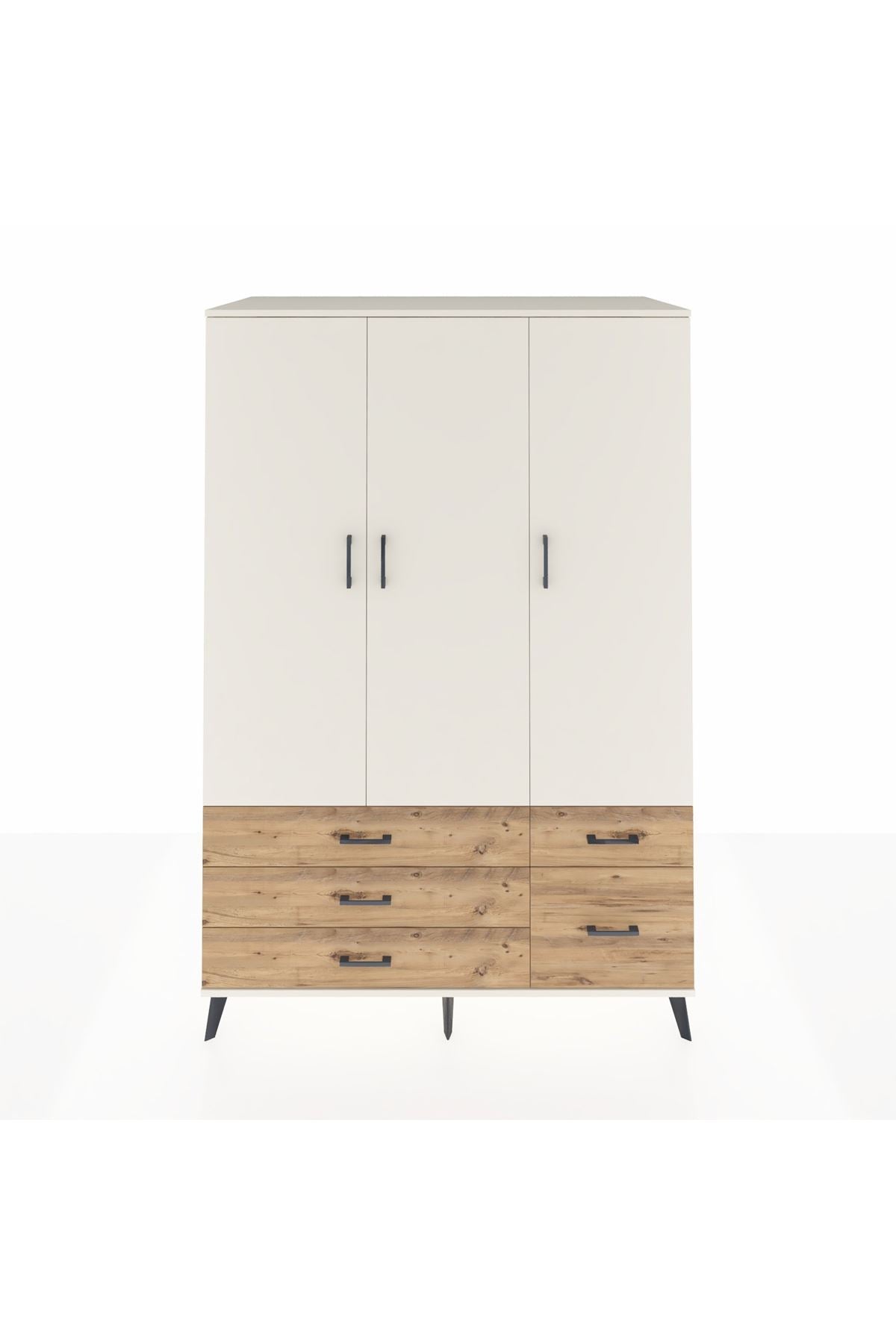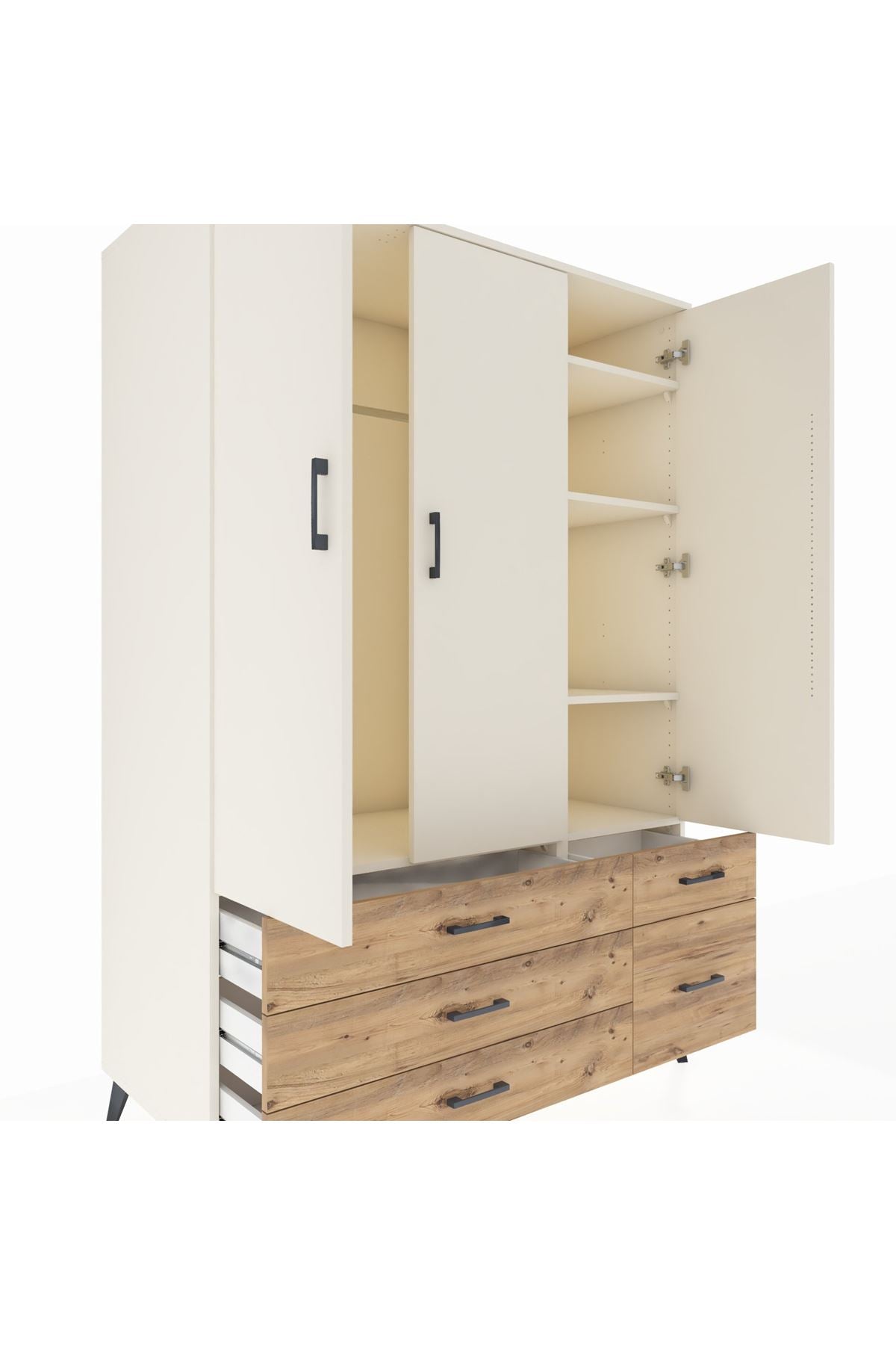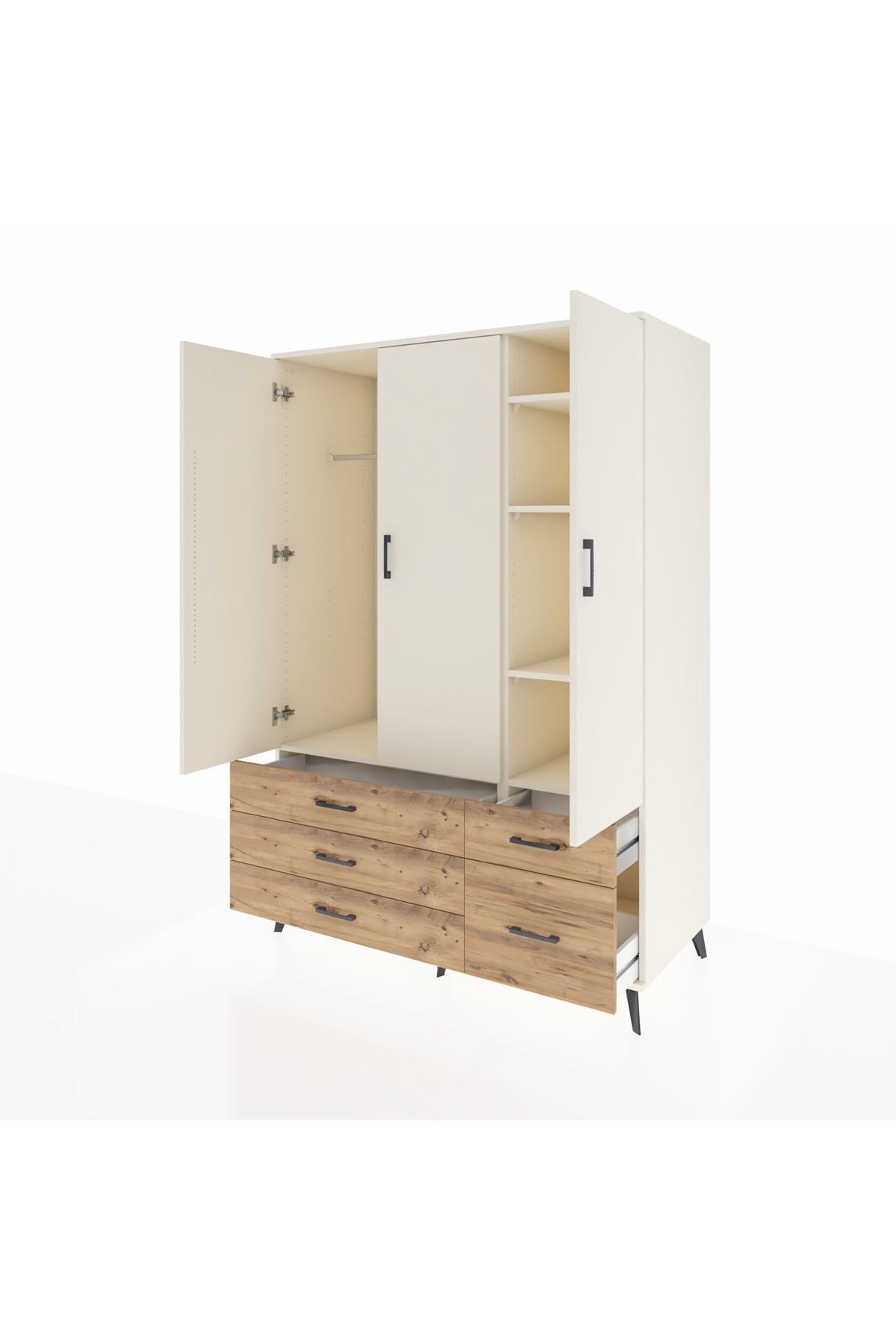 Bu dolap, alanınızı düzenleyip depolama kapasitenizi artırarak yaşam ve çalışma alanlarında düzen sağlar. Aytaşı rengi modern, ferah bir atmosfer sunarken Atlas Çam yüzeyler doğal ahşap dokusunu mekâna taşır; Antrasit seçeneği ise daha güçlü ve şık bir etki verir. Metal ayakları sağlam ve dayanıklı, metal kulplar uzun ömürlü kullanım sunar. İç düzen; 5 raflı bölmeleri ve 5 çekmecesi ile farklı eşya gruplarını ayrı tutmaya uygun şekilde tasarlanmıştır. Raflar ayarlanabilir, çekmece sayısı konfigüre edilebilir; ihtiyaca göre düzenleme yapılabilir.