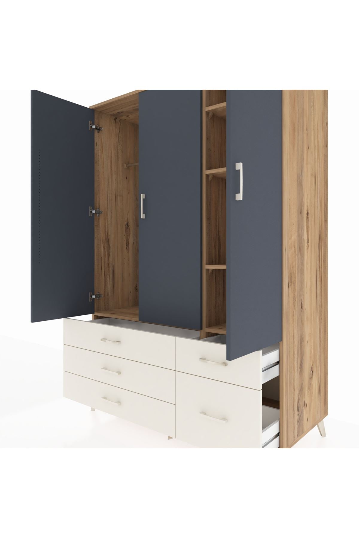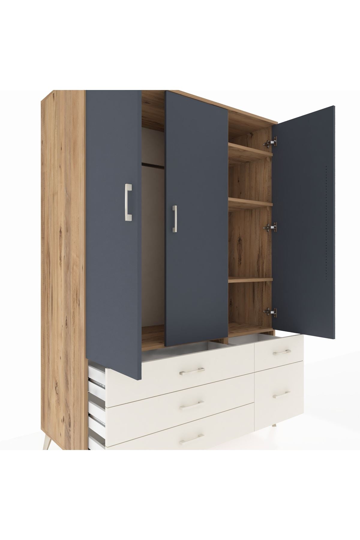 Yatak odasında giysi, çarşaf, yastık ve sezonluk montlar için merkezi bir depolama çözümü sunar. Tek askılı bölme uzun kaban ve elbiseler için uygundur; çekmeceler iç çamaşırı ve aksesuar düzenlemesi için idealdir. Ayarlanabilir raflarla ayakkabı kutuları veya saklama kutuları düzenlenebilir, üst yüzey dekoratif objeler veya kullanım eşyaları için ekstra alan oluşturur.