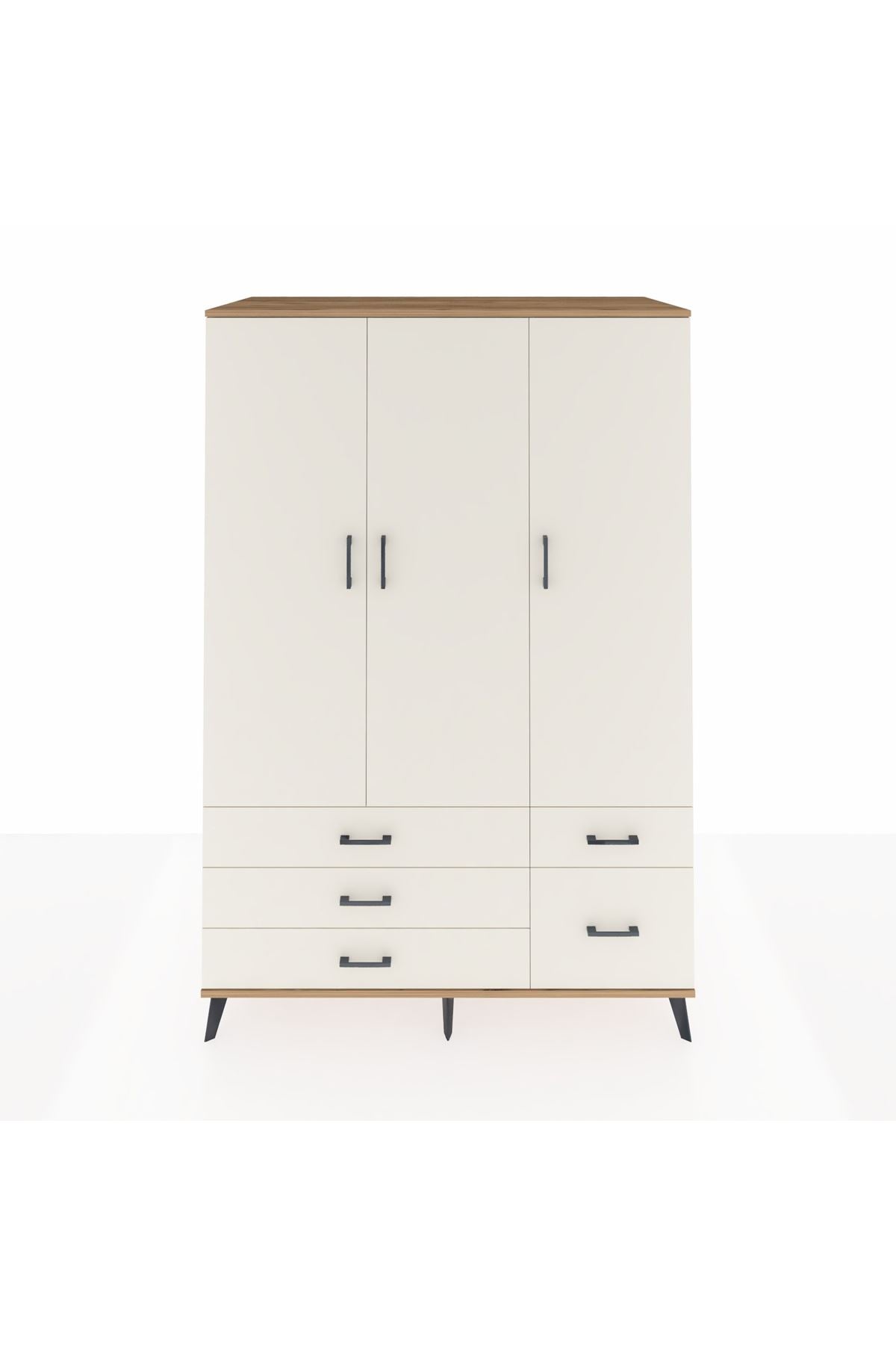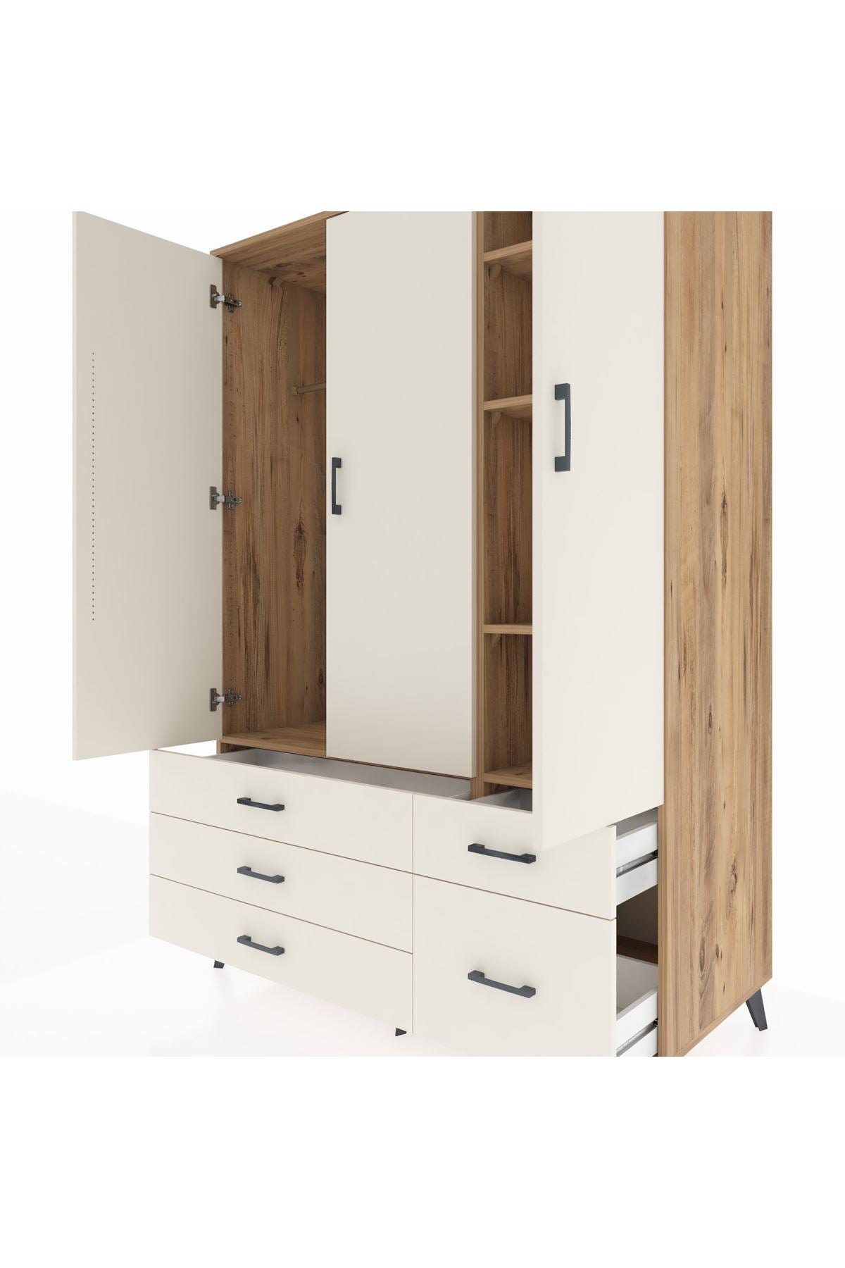 Geniş iç hacim ve beş raflı düzen, günlük kıyafetlerin, mevsimlik montların ve çamaşırların düzenli saklanmasını sağlar. Beş çekmece, iç organizasyonu kolaylaştırır; çekmece sayısını konfigüre ederek farklı ihtiyaçlara uygun düzenlemeler yapabilirsiniz. Ayarlanabilir raflarla kitap, kutu veya aksesuar yerleşimi optimize edilir. Metal detaylar estetik bir görünüm verirken dayanıklılığı artırır. Üst yüzey dekoratif kullanım için uygundur; çiçek, ayna veya kişisel aksesuarlarla kombinlenebilir. Hızlı montaj için şarjlı vidalama seti hediye olarak gönderilir, detaylı kurulum kılavuzu ile kurulumu rahatça tamamlanır.
