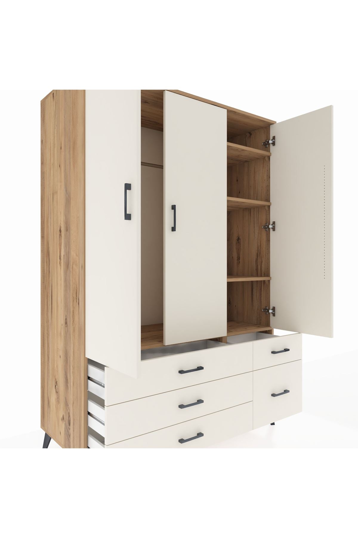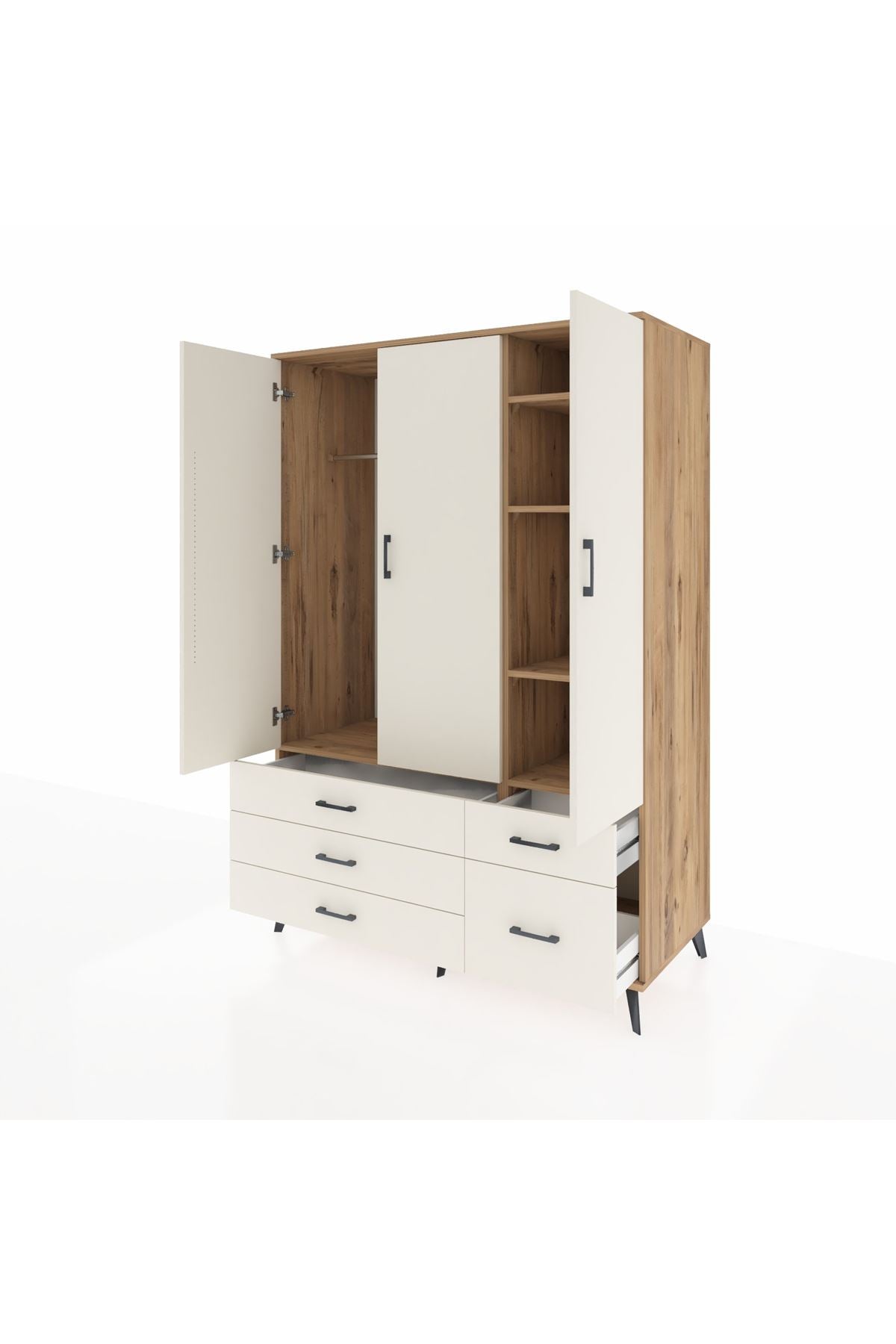 Yatak odasında gardırop ve komodin fonksiyonlarını bir arada sunar. Tek askılı bölme elbiseler, pardösüler ve kabanlar için ideal yüksekliğe sahiptir; çekmeceler çamaşır, iç çamaşırı ve aksesuarlara özel düzen sağlar. Ayarlanabilir raflarla mevsimsel depolama yapılabilir, üst yüzey televizyon altı veya dekoratif düzen için kullanılabilir.