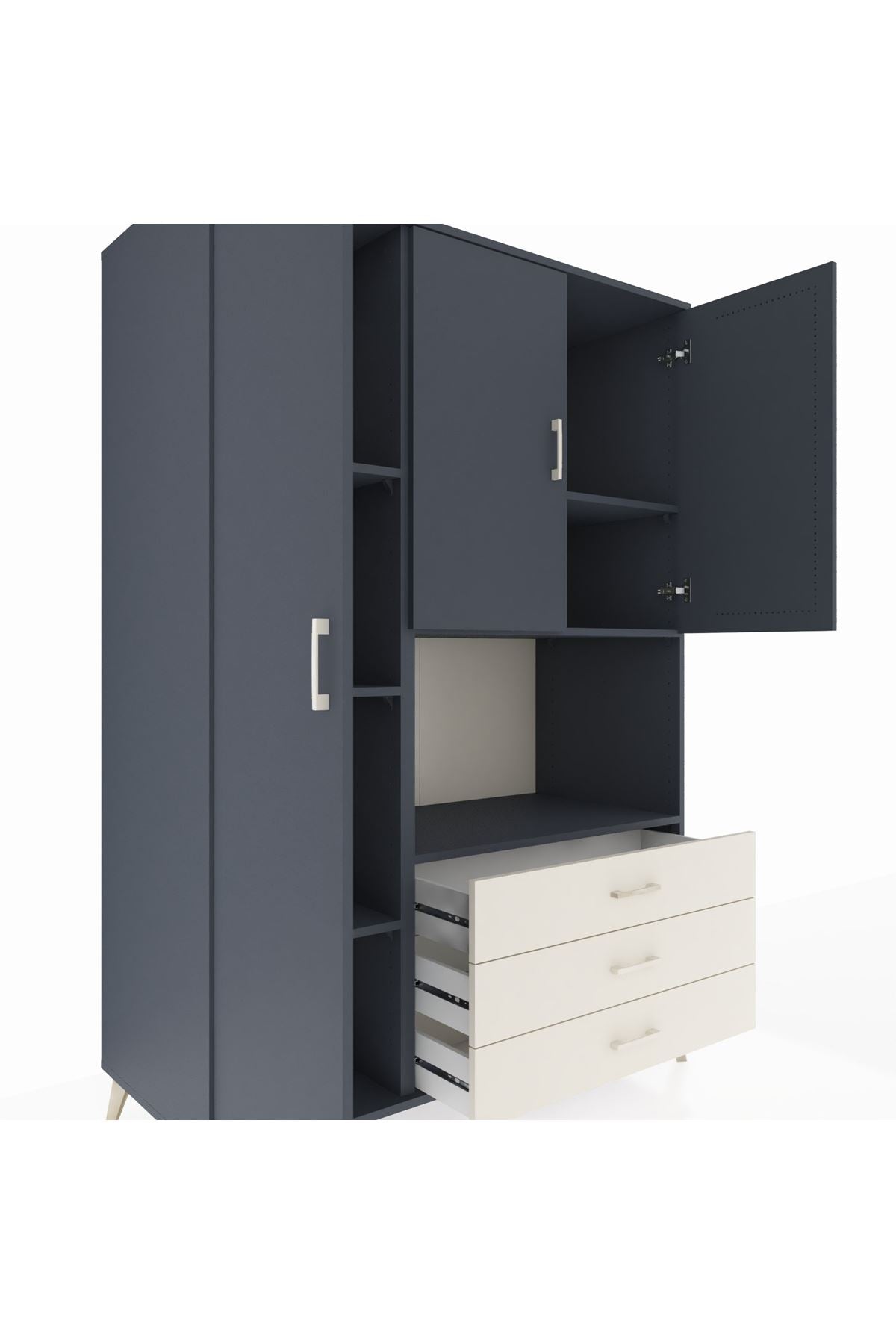 132 cm genişlik, 59 cm derinlik ve 195 cm yüksekliğiyle birçok farklı kullanım alanına hitap eder Antrasit gövde ve antrasit/aytaşı kapak birleşimiyle estetik ve güçlü bir duruş sergiler Üç kapaklı, altı raflı ve üç çekmeceli tasarımıyla tüm eşyalarınız için maksimum depolama alanı sunar 📚🧦