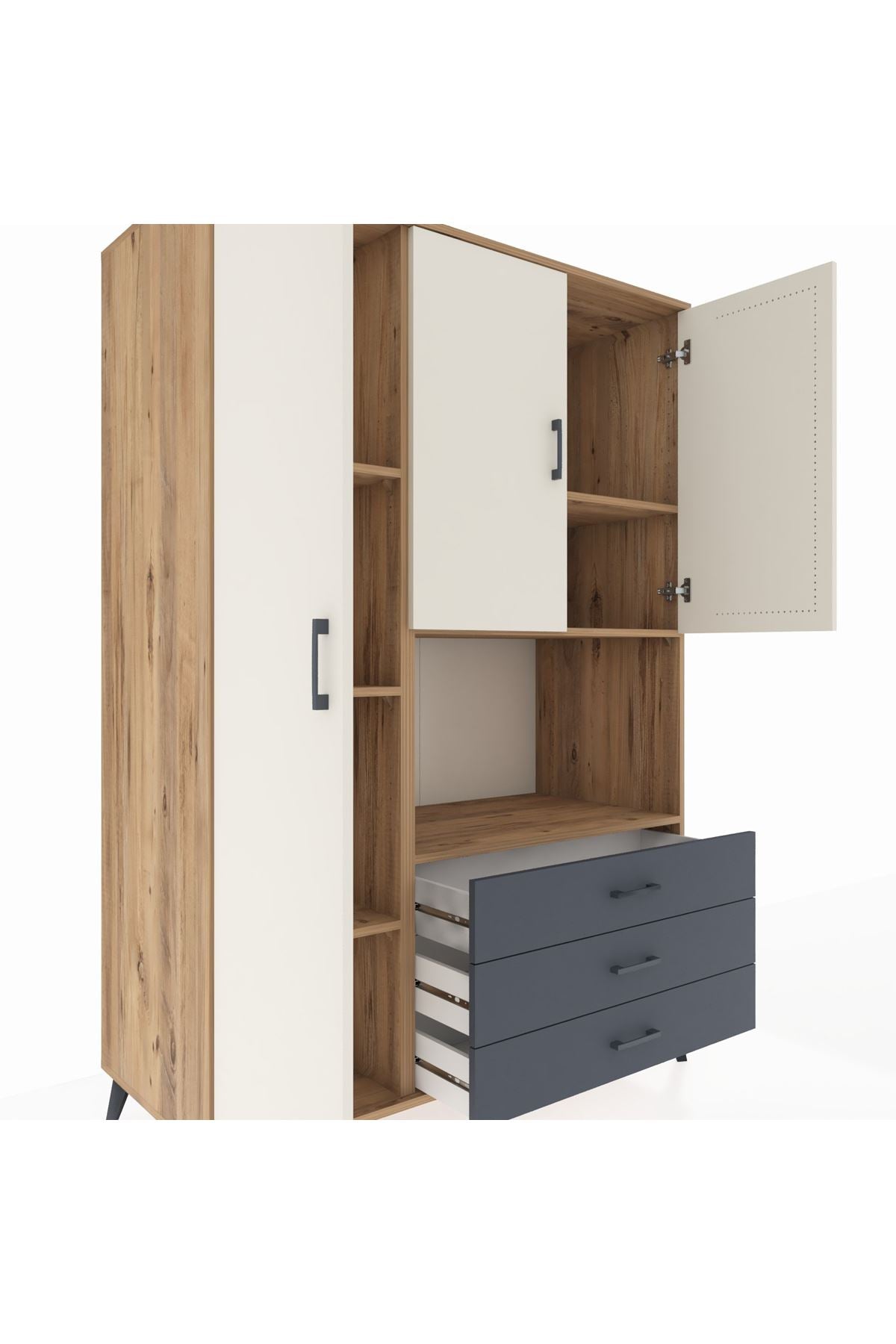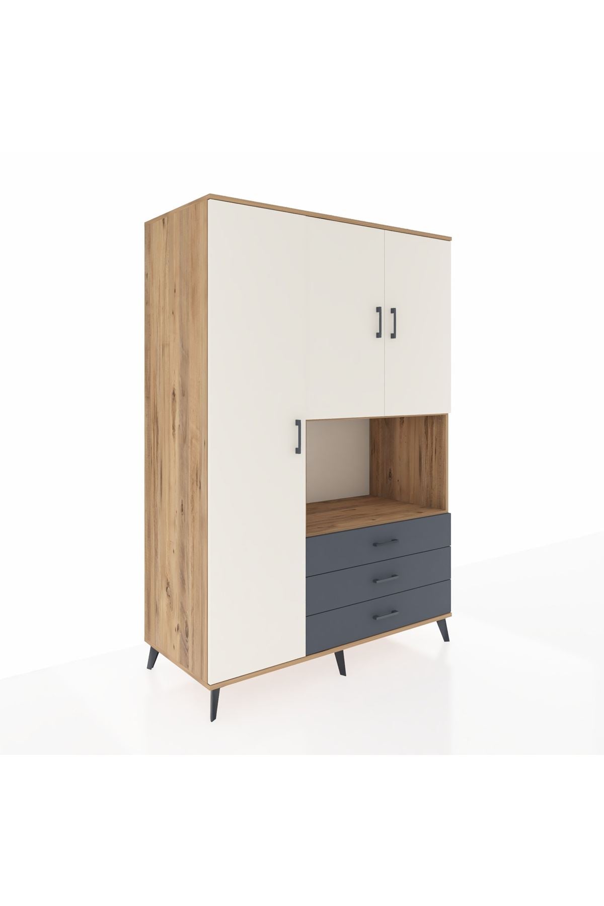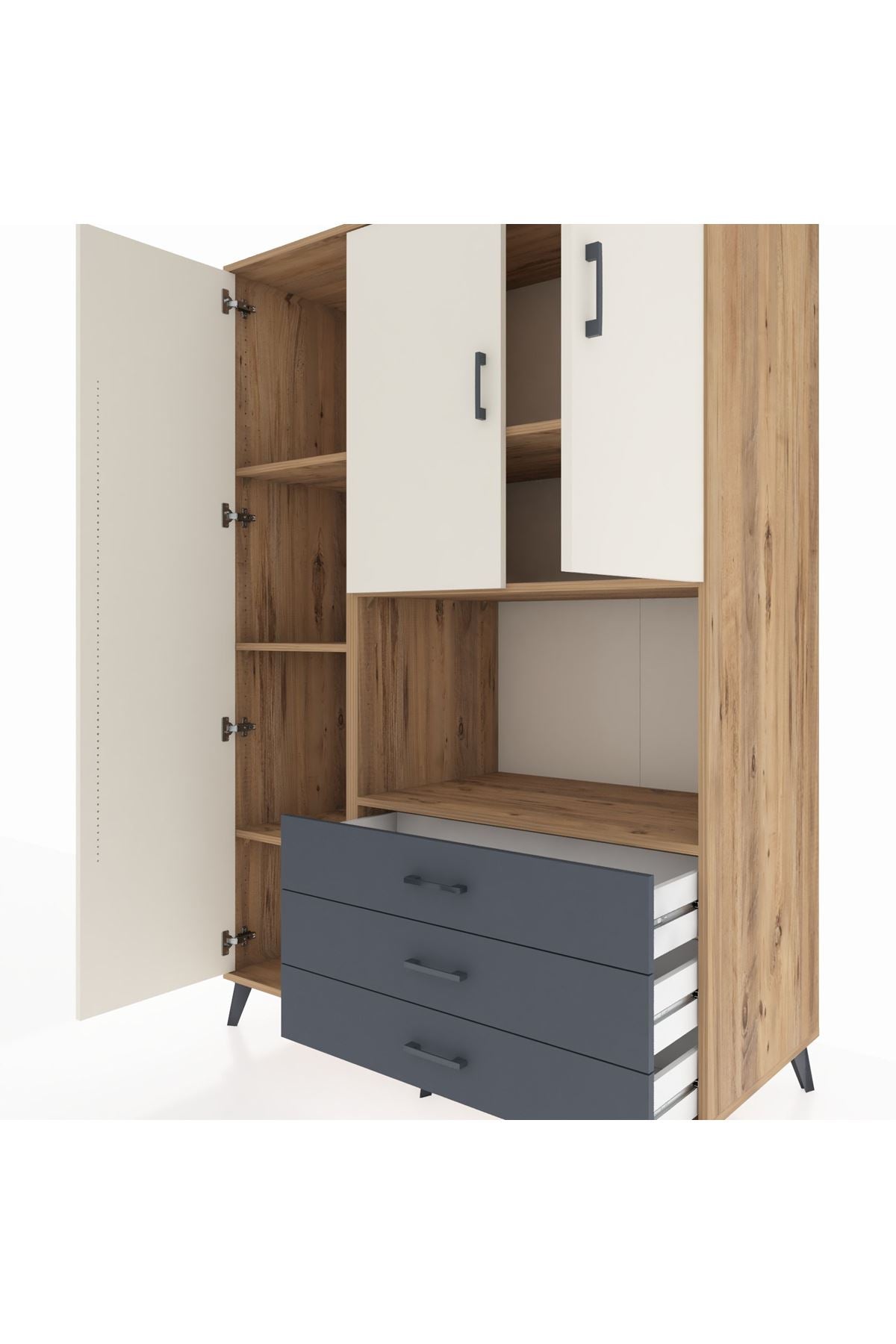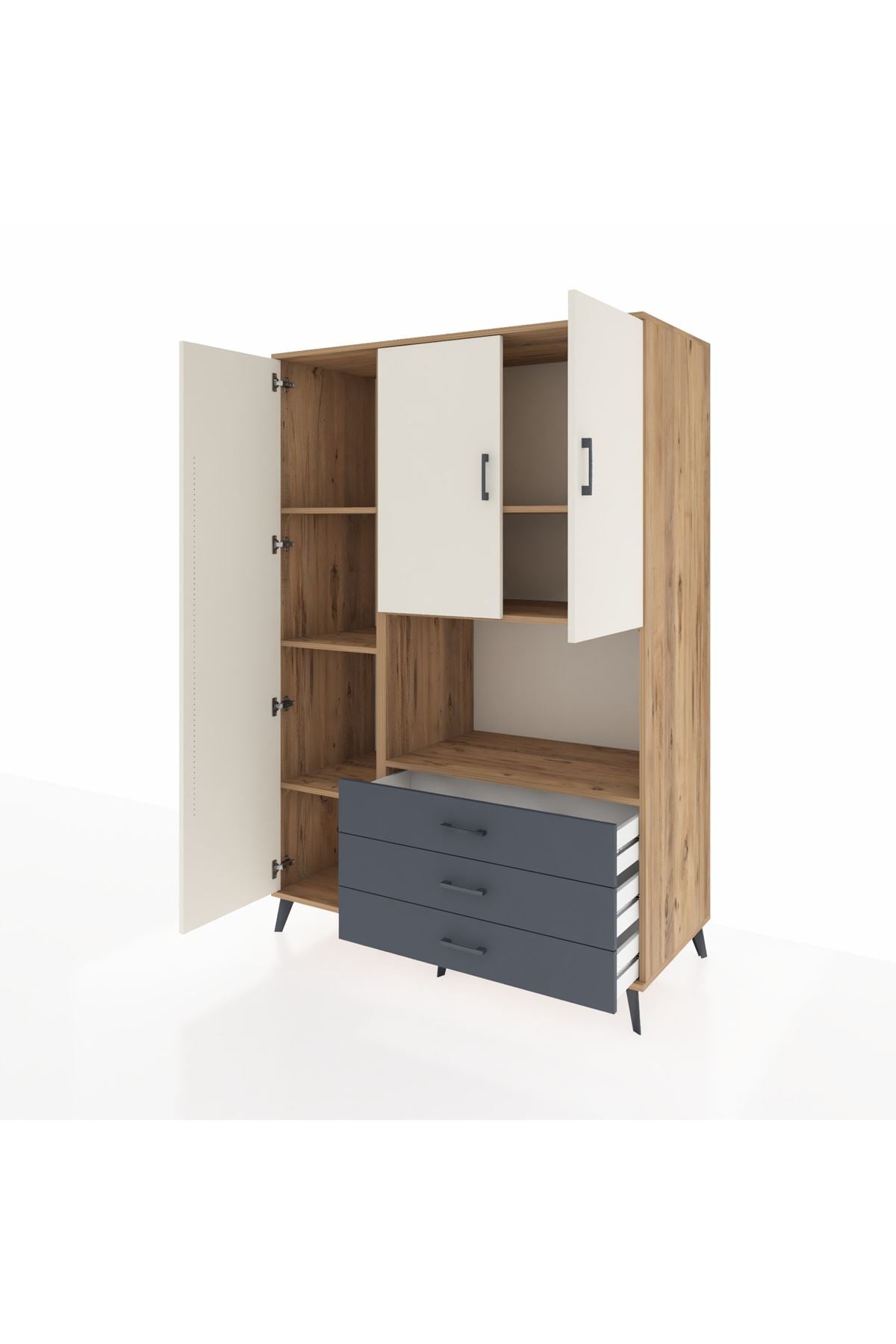 Toplam 6 geniş rafı, 3 fonksiyonel çekmecesi ve 3 kapaklı yapısı ile eşyalarınızı kolayca organize edebilirsiniz 📚 195 cm yüksekliği ve 132 cm genişliği ile hem büyük hem de kompakt bir depolama çözümüdür Robot süpürge uyumlu ayak yüksekliği sayesinde temizlik artık çok daha pratik 🤖