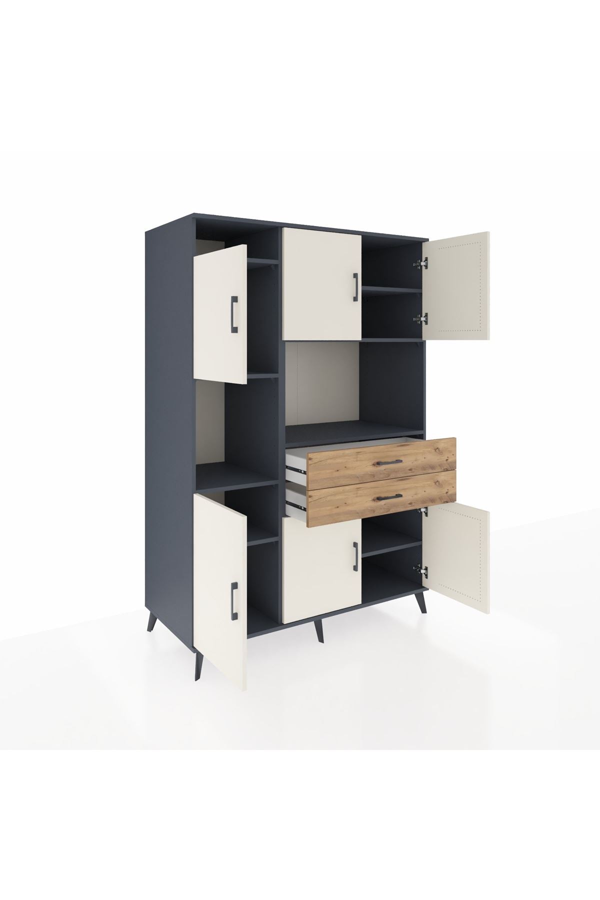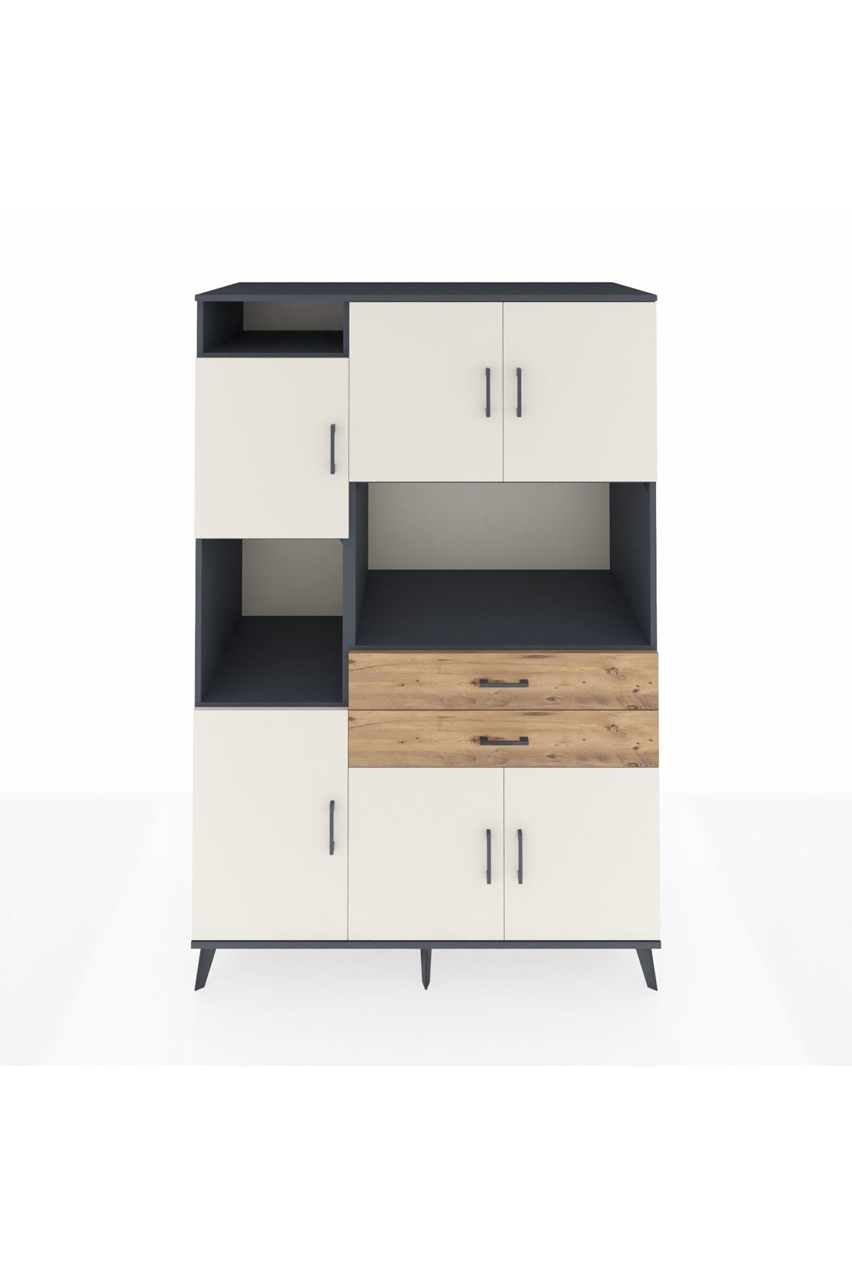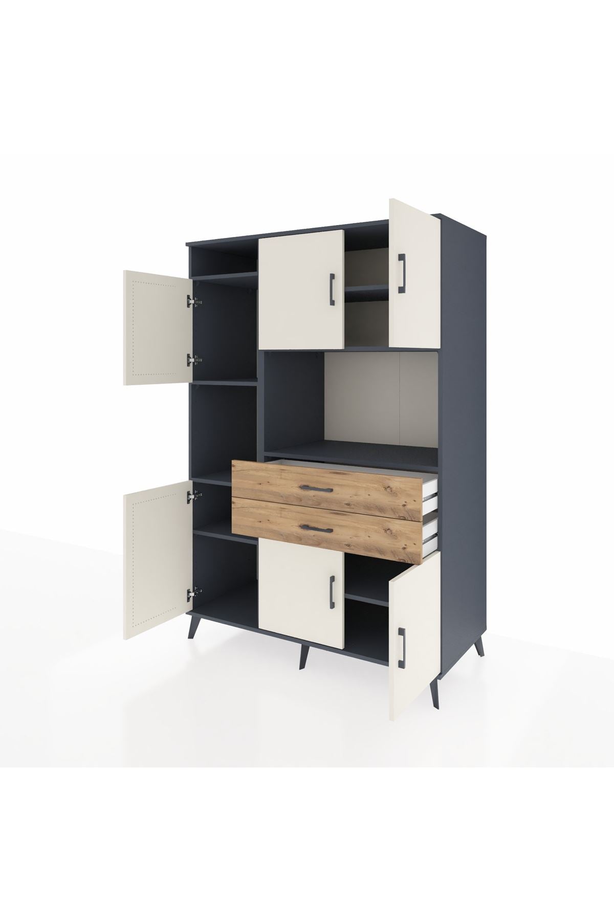 Fonksiyonellik ve zarafeti bir arada arayanlar için tasarlanan bu çok amaçlı dolap, modern yaşam alanlarınıza pratiklik ve şıklık katıyor. 8 geniş raf, 2 kullanışlı çekmece ve 6 kapaklı yapısıyla tüm eşyalarınız için ideal bir saklama alanı sunar. Antrasit ve Aytaşı/Çam renk kombinasyonu, her dekorasyona uyum sağlarken, zamansız bir görünüm kazandırır.
